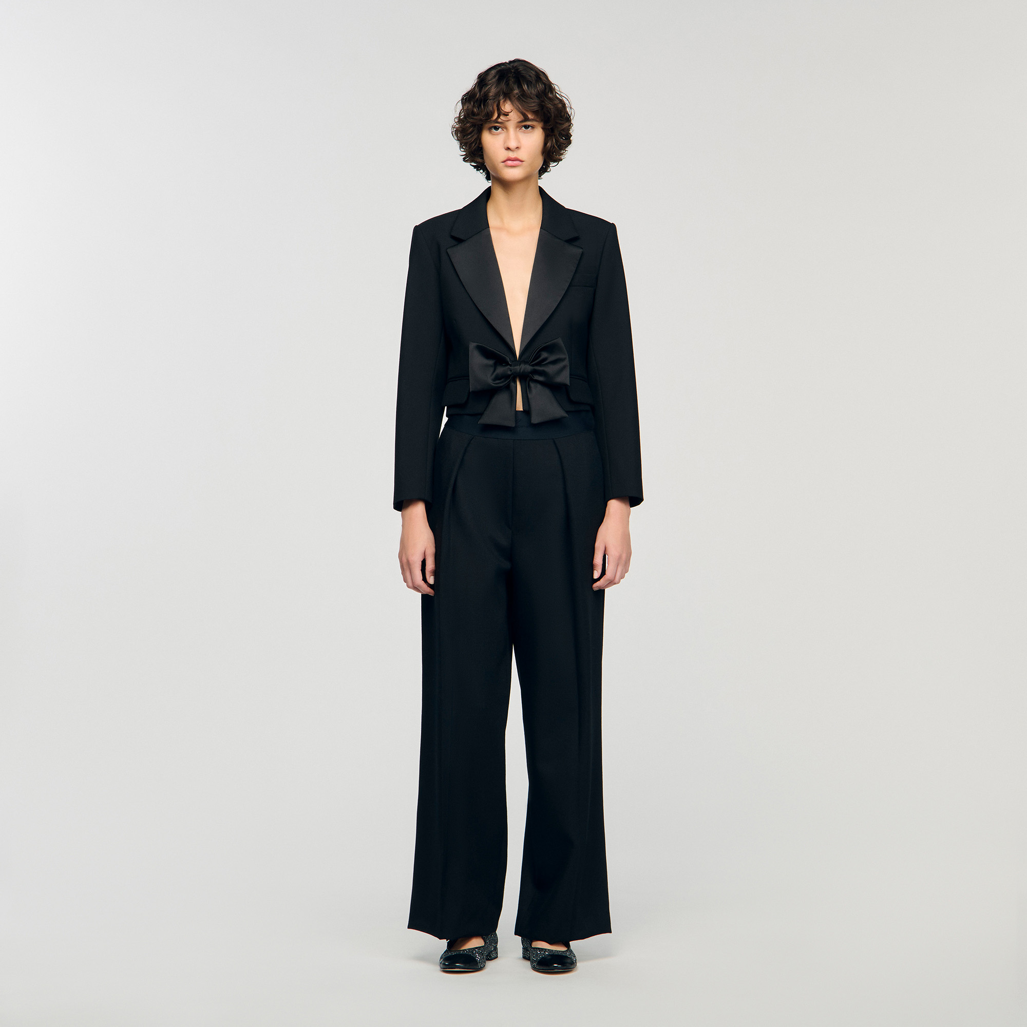 Sandro polyester Cropped spencer-style jacket featuring a wide lapel collar with satin-effect revers, long sleeves and adorned with a large bow.