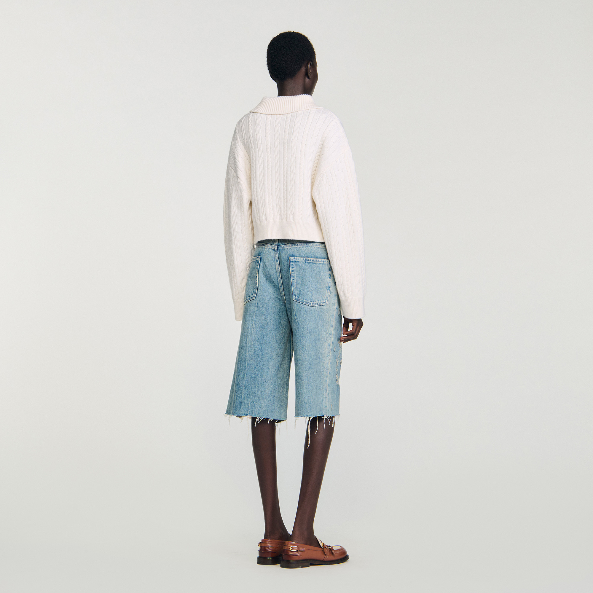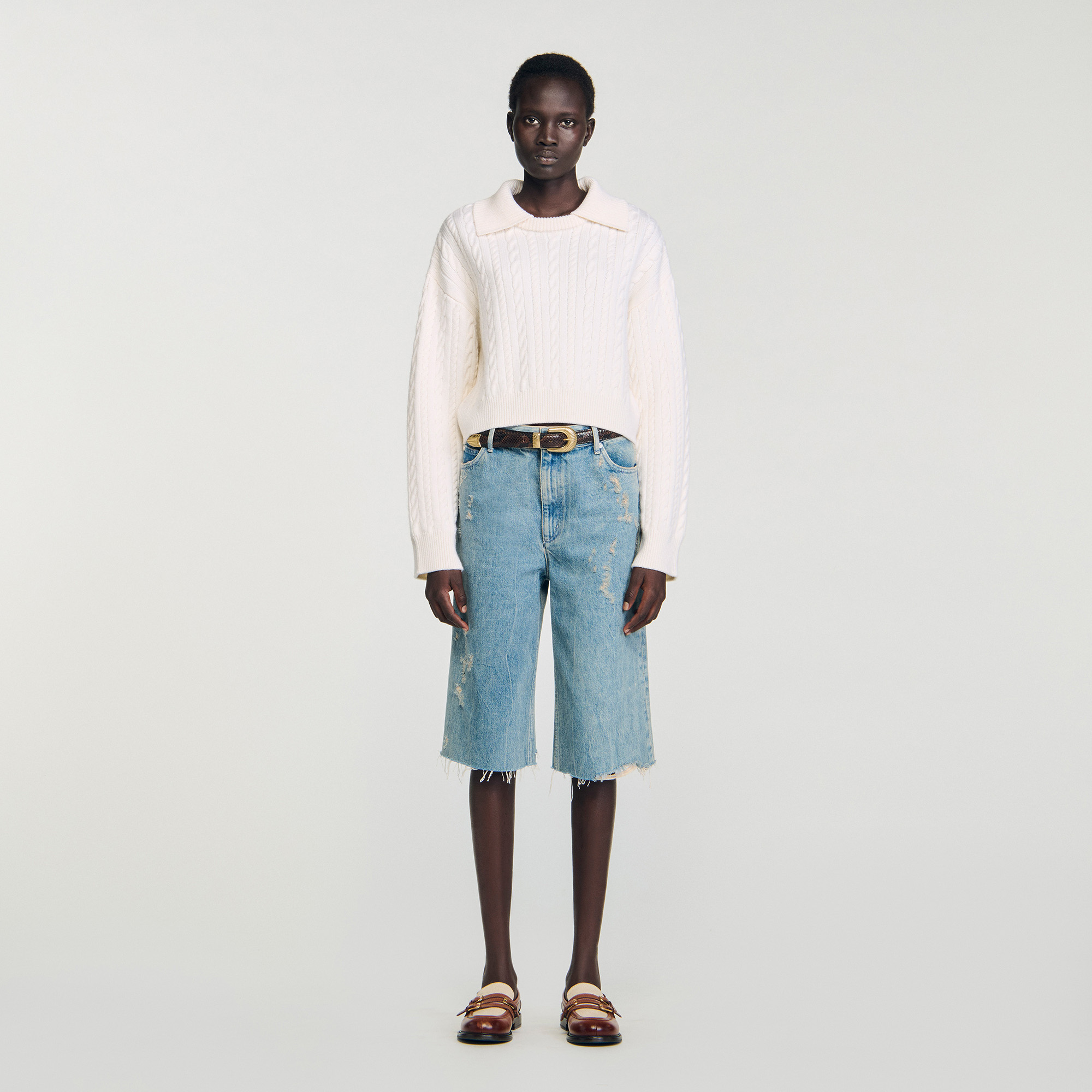Sandro Women's cropped cable knit sweater Sailor collar Long cable-knit sleeves Ribbed cuffs and hem True to size.