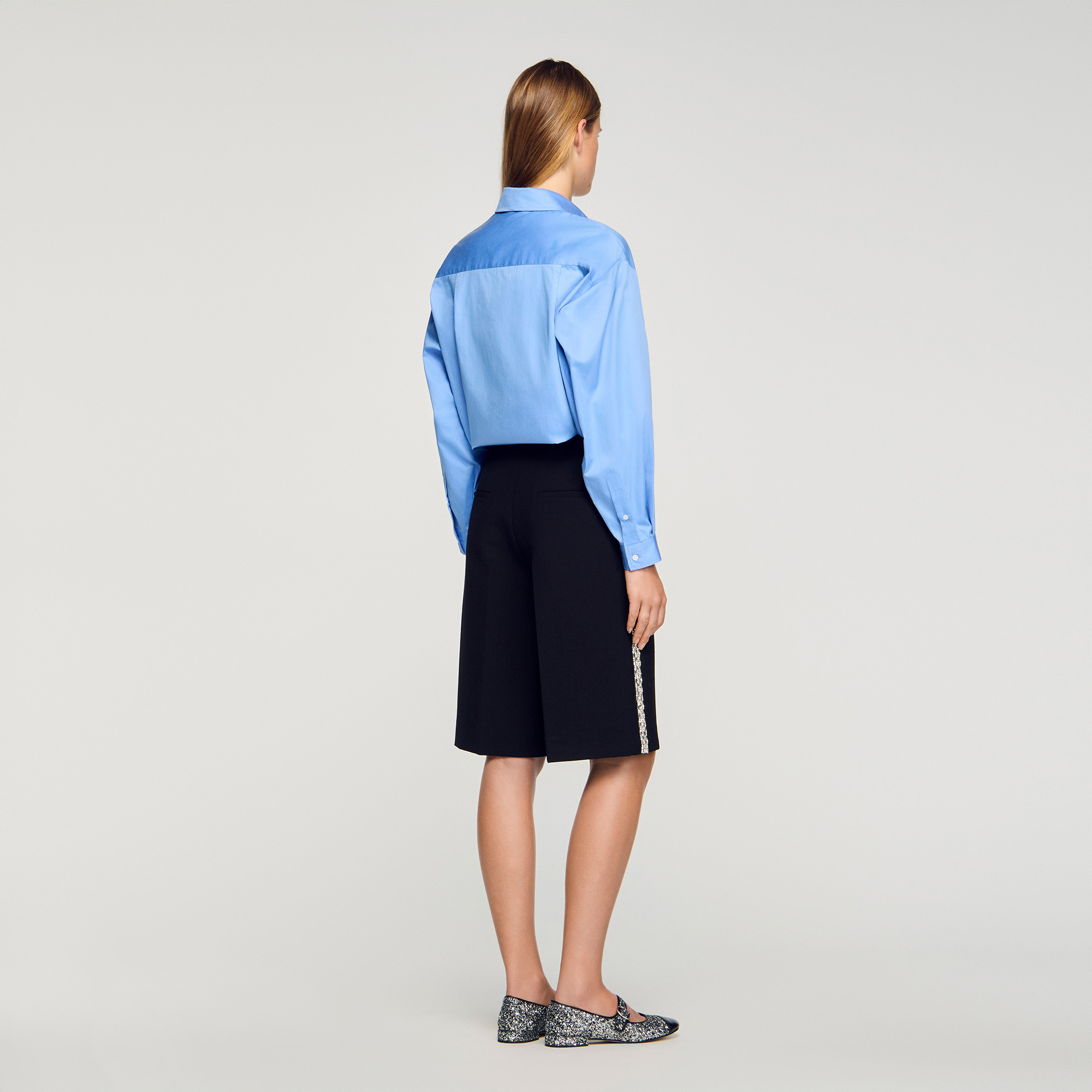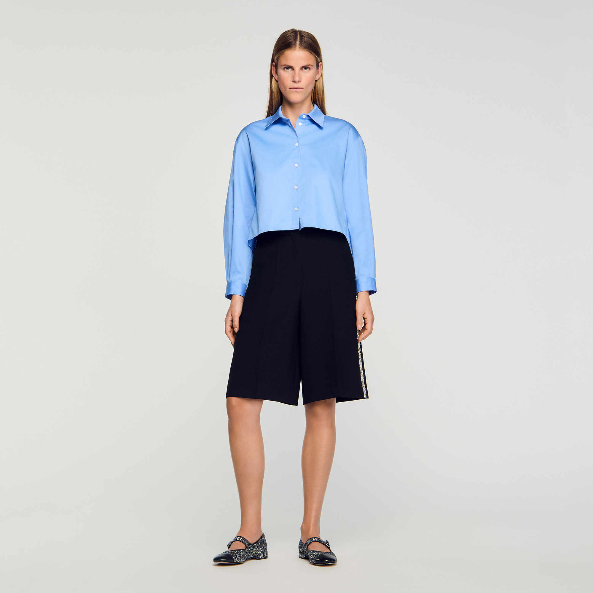 Sandro polyester Straight-leg Bermuda shorts with rhinestone stripe on the sides, featuring a buttoned tab fastening and zip fly.