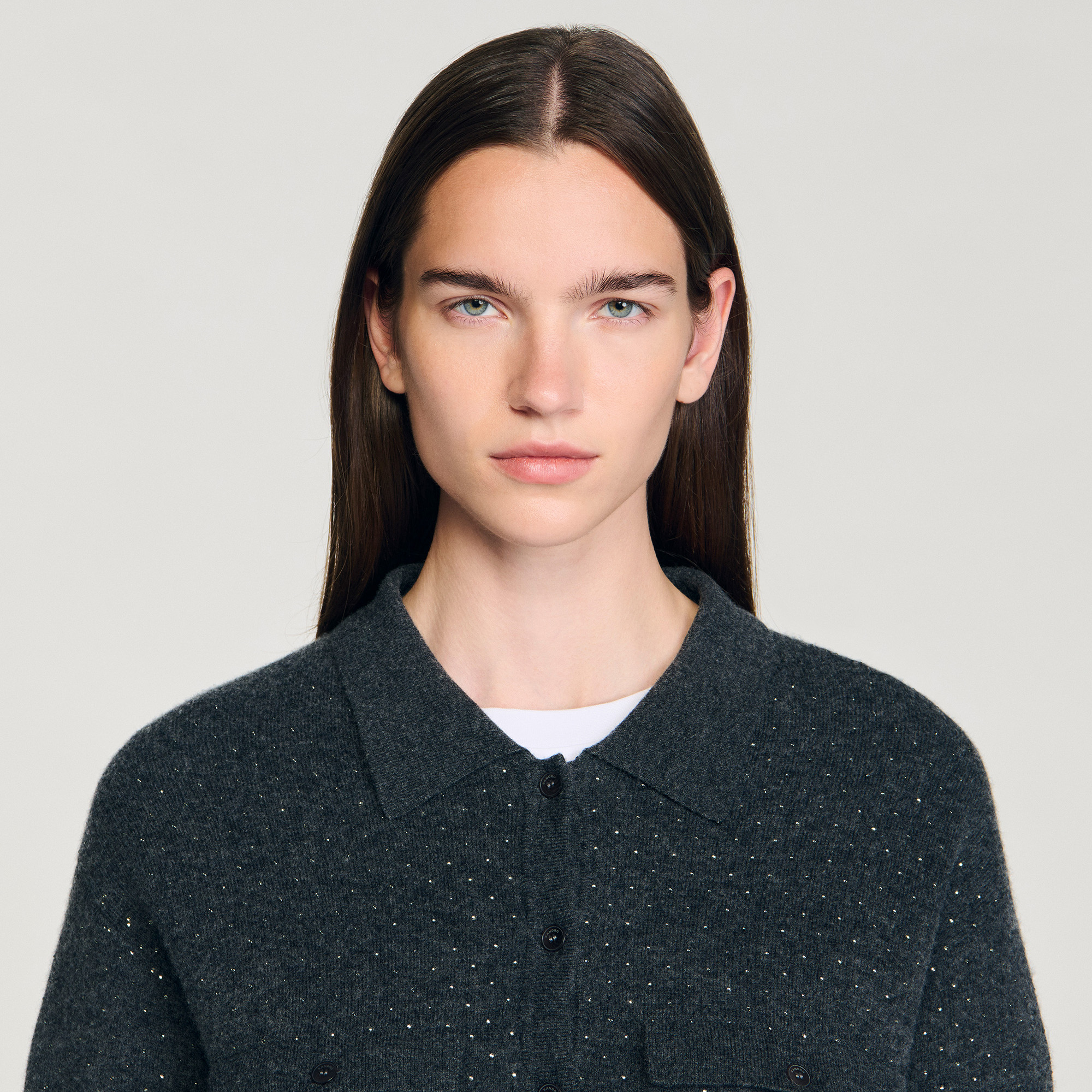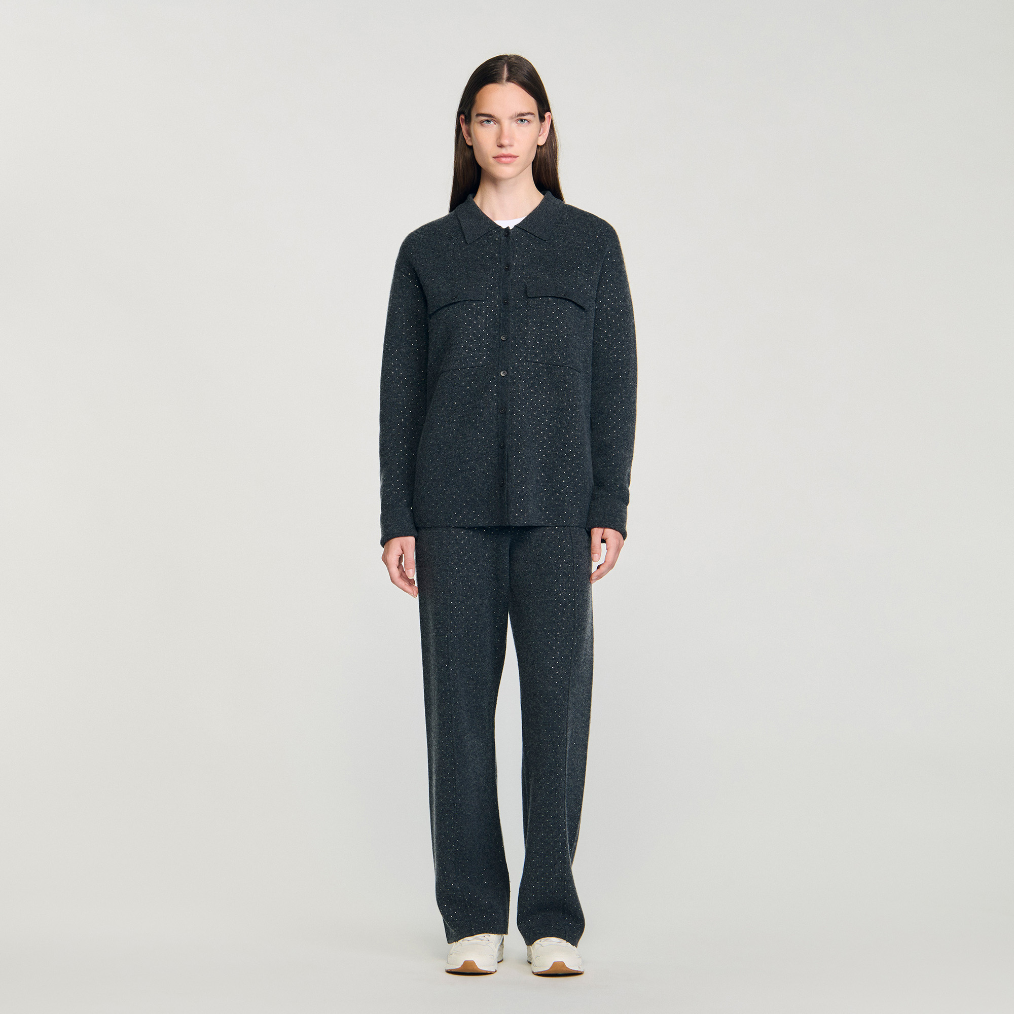 Sandro viscose Long shirt-style cardigan with rhinestones, featuring a shirt collar, long sleeves and a button placket fastening.