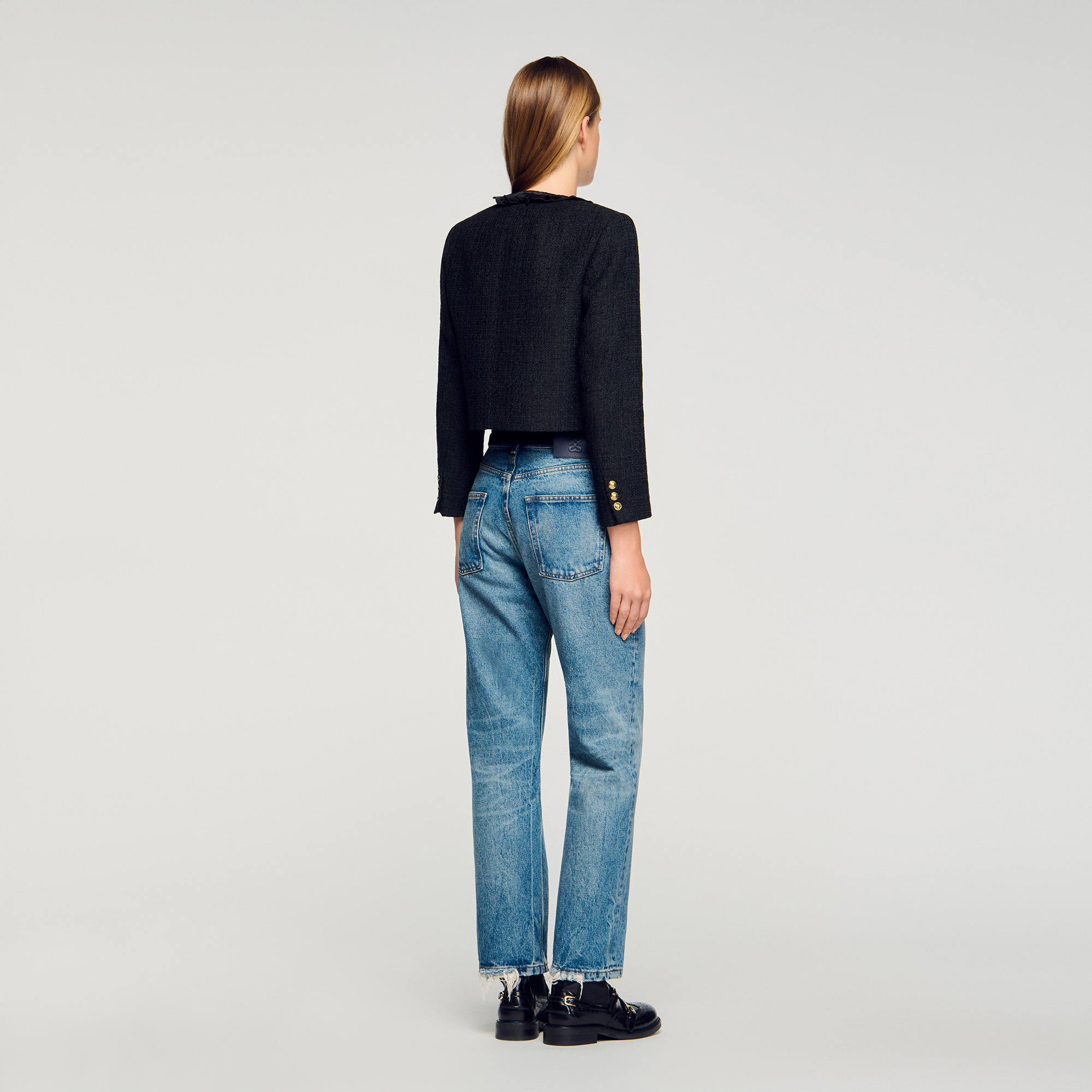Sandro Women's tweed jacket Round collar with ruffle Two patch pockets with ruffles Front button fastening Long sleeves True to size.