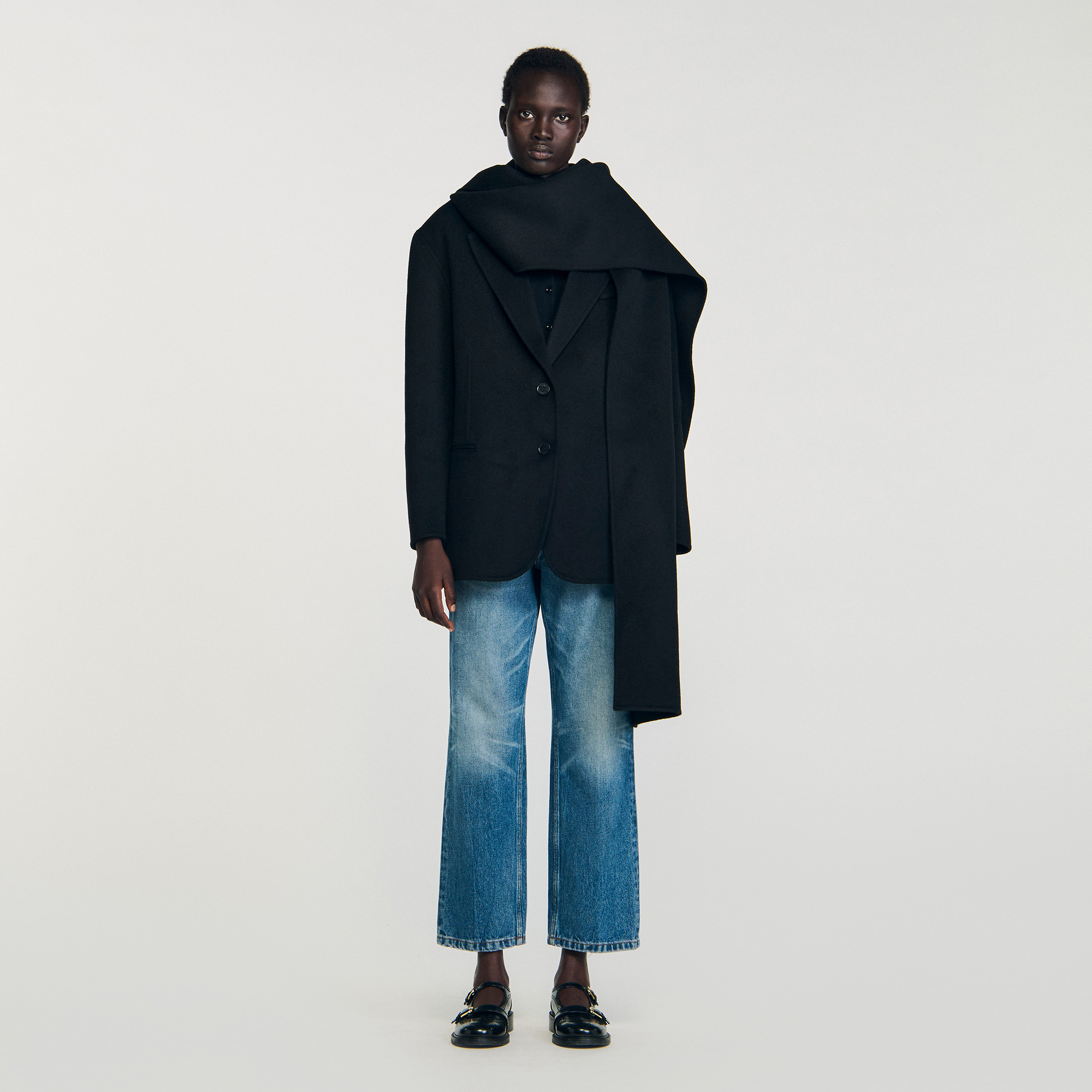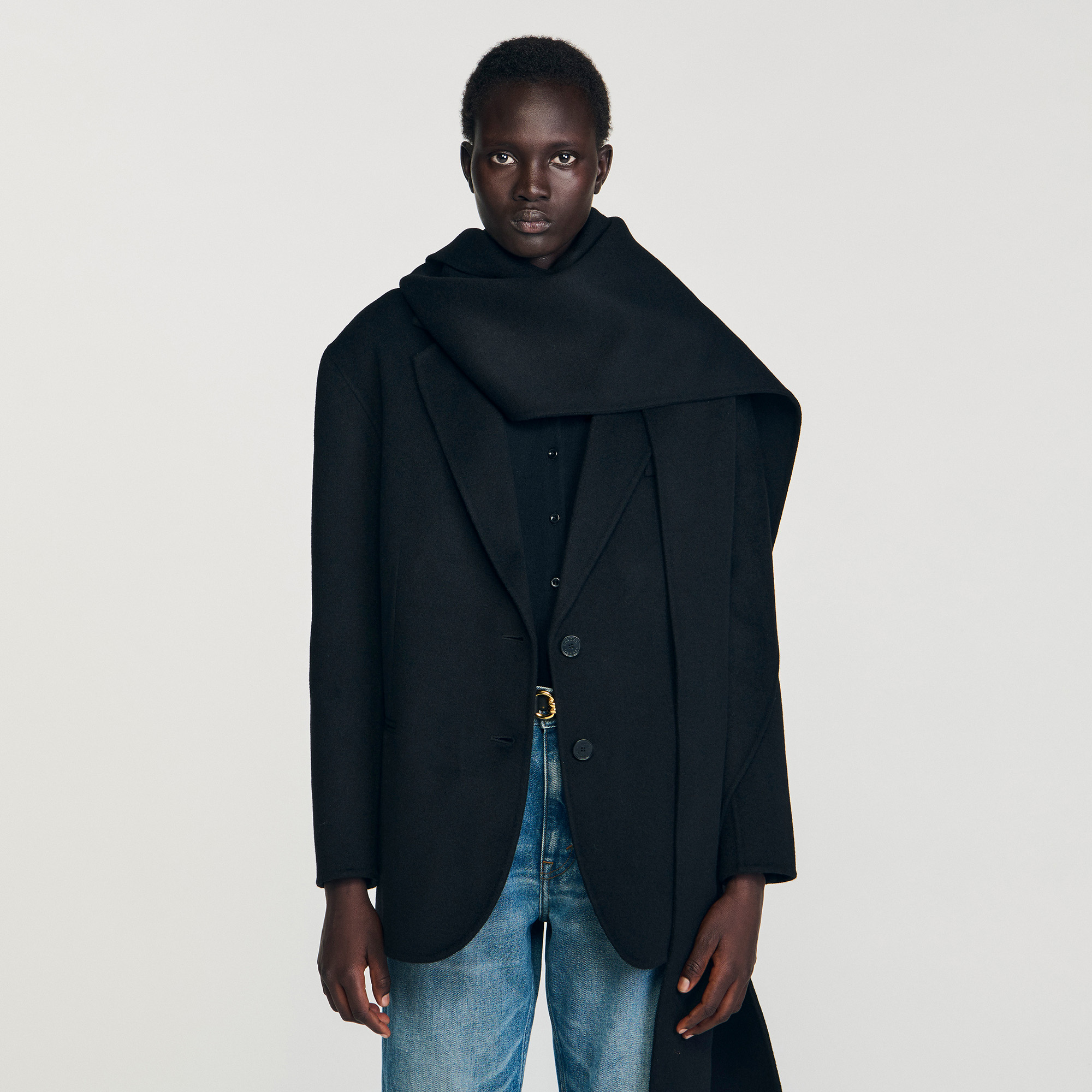 Sandro wool Double-faced coat with long sleeves and button fastening, featuring a large removable scarf.