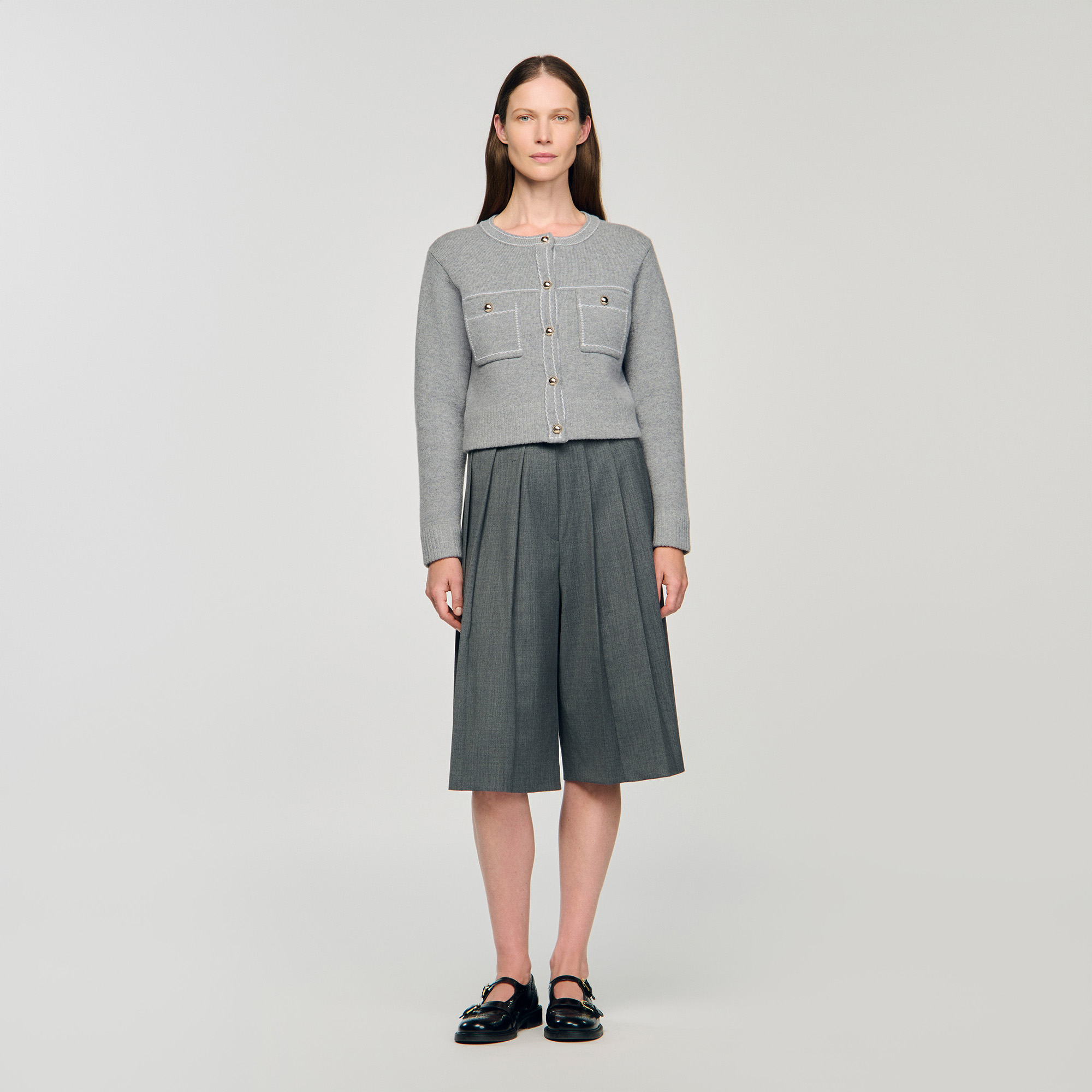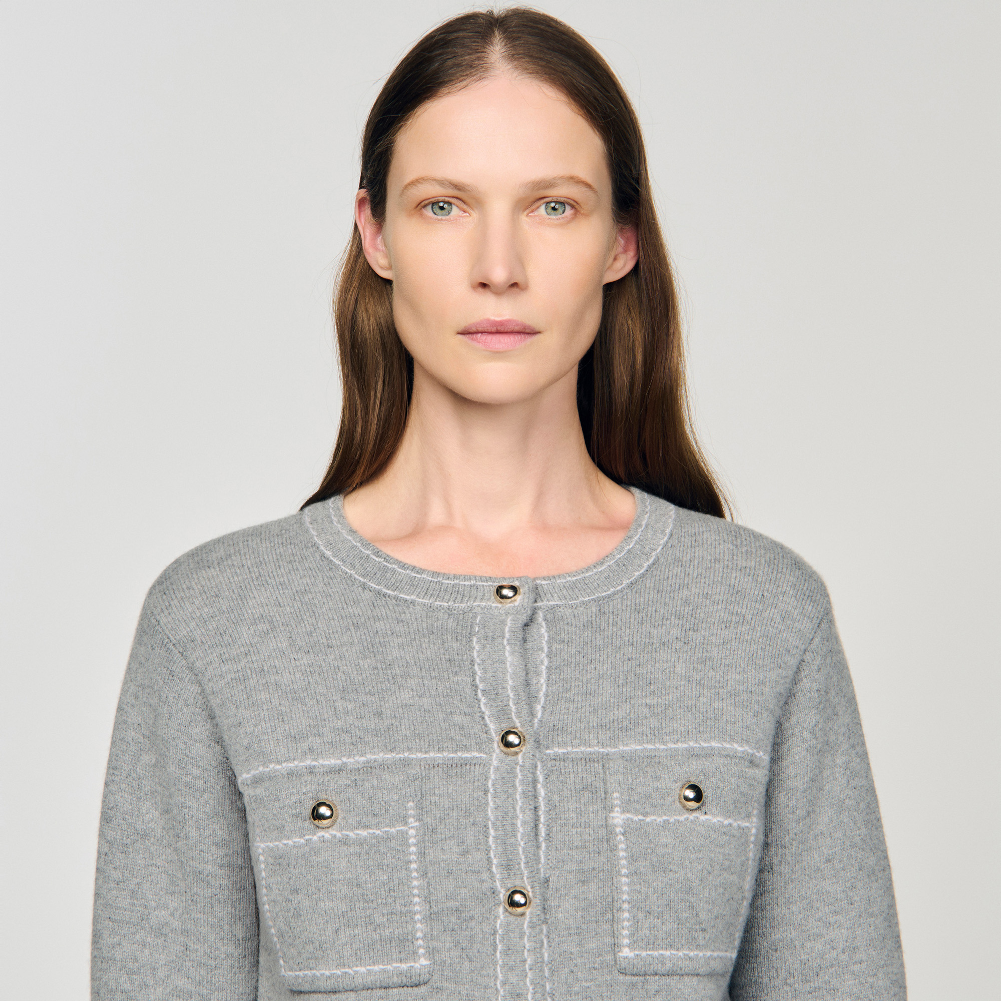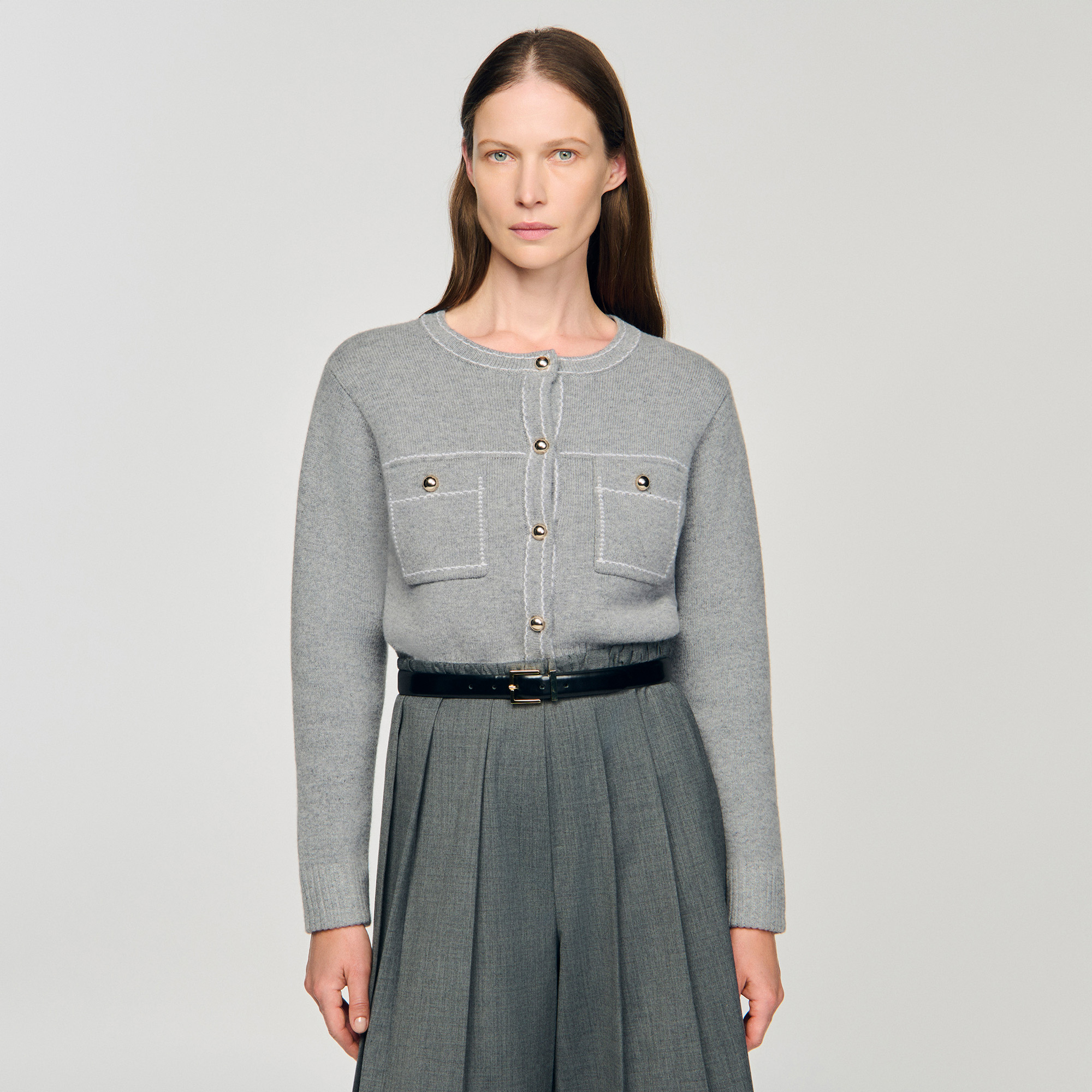 Sandro wool Fine knit cardigan with contrasting topstitching, featuring a round neck, long sleeves, button fastening with decorative buttons and patch pockets.