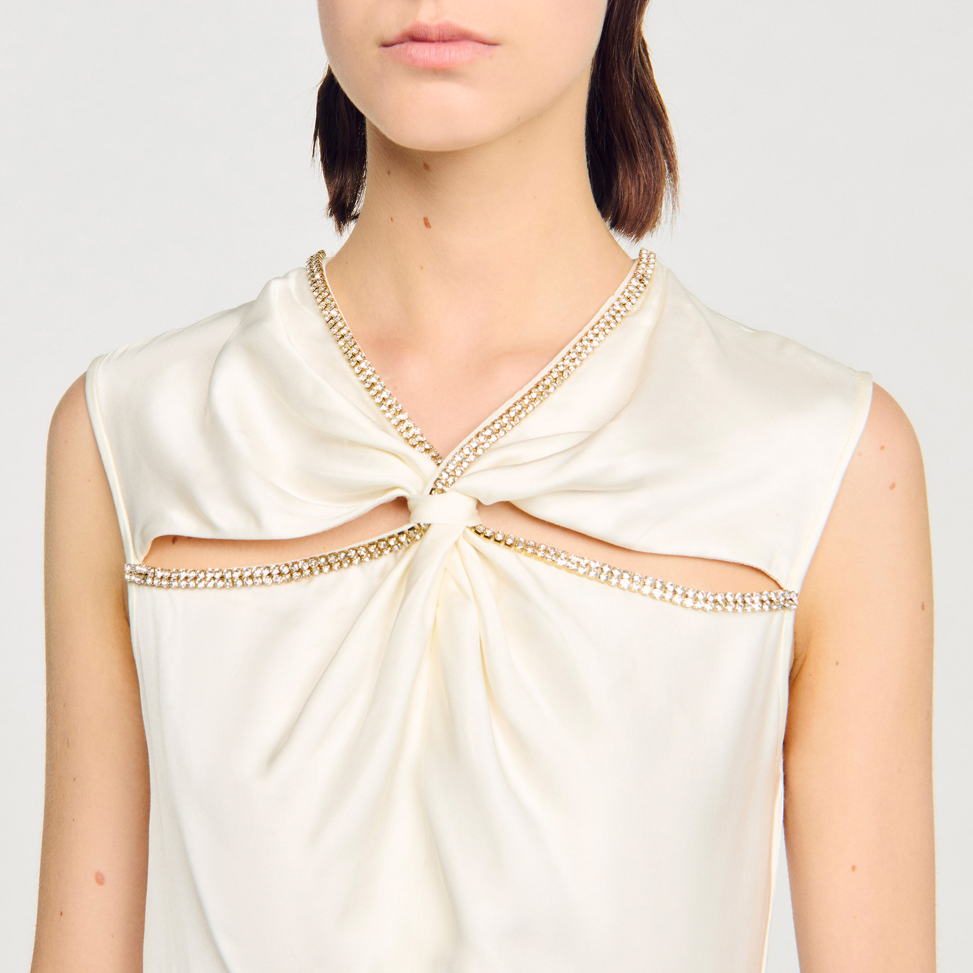Sandro viscose Maxi, flowy satin-effect dress with a crossover neckline and openwork adorned with a rhinestone trim.