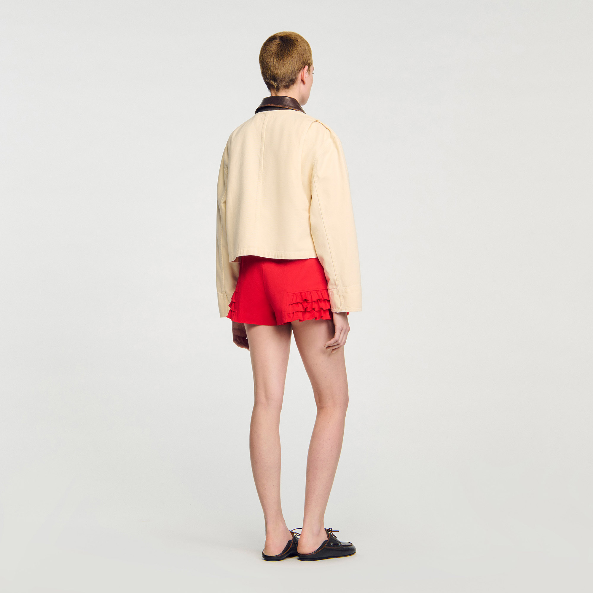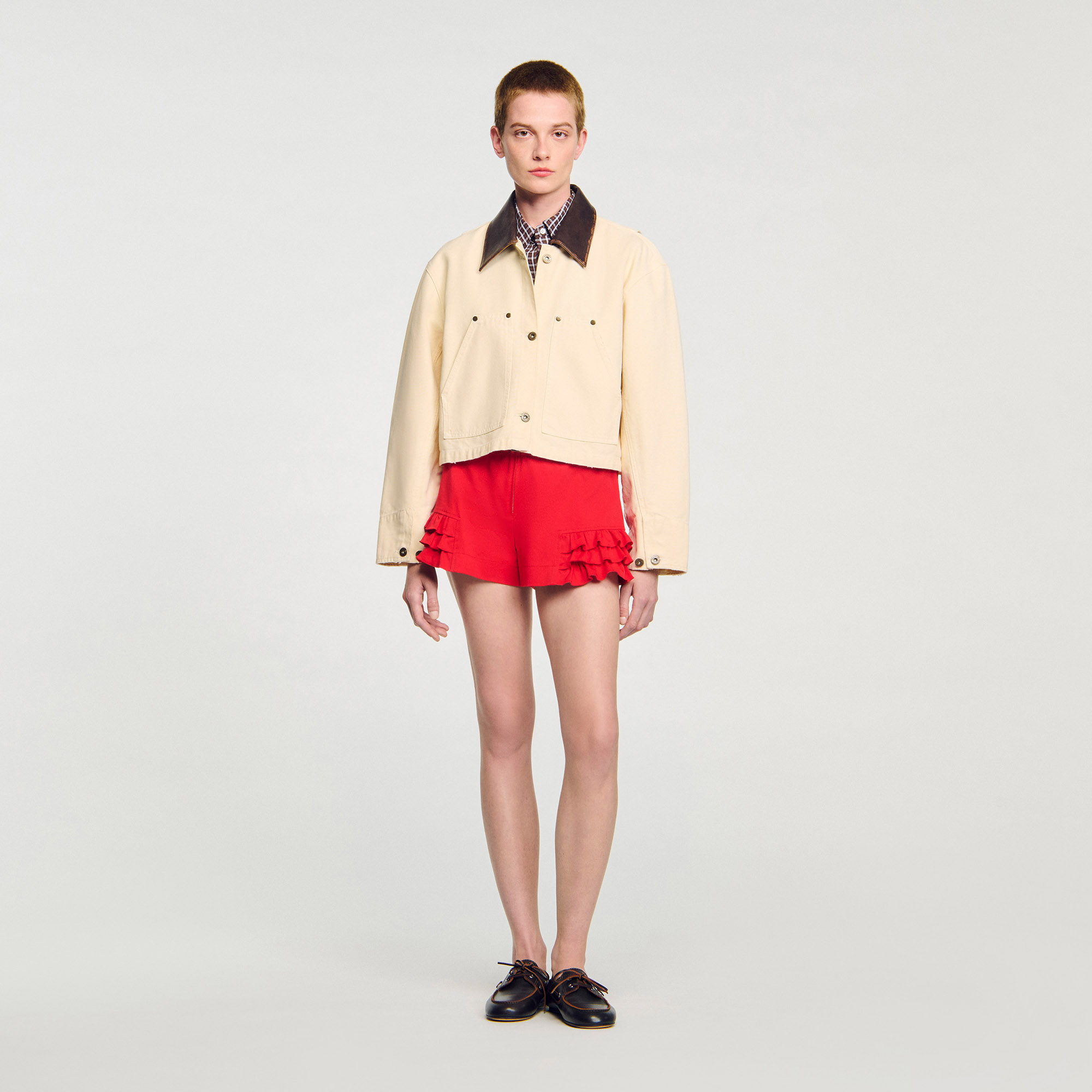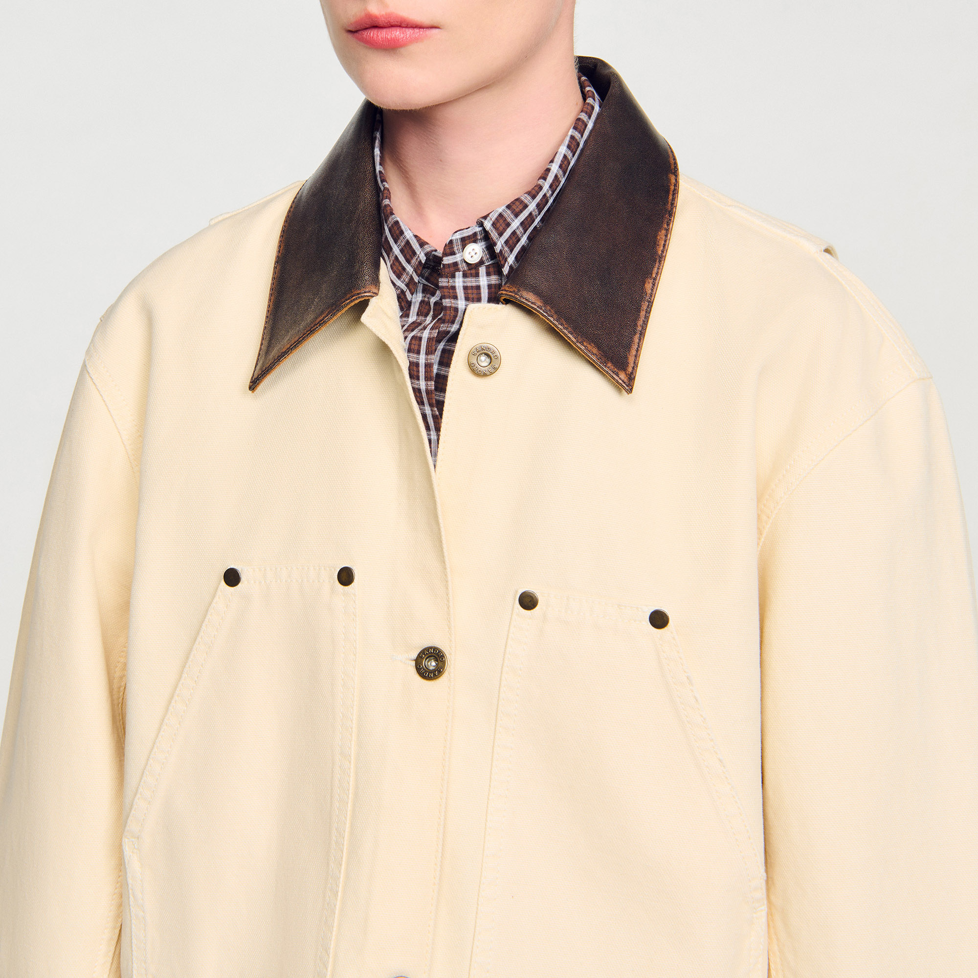 Sandro Women's workwear cotton jacket Contrasting lamb leather collar Button fastening Long sleeves with buttoned cuffs Patch pockets with rivets Worn effect finish on the hem.