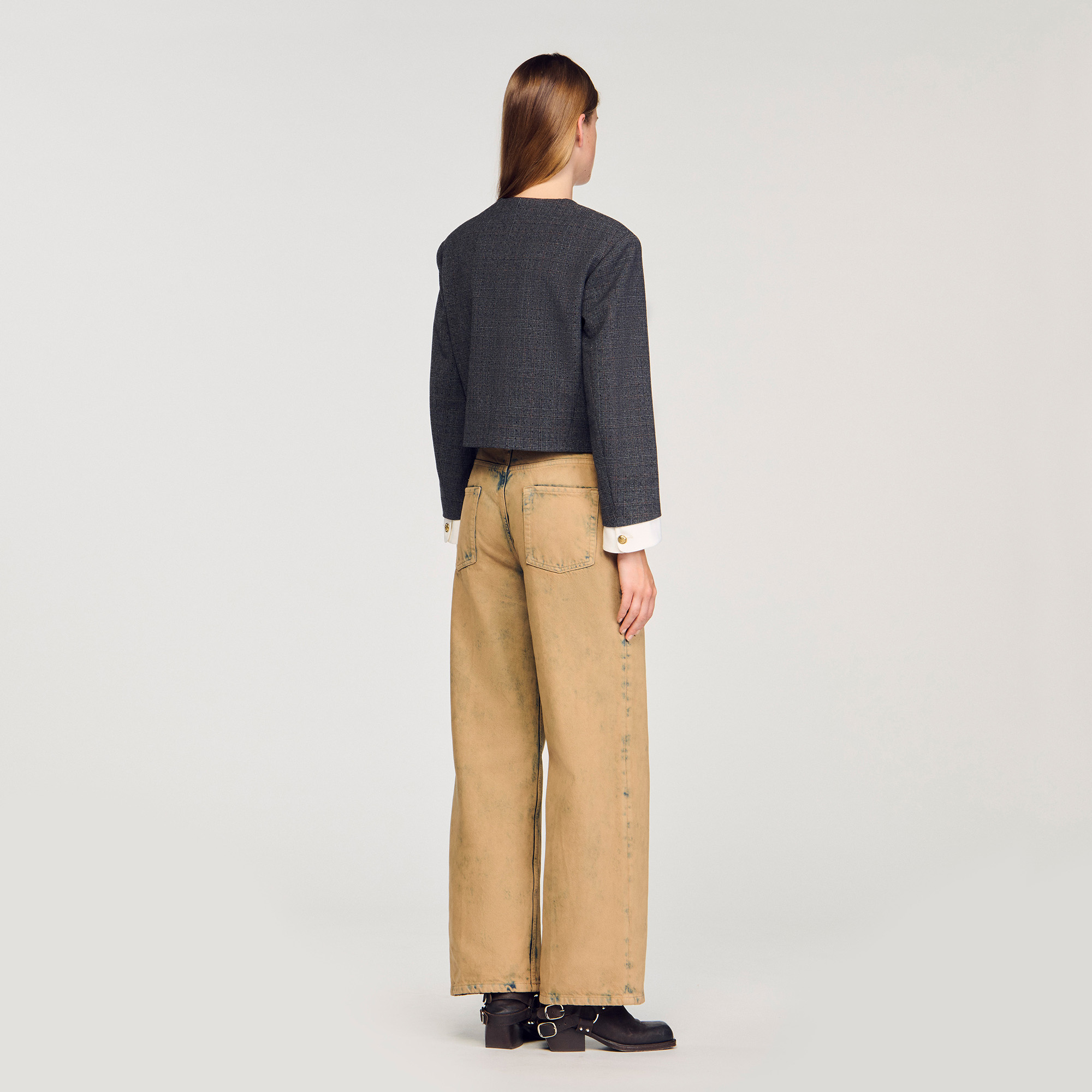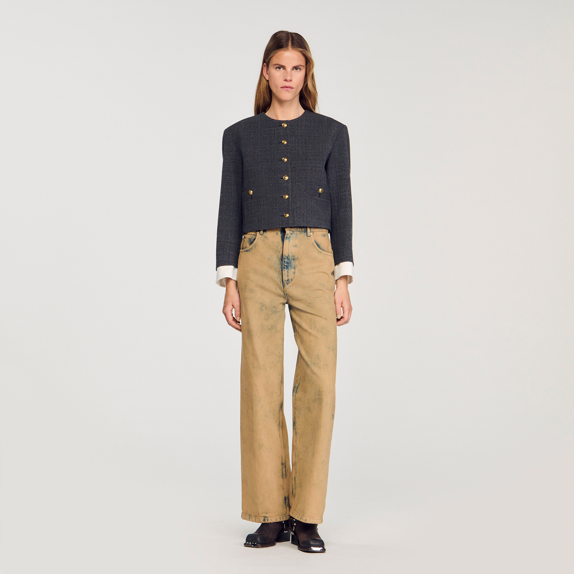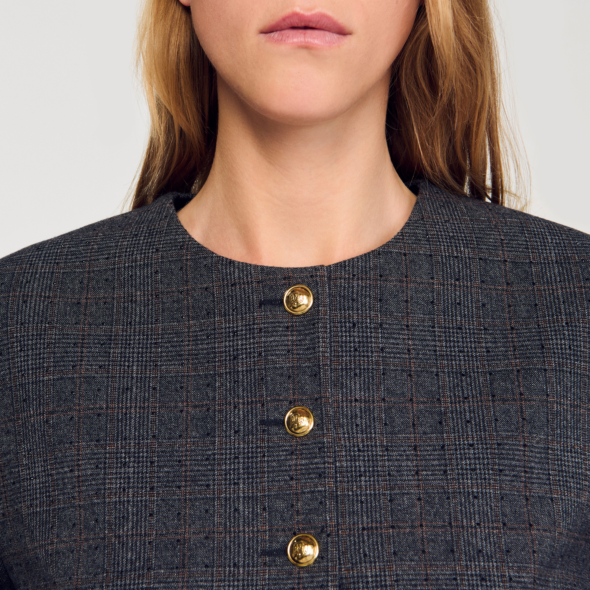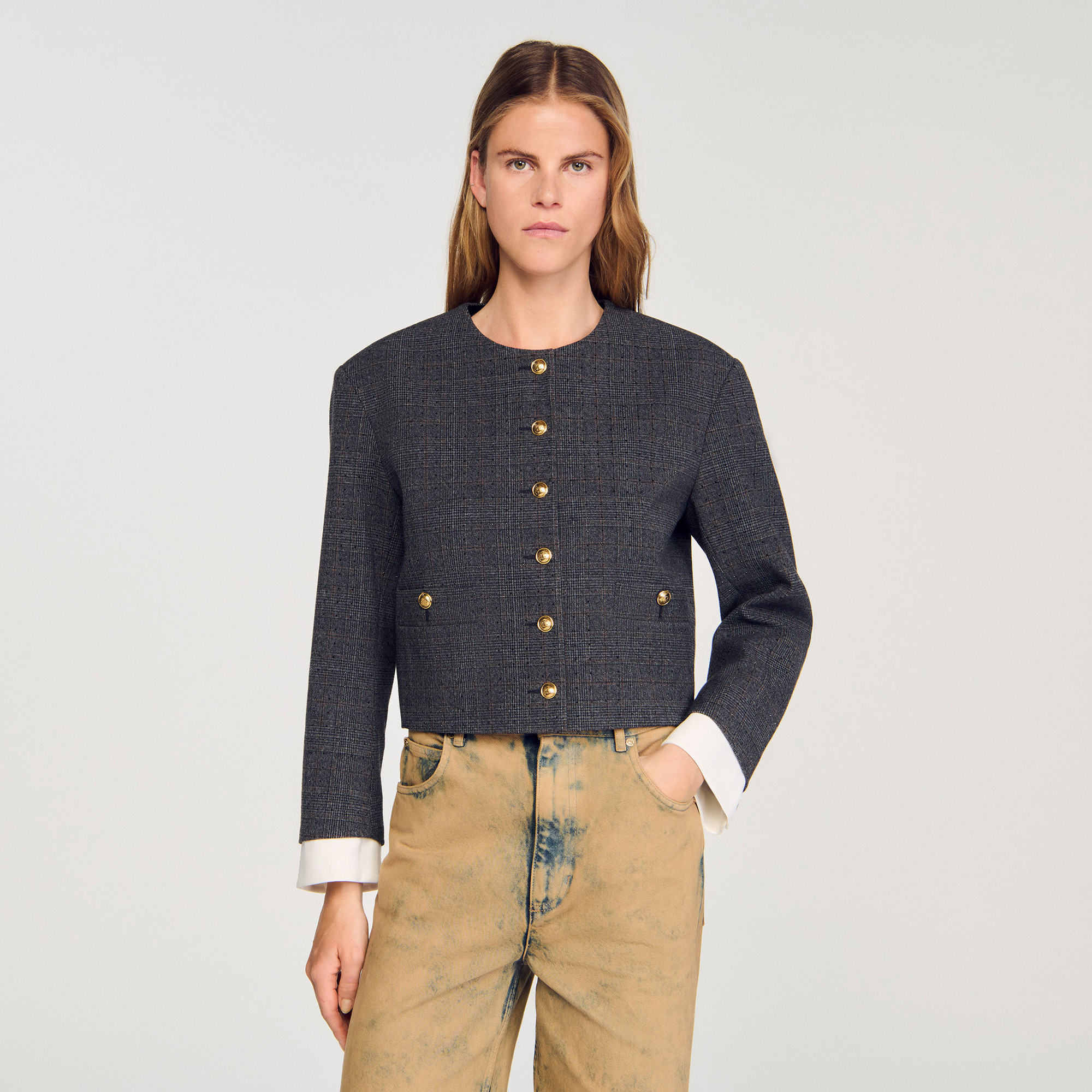 Sandro Women's checked suit jacket with rhinestones Short and structured Long sleeves Round neck Button fastening at the front Large welt pockets with button Removable contrasting cuffs.