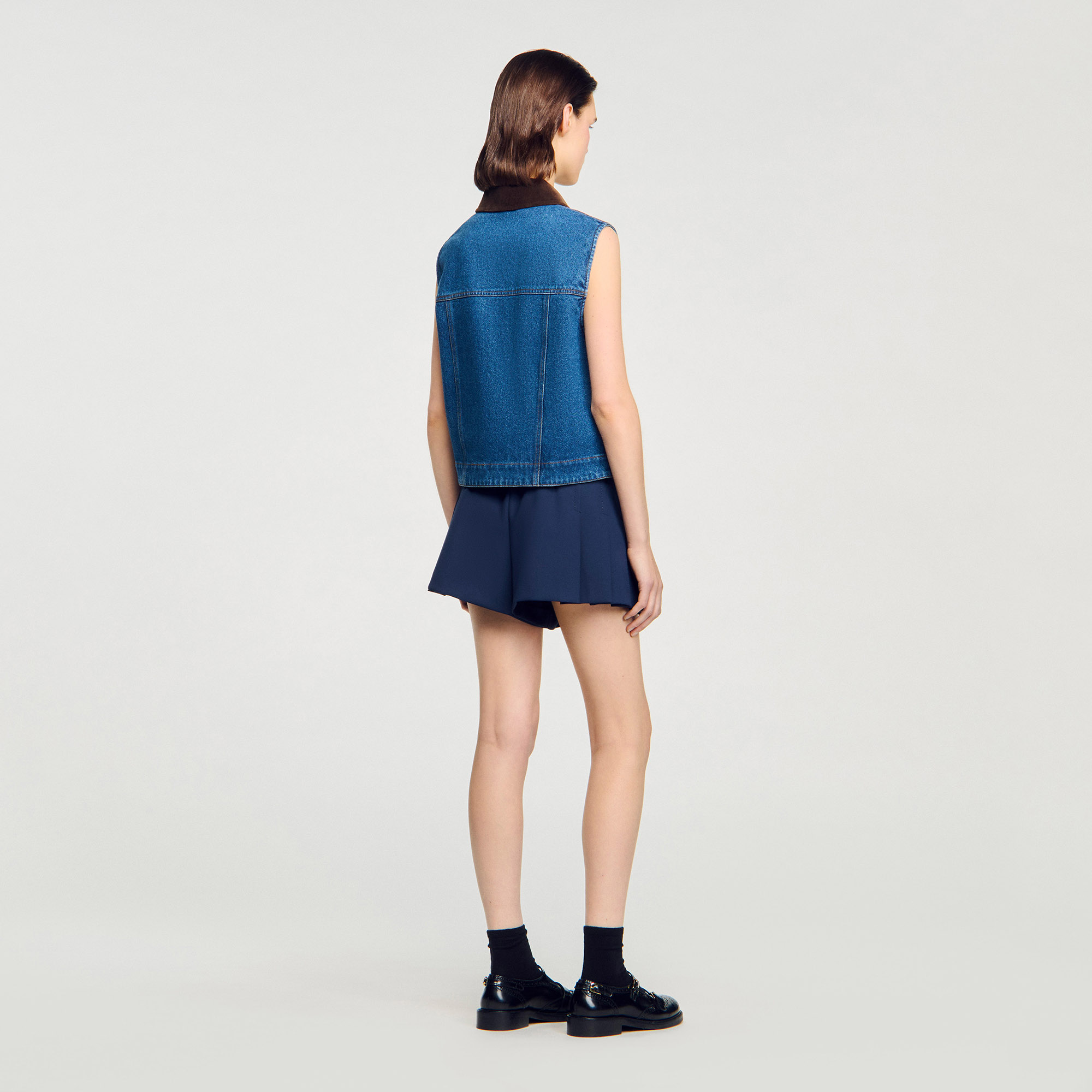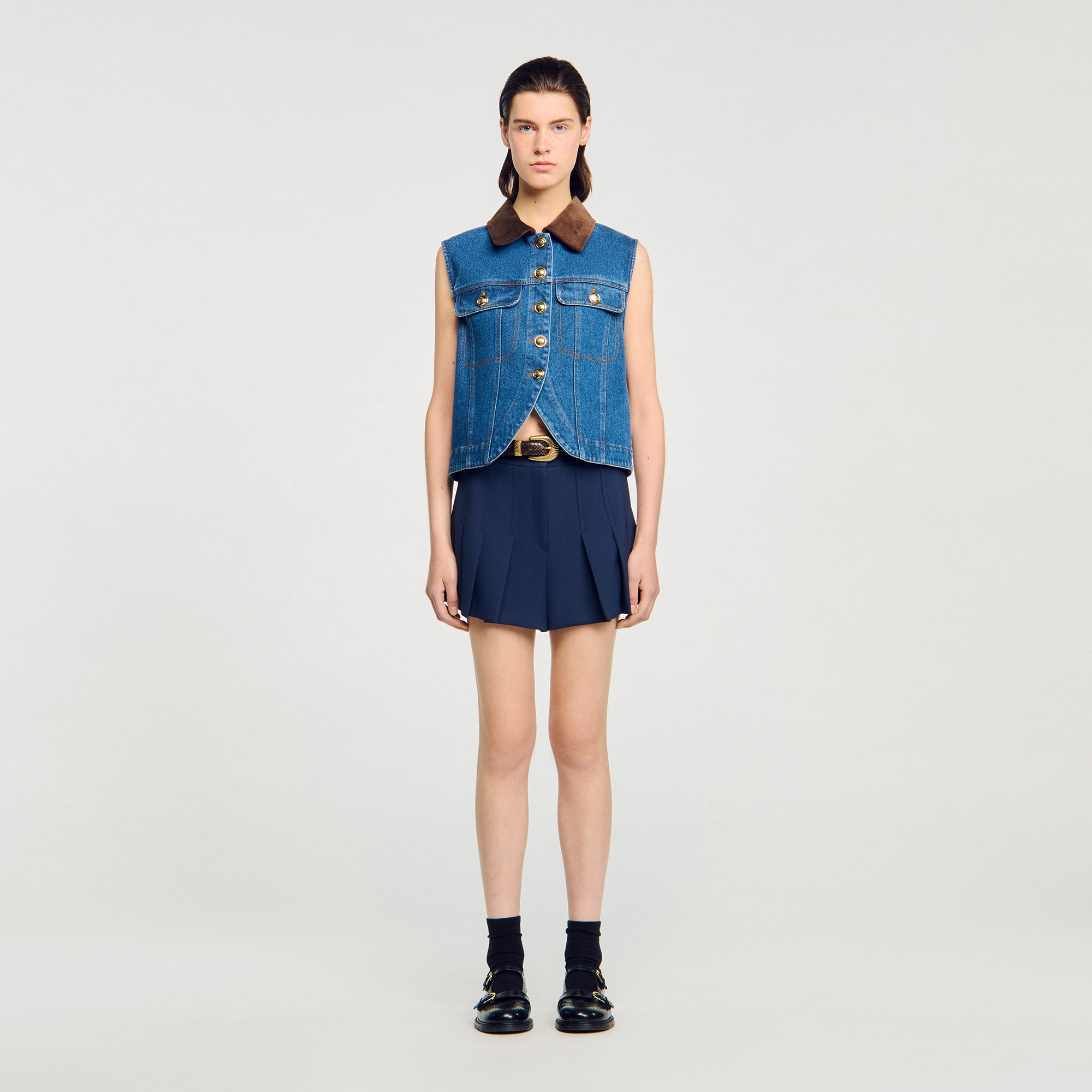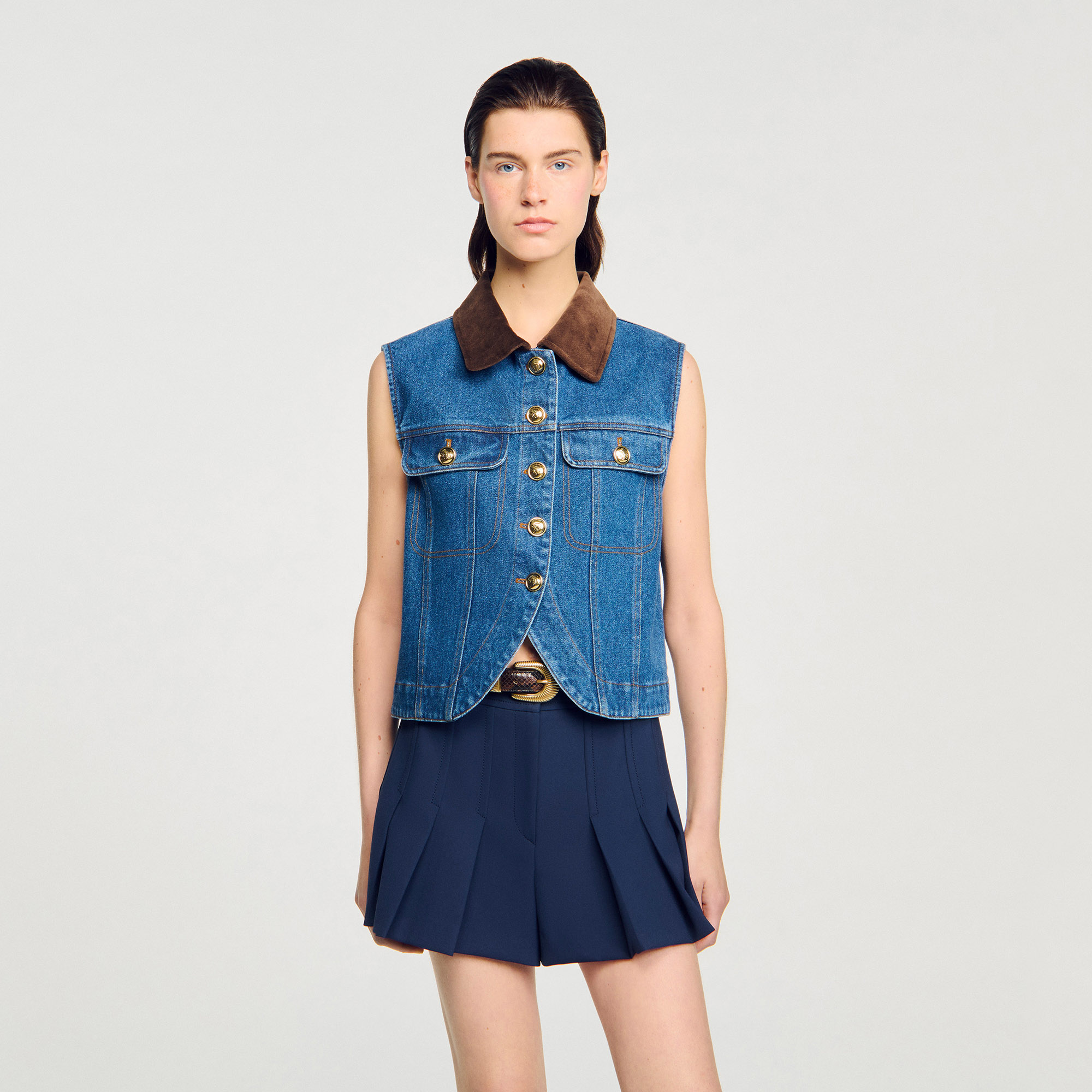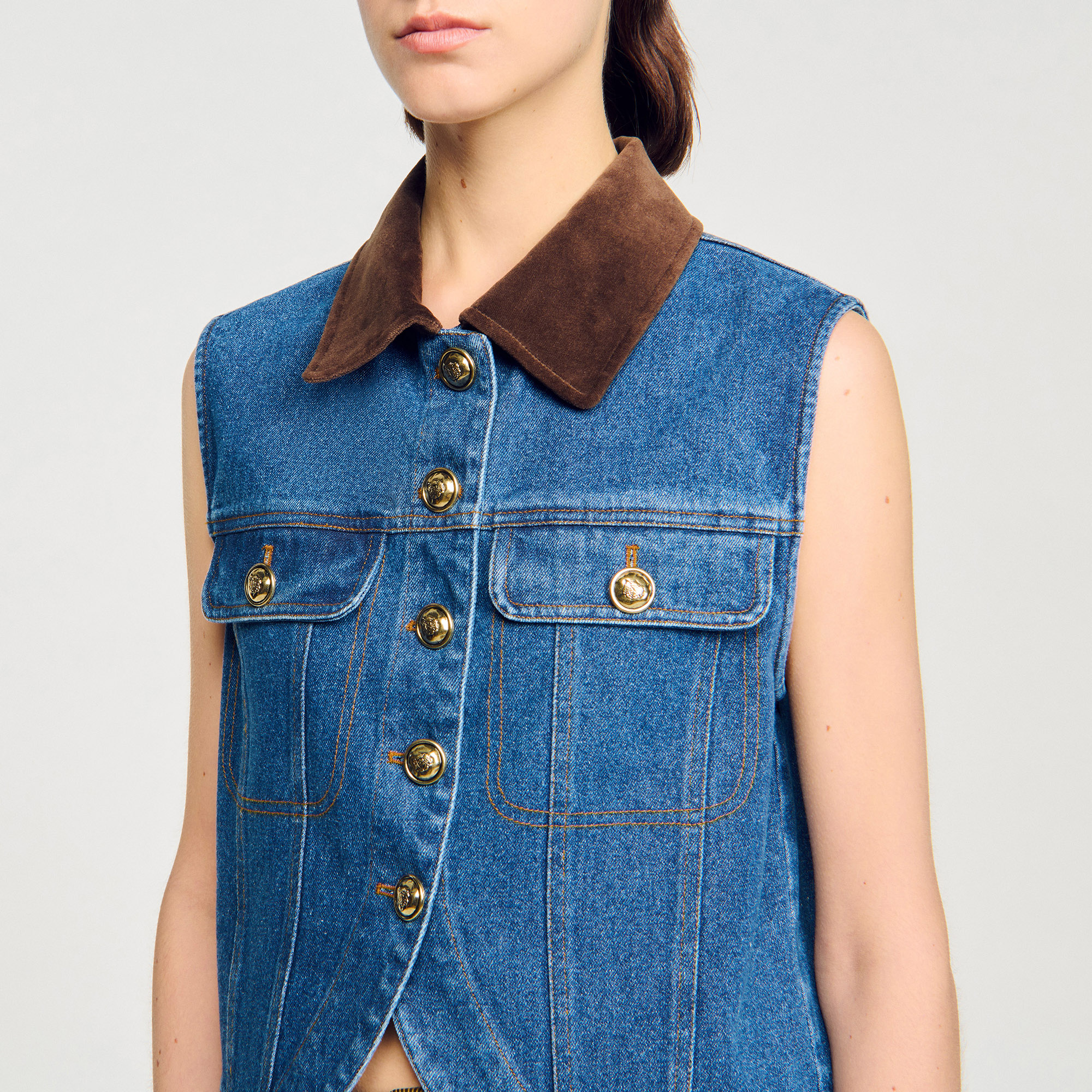 Sandro Women's denim vest Contrasting velvet collar Sleeveless Button fastening Topstitched flap pockets with buttons Rounded front hem and straight back Faded.