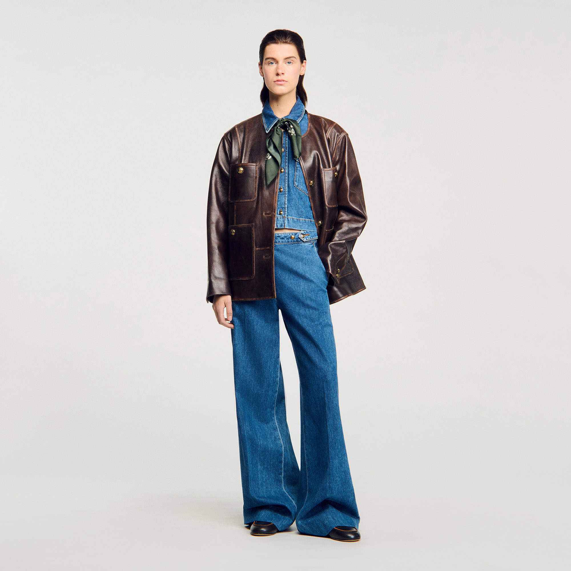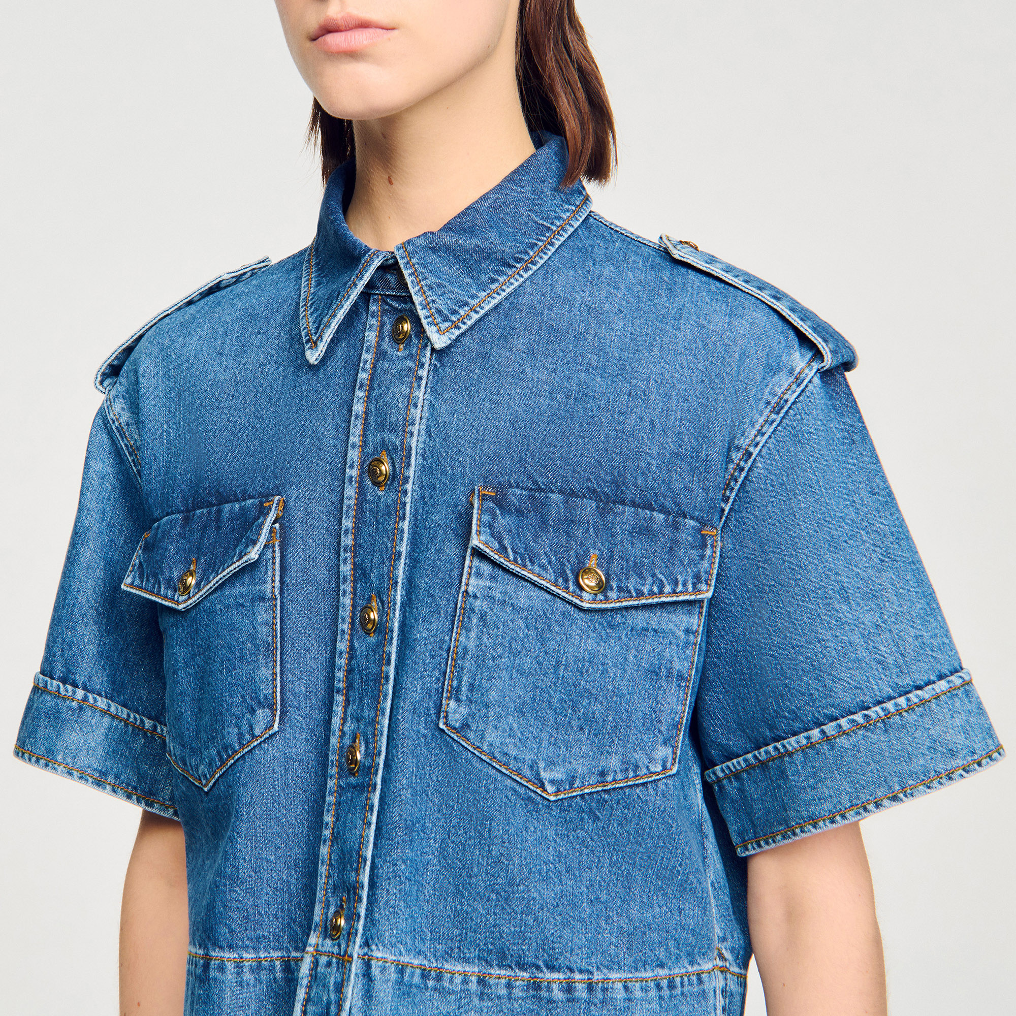 Sandro Women's washed denim cropped shirt Straight fit Shirt collar Short sleeves Button fastening Buttoned patch pockets on chest Buttoned shoulder tabs Small side slits True to size.