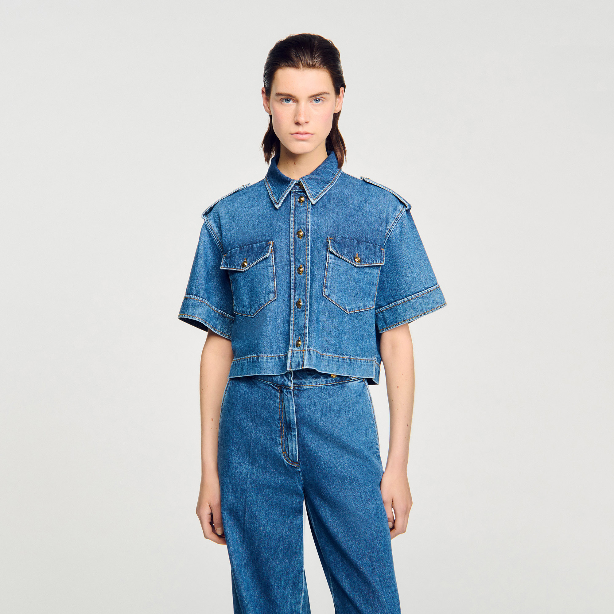 Sandro cotton Cropped denim shirt with a shirt collar, short sleeves and button fastening.