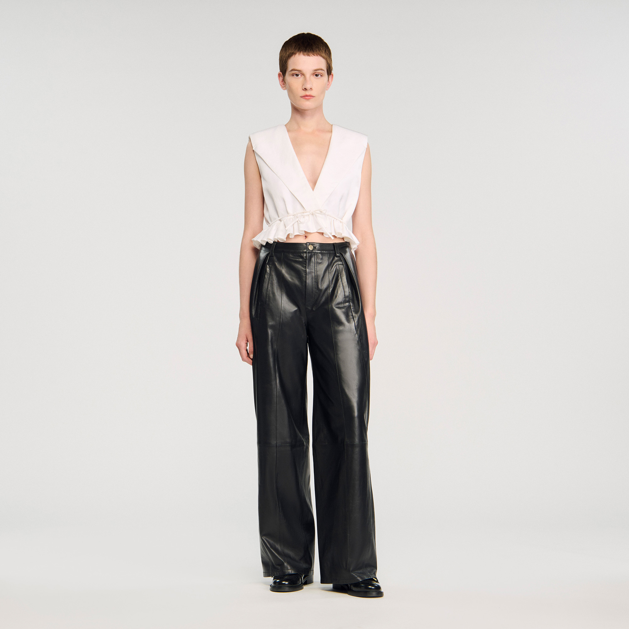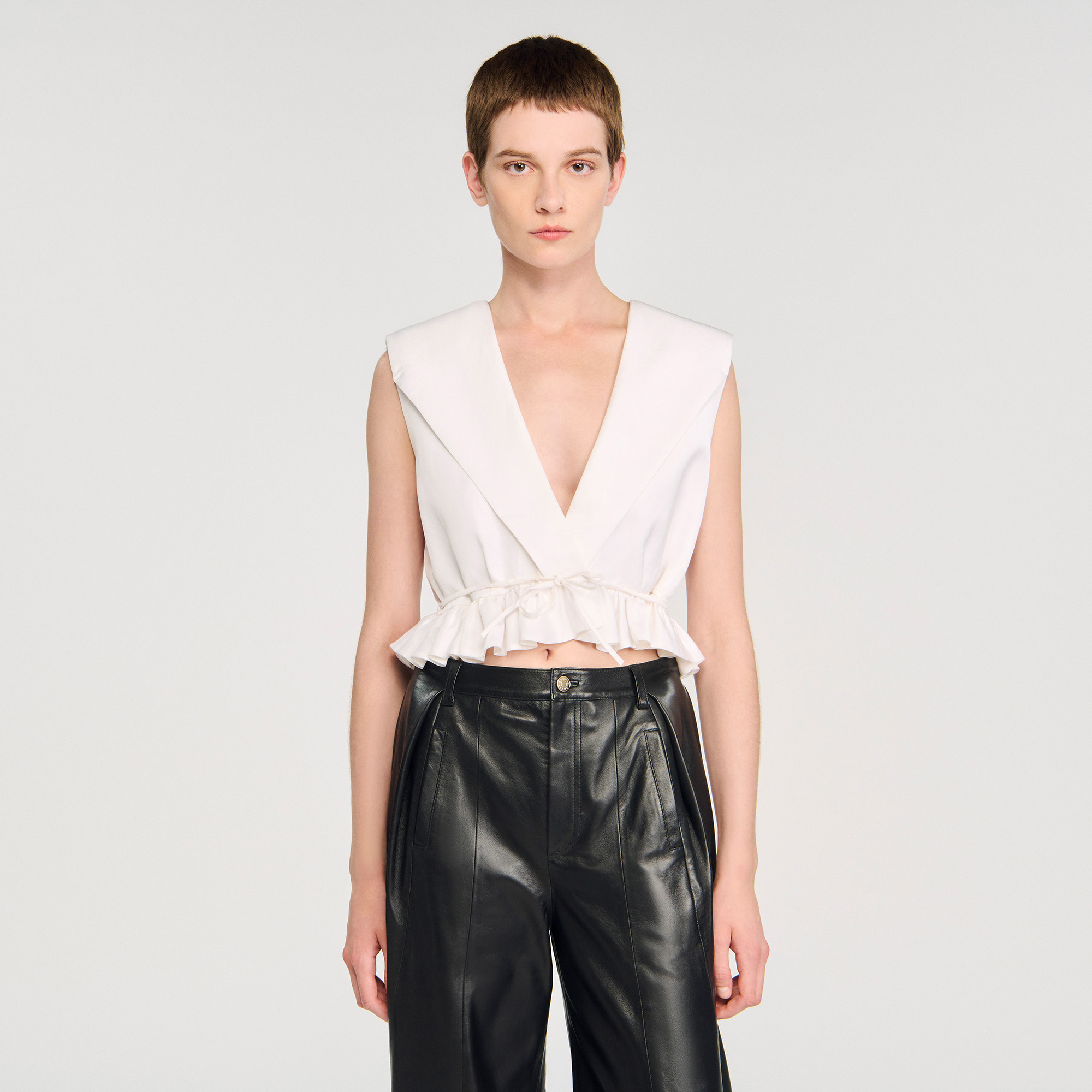 Sandro Women's crop top Wrap V-neckline Shoulder pads Gathered ruffle Tie fastening Designed for a cinched fit.