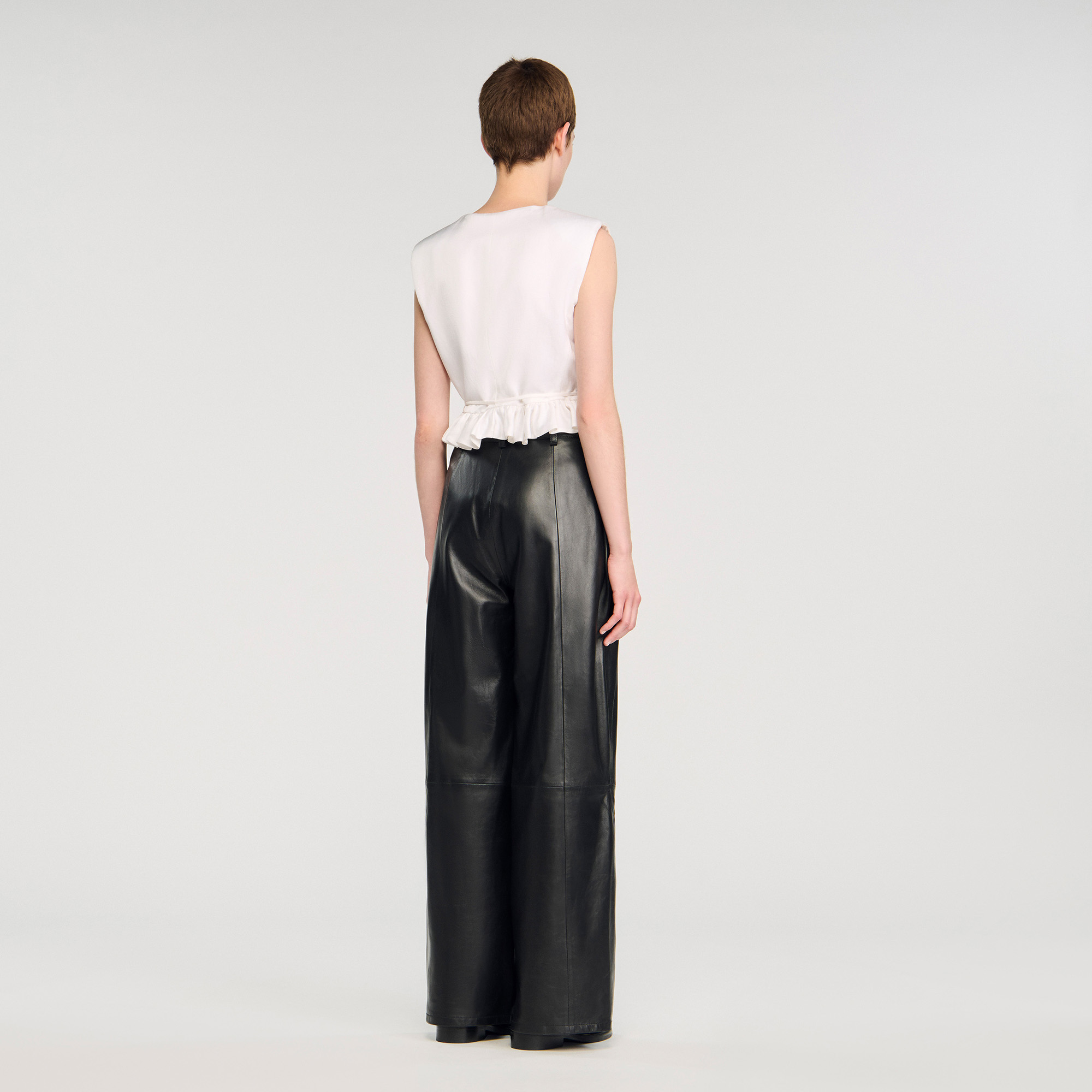 Sandro viscose Sleeveless crop top with a wrap V-neckline, hidden press-stud fastening, shoulder pads and waist cut-outs with gathered ruffle.