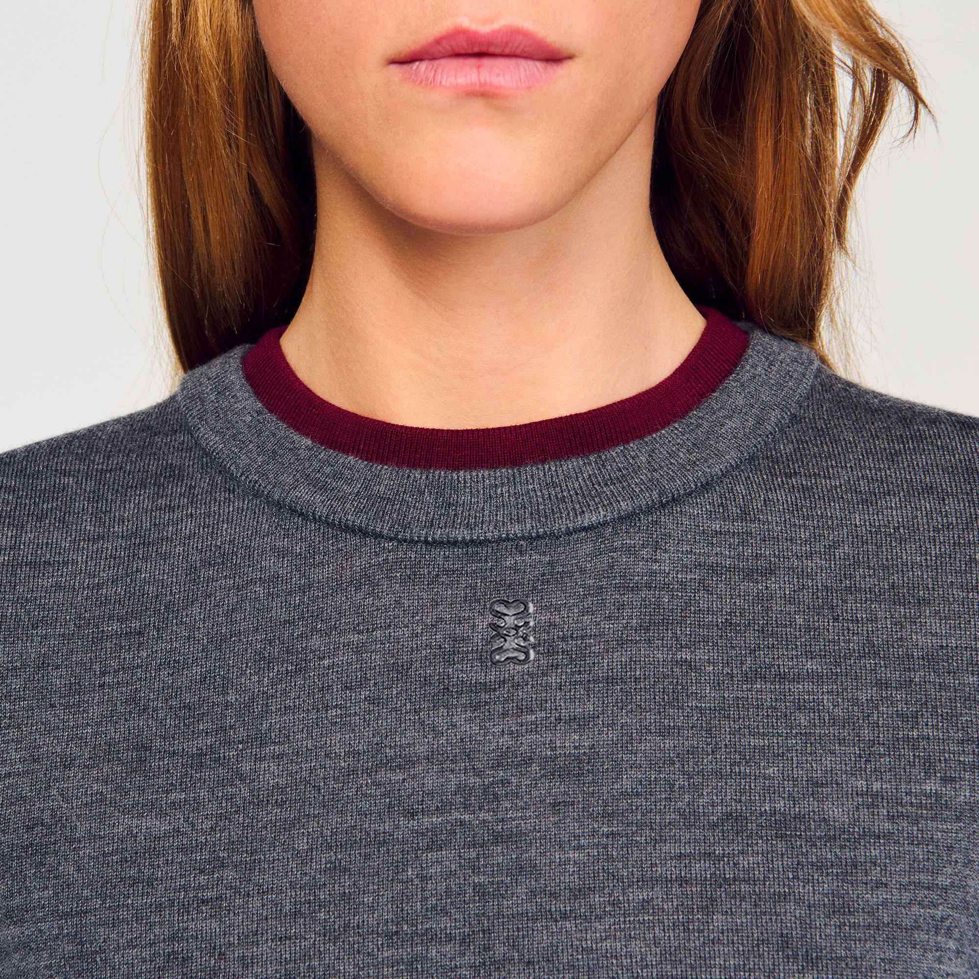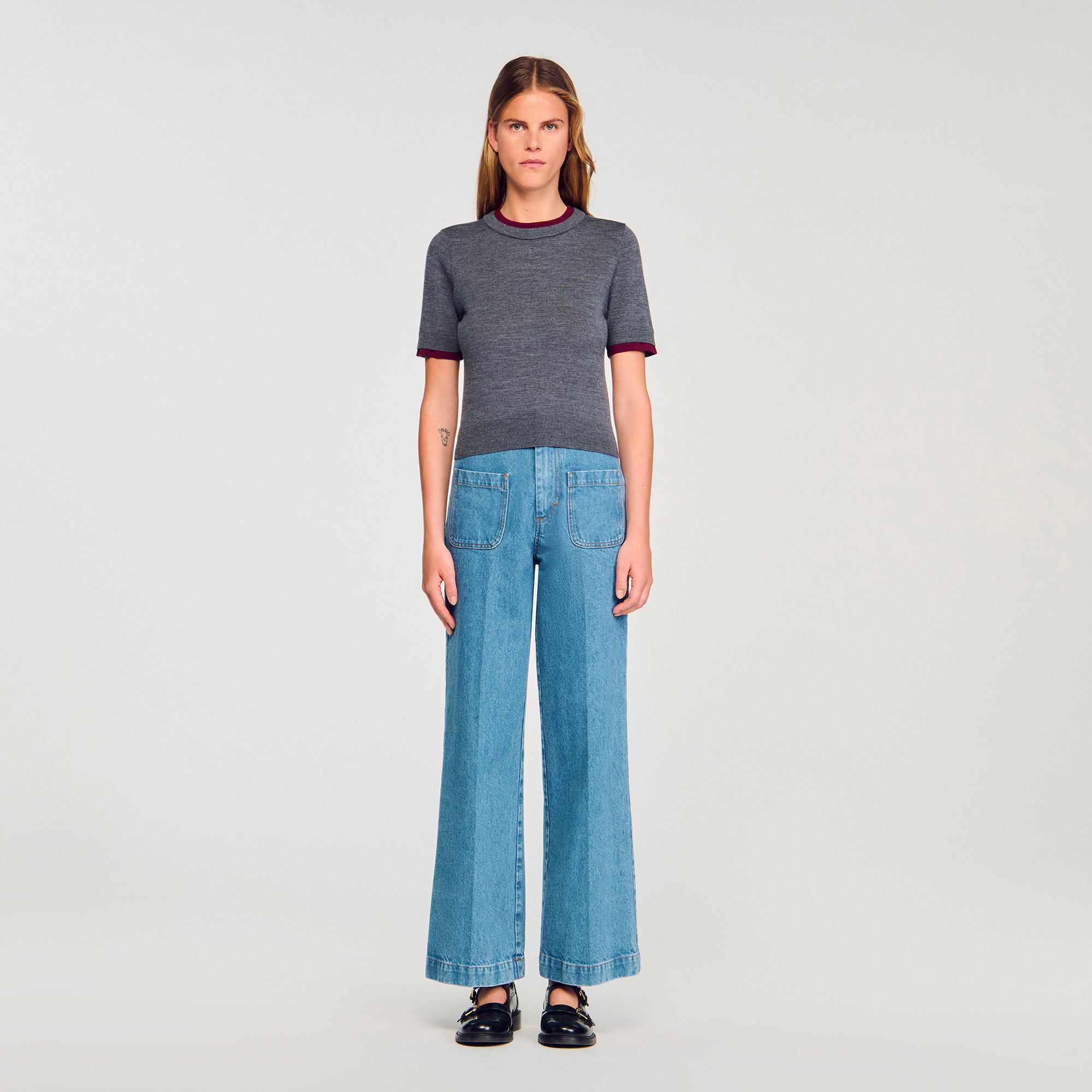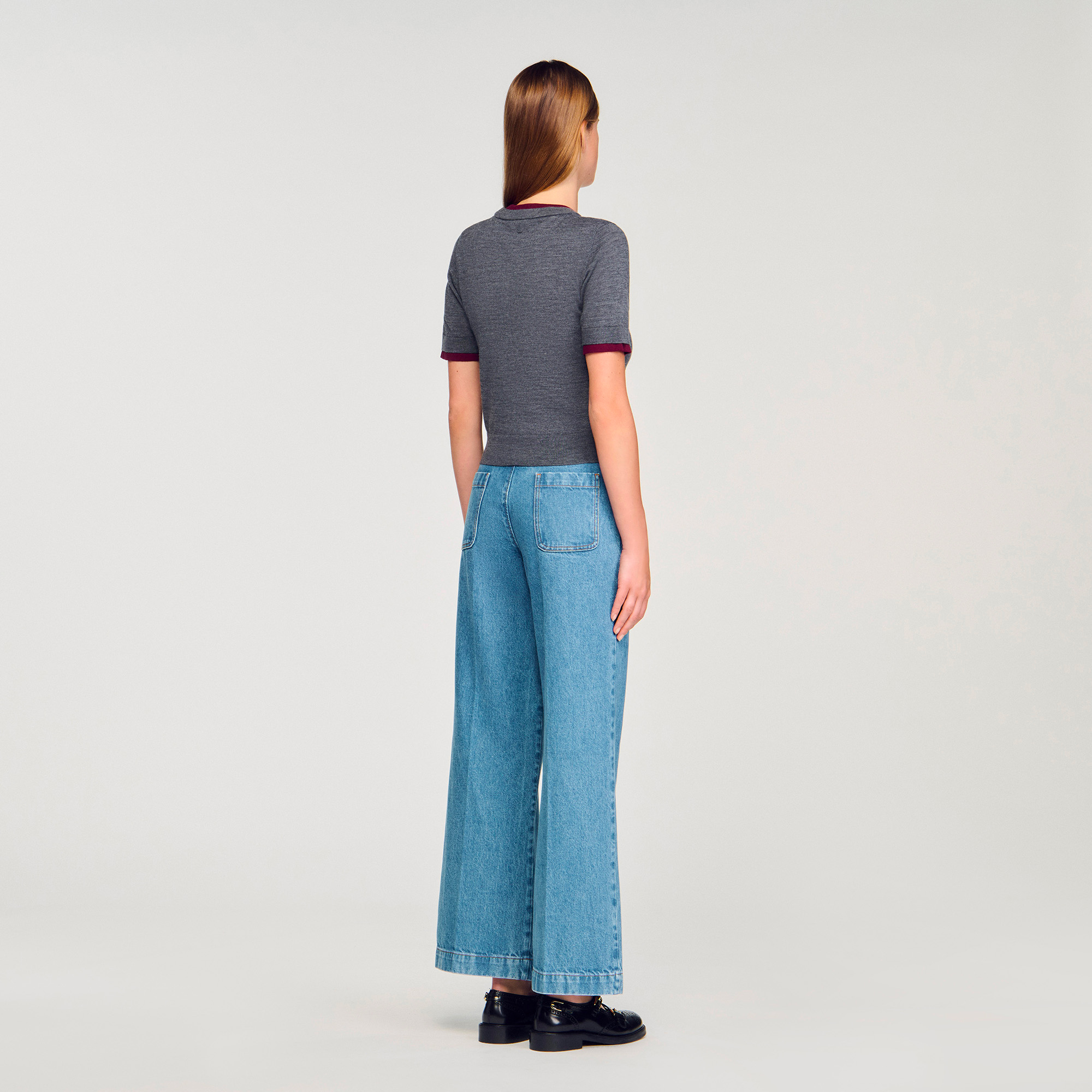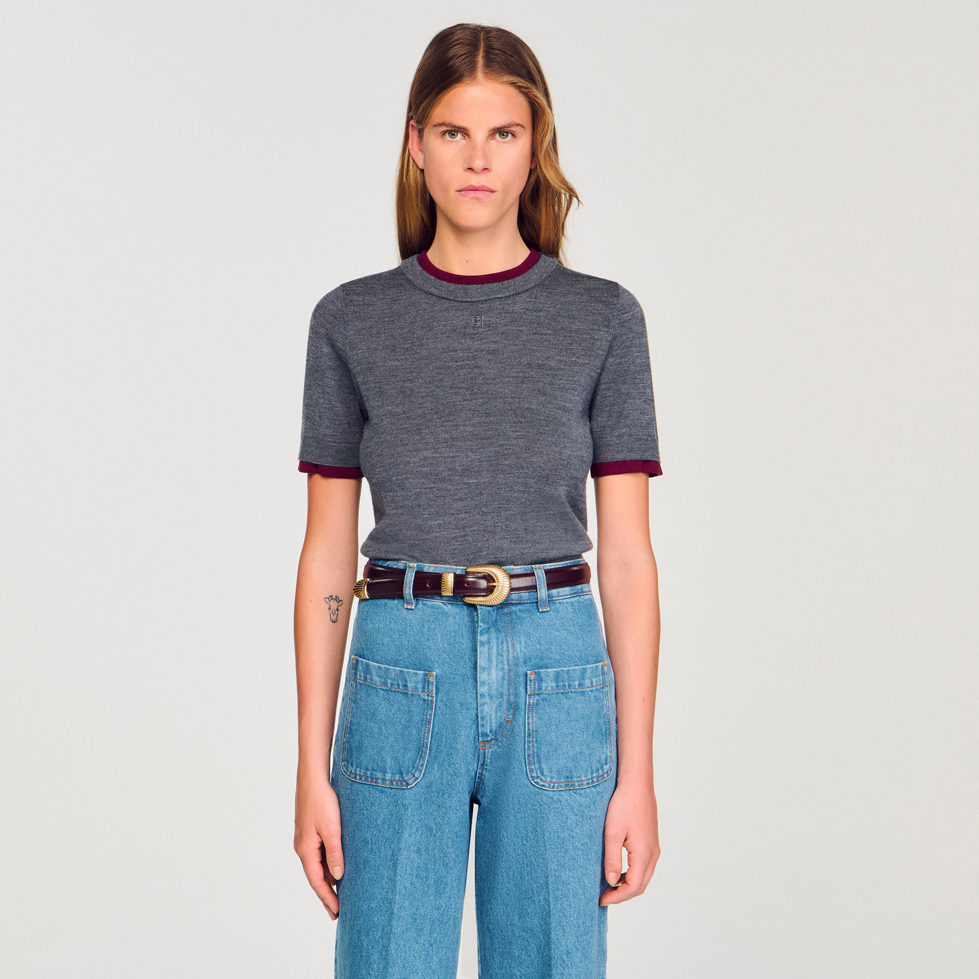 Sandro wool Cropped fine knit sweater with round neck and short sleeves with contrasting trim, adorned with a signature tag.