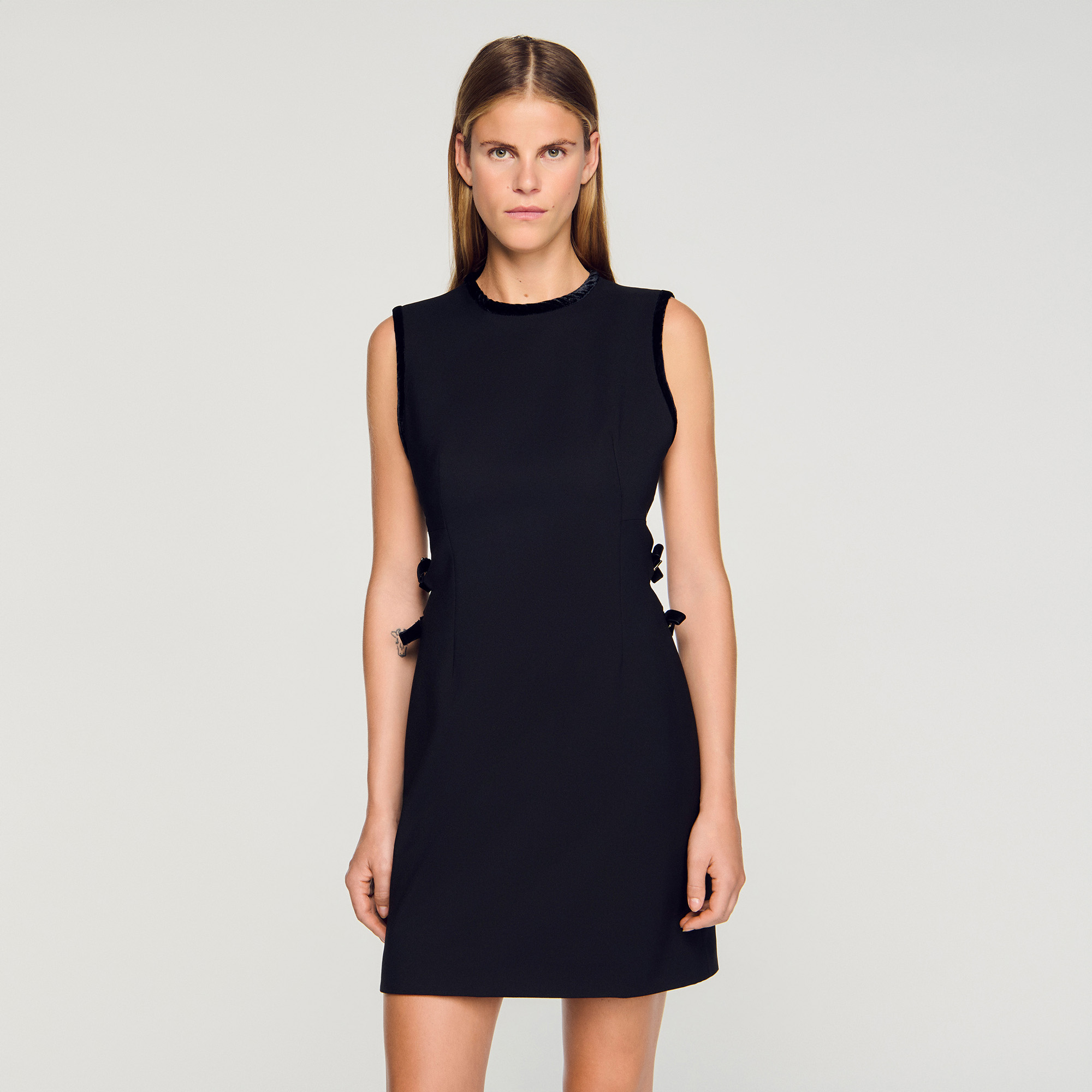 Sandro Women's mini dress Round neck Velvet trim on neckline and sleeve opening Side openings with velvet bows and gold loops Back zip fastening Designed for a cinched fit.