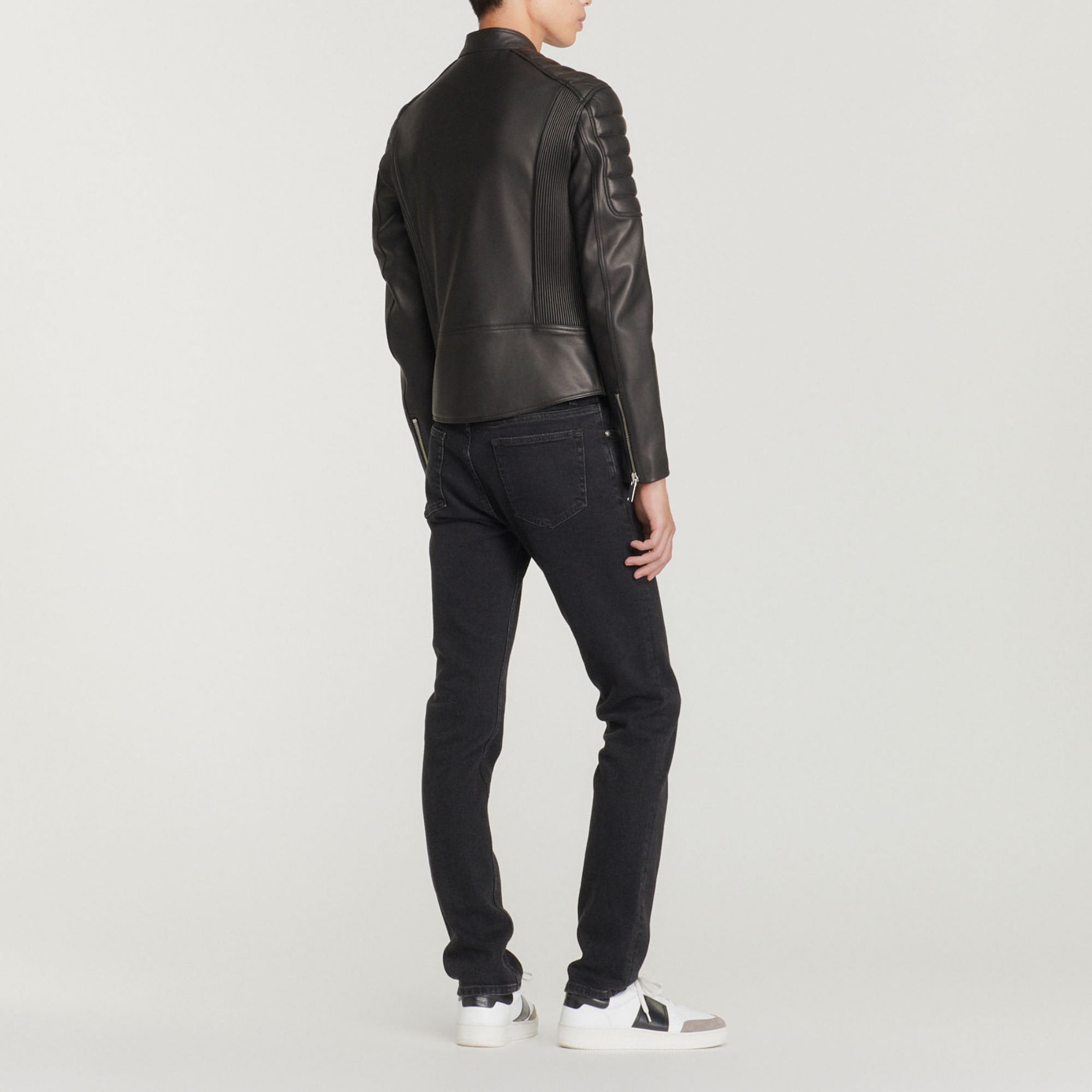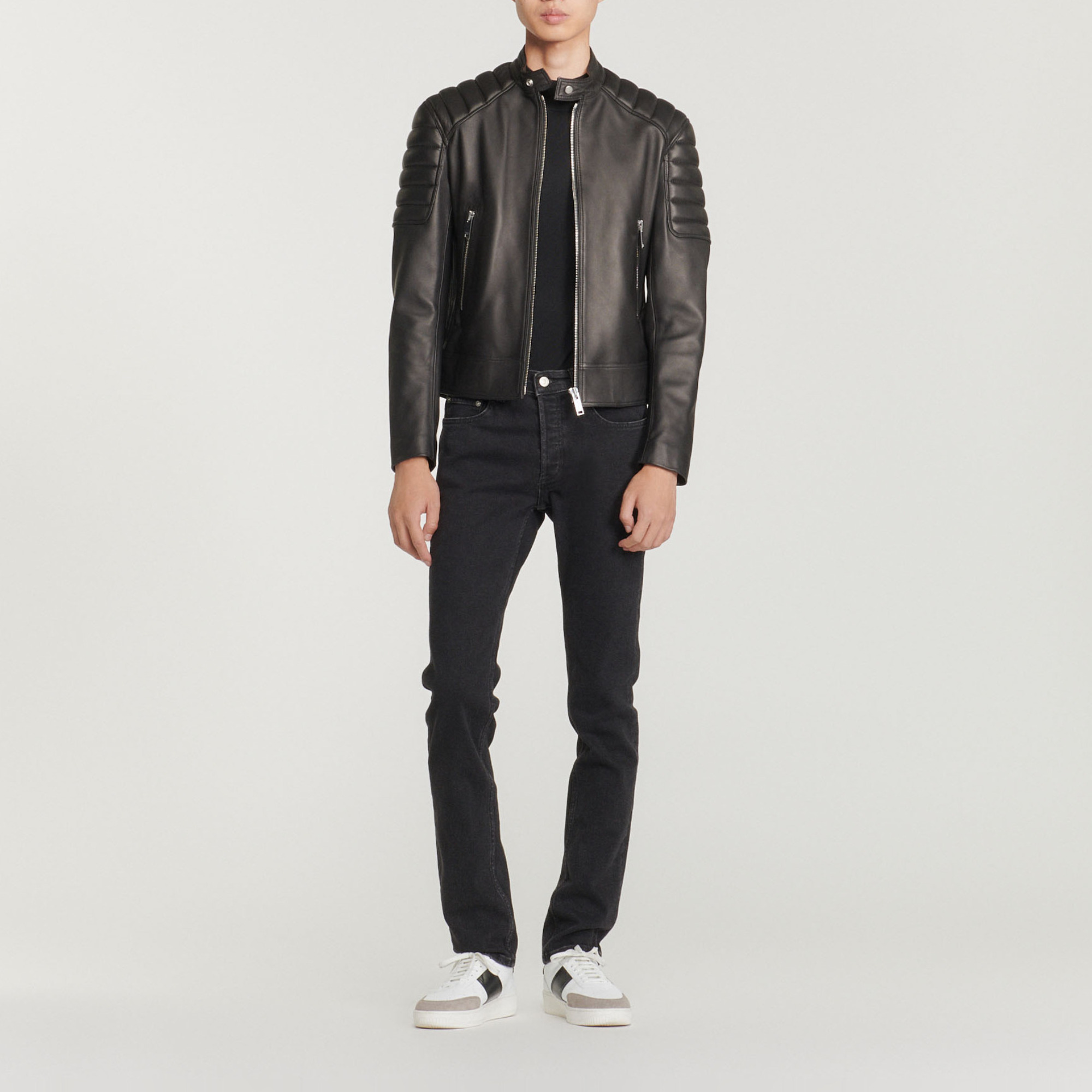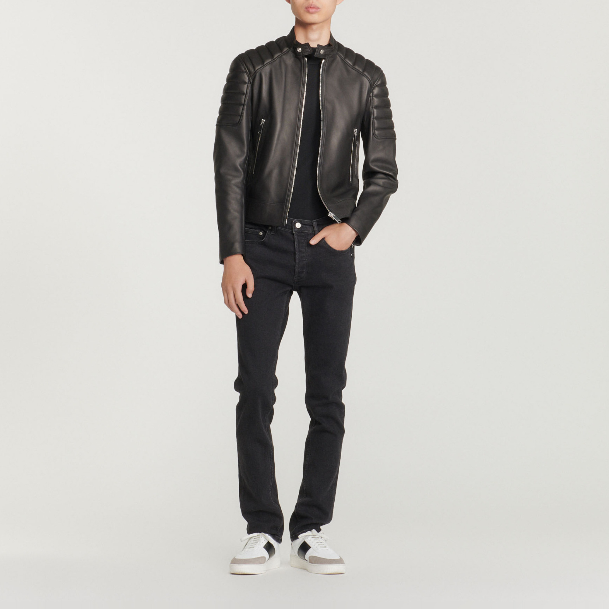 Sandro leather Sandro jacket • Lambskin leather • Quilted on the shoulders • High neck • Long sleeves • Zip fastening • Vertical zipped breast pockets • Inside pockets • Zipped cuffs • Fitted cut Model is wearing a size S and is 6'1'' This leather comes from a tannery in line with the best industry practice in terms of the environment (use of chemicals, water and energy consumption, runoff and emissions)..