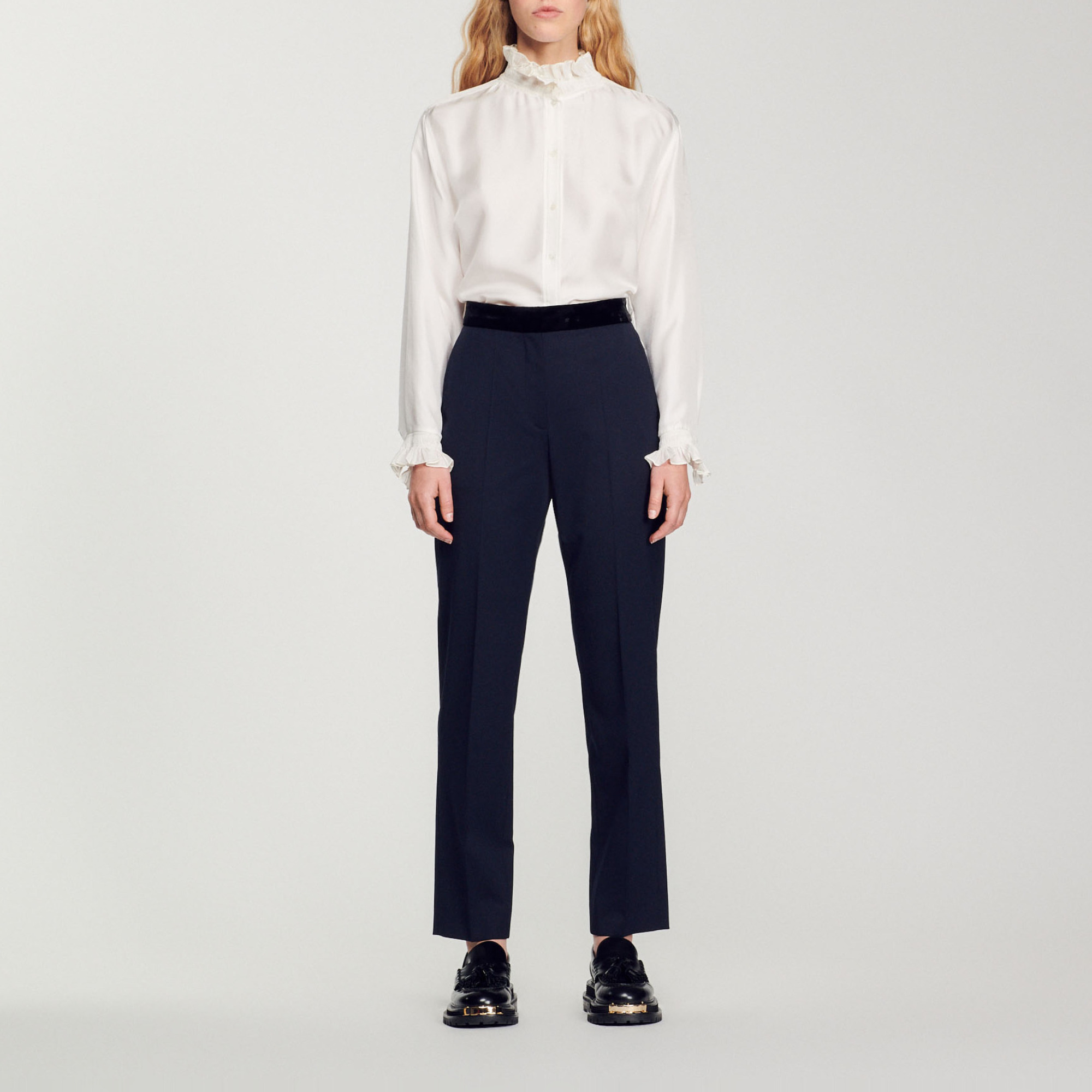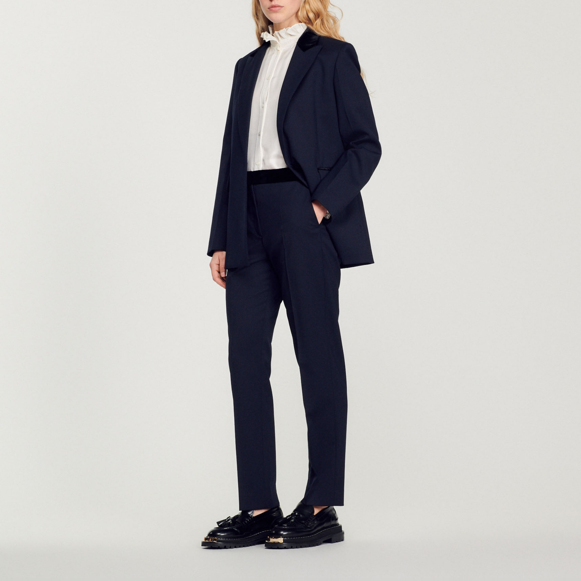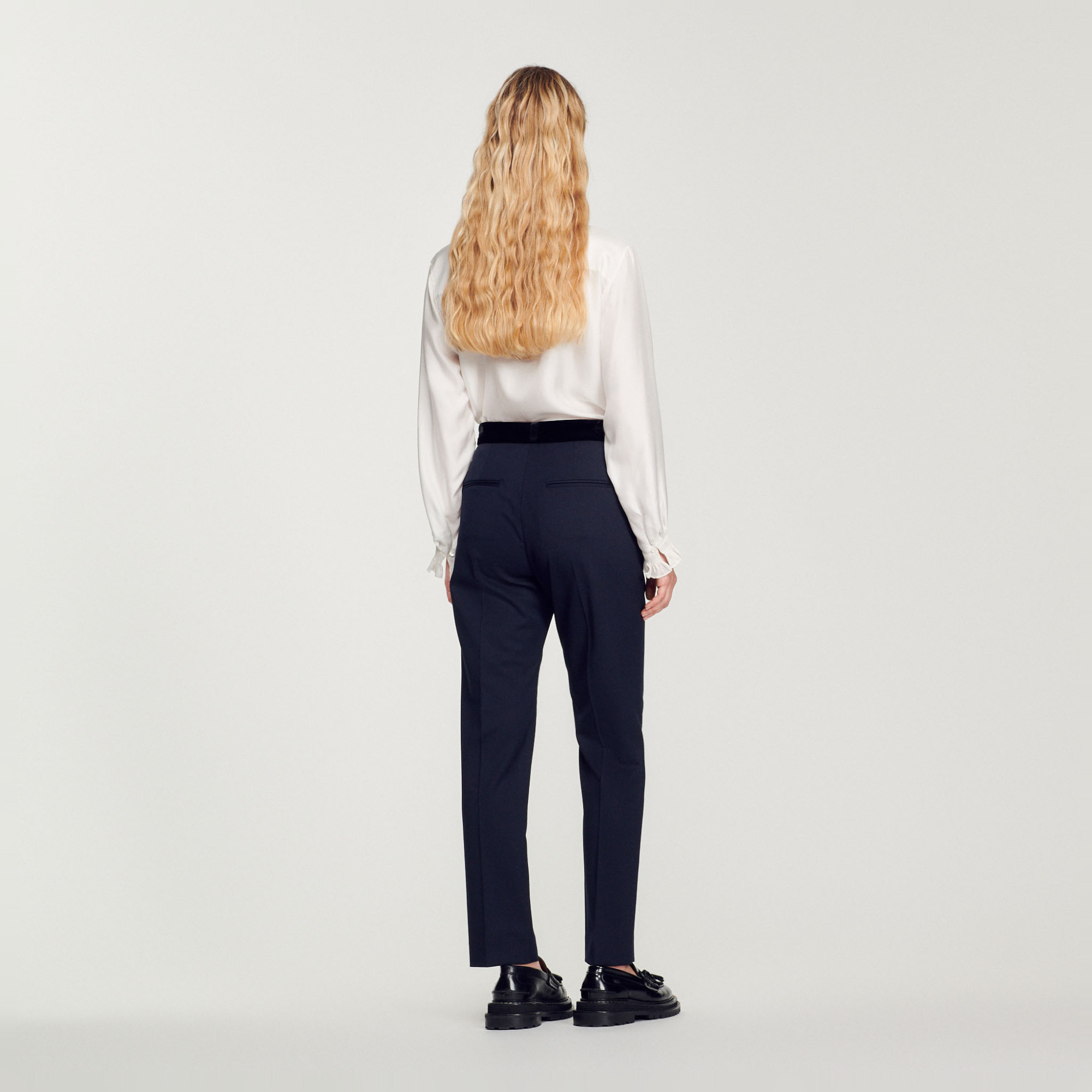 Sandro polyester Sandro women's pants • Wool and recycled polyester pants • Velvet waistband • Slanted pockets at the front • Two piped pockets at the back • Iron-pressed creases at the center of the leg • These pants match the jacket The model is 5'10 tall and wears a size 36 FR / 4 US.