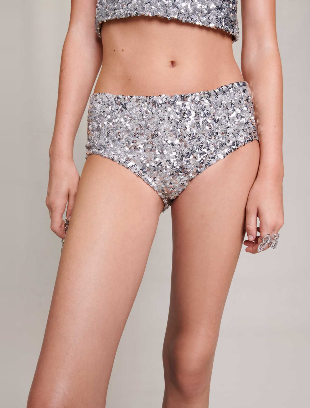 With a low-rise waist and lining, it's embellished with all-over silver sequins, a distinctly sexy detail with real wow factor.