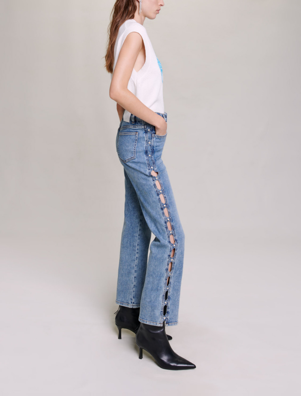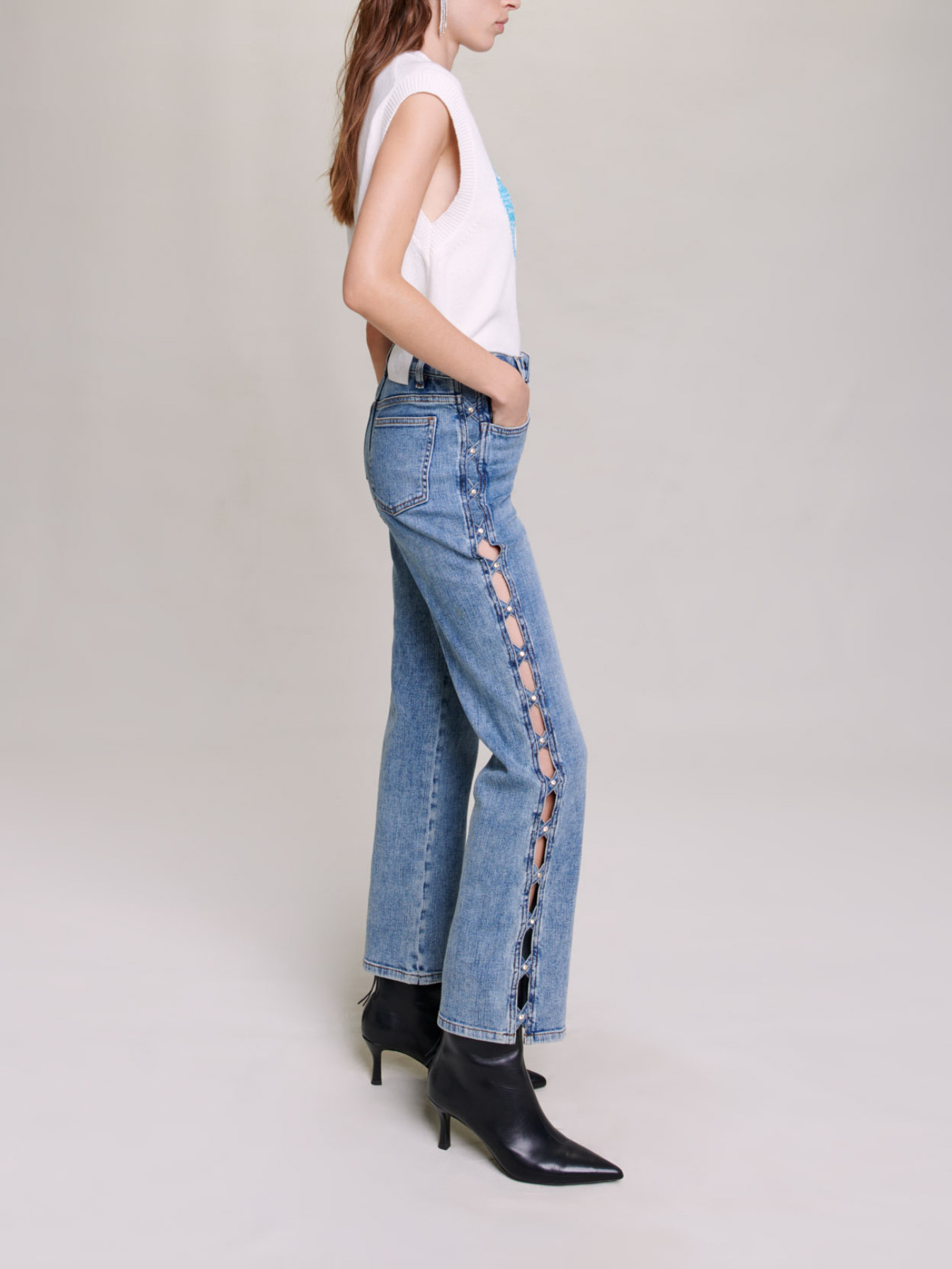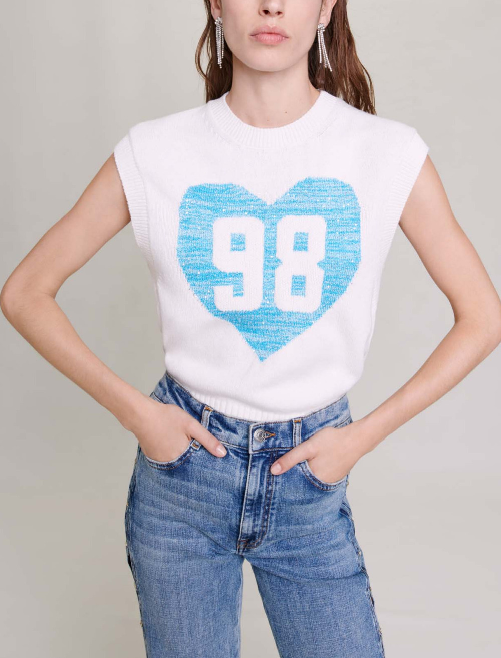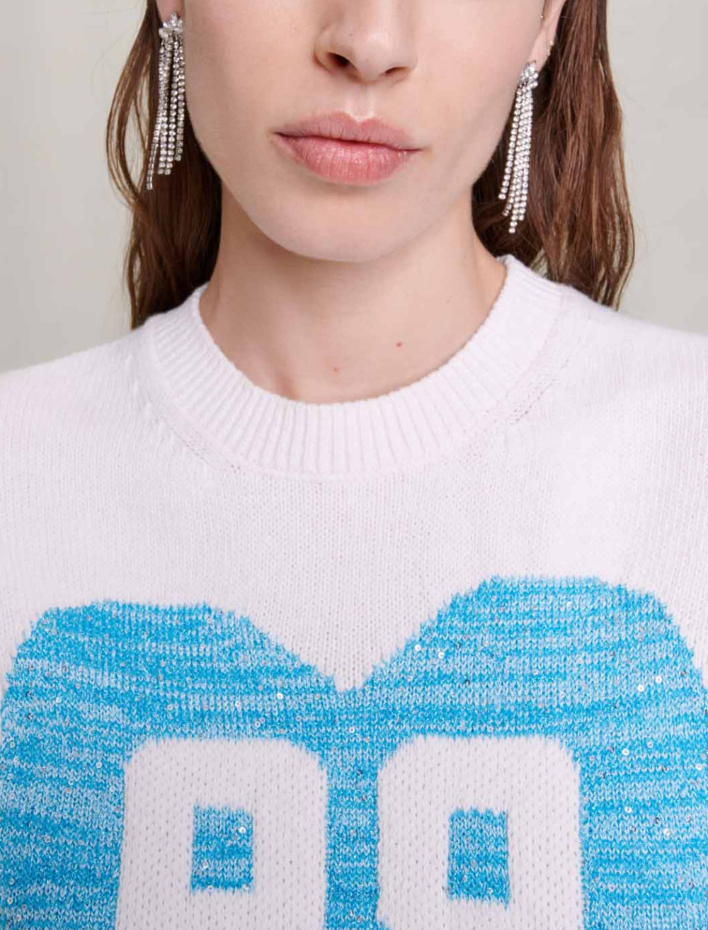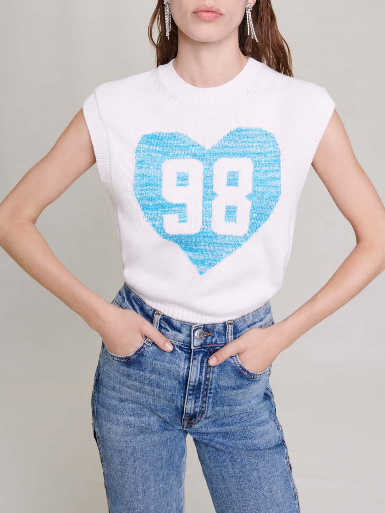 Features a sequinned heart with a maxi 98 as a tribute to the year Maje was founded.