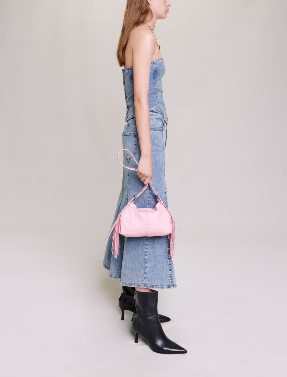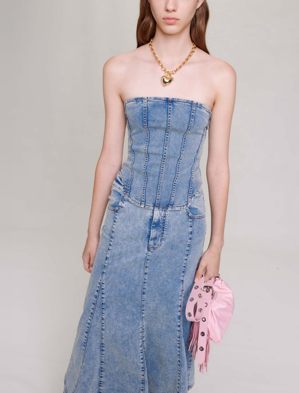 A tribute to the wardrobe trends of the 2000s, this strapless faded denim top gives the silhouette a bold, structured, characterful look.