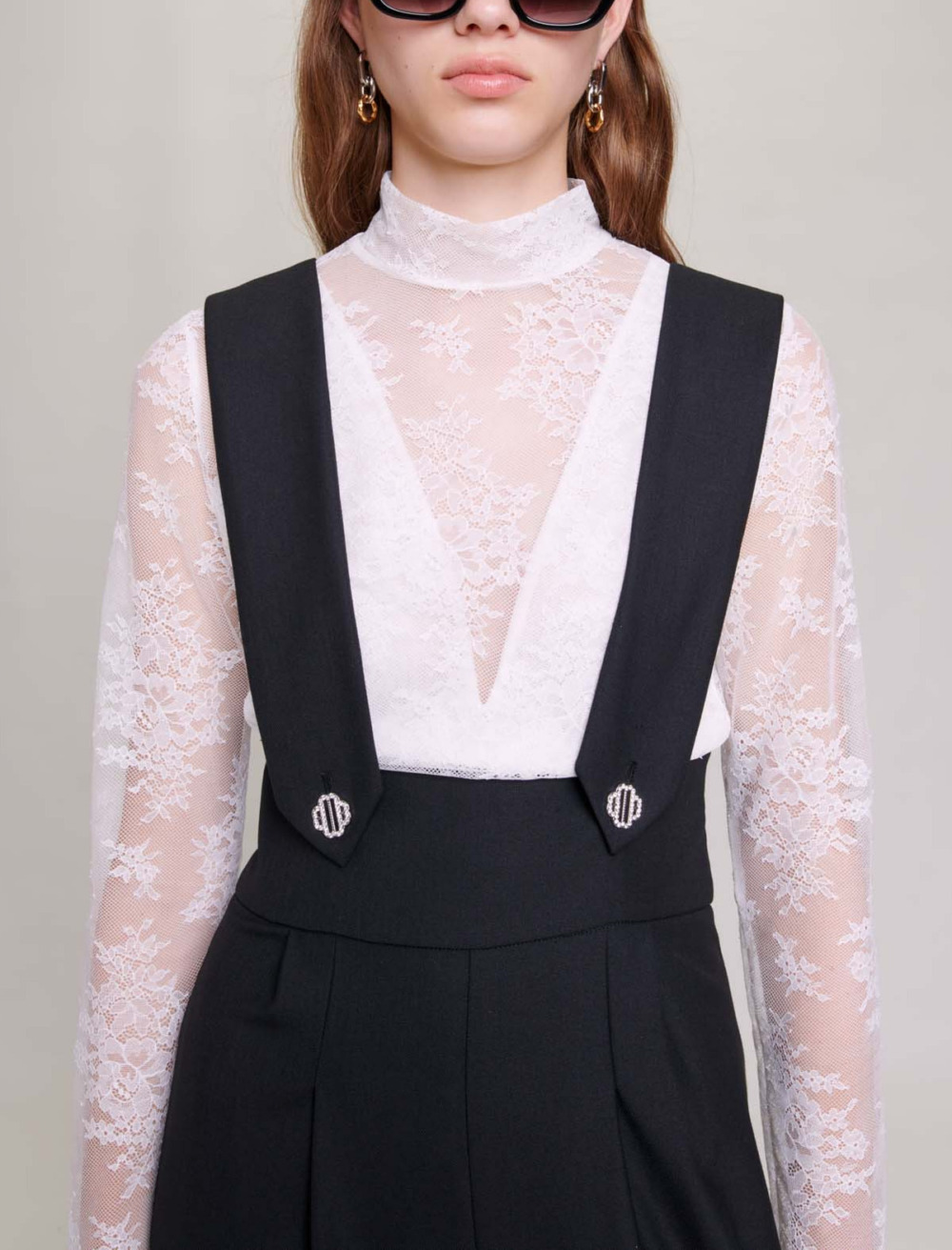 Wide-leg trousers made from recycled wool Oversize removable shoulder straps Belt with Clover rhinestone jewellery buttons.