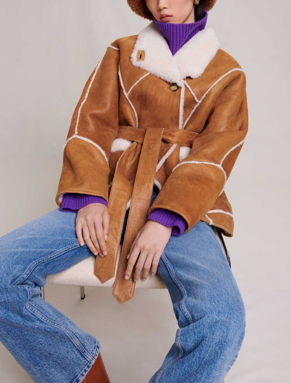 Maje Woman's leather Short fleece coat for Fall/Winter, in color Camel / Brown