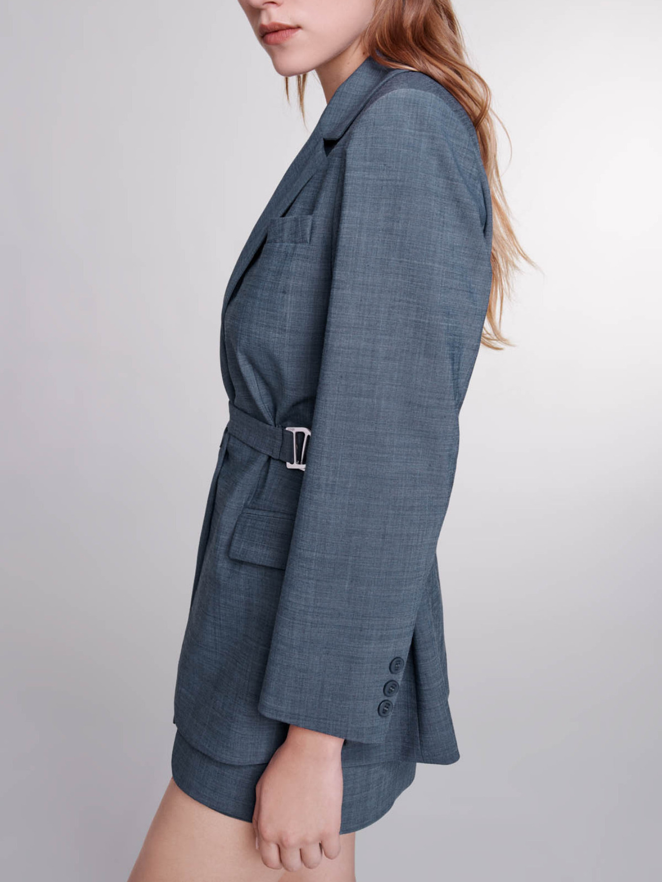 Wool-blend belted blazer Belt with adjustable buckle Jacquard logo lining.