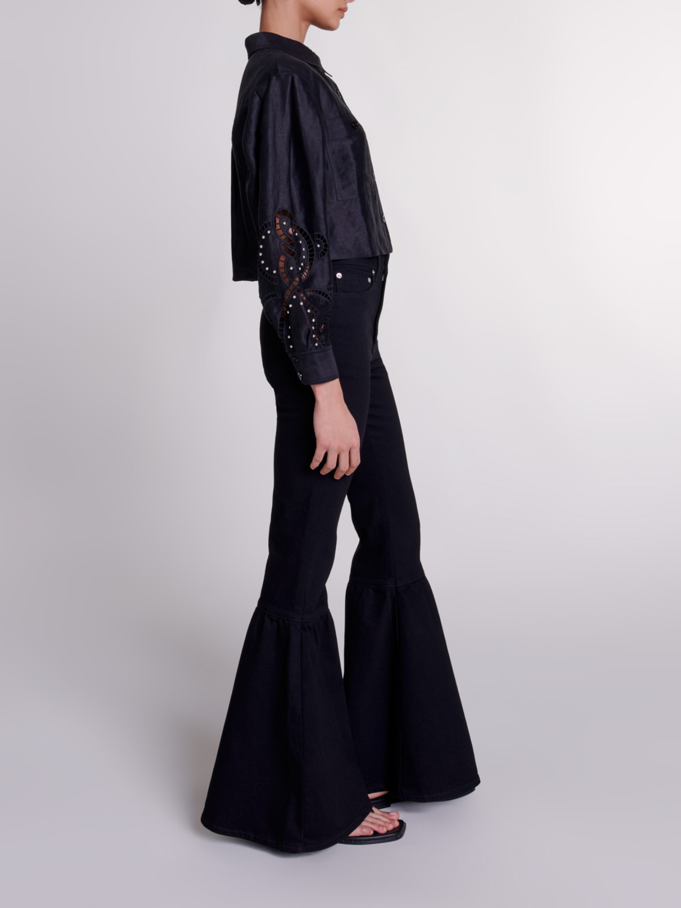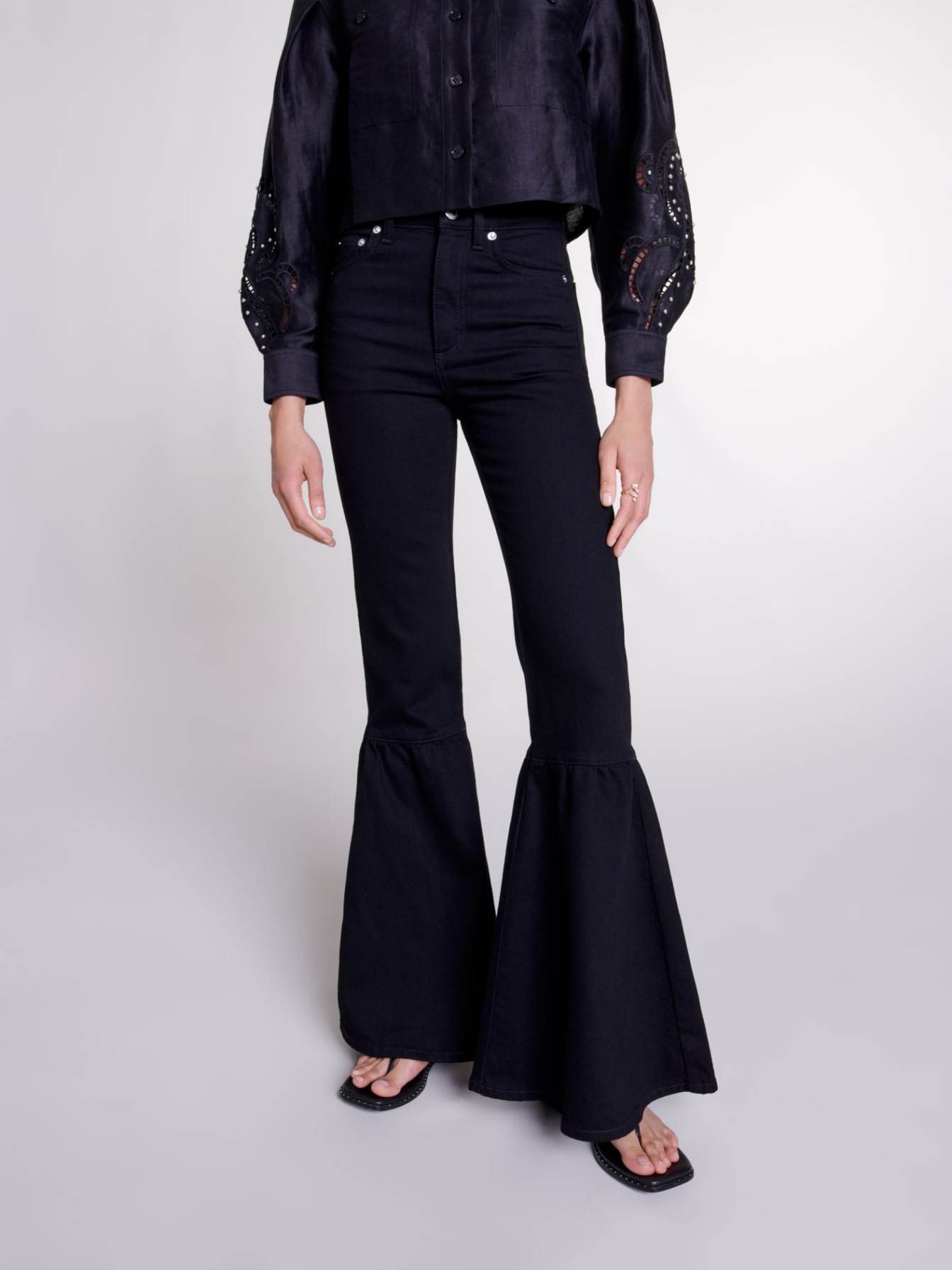 Flared stretch jeans High-waisted Ruffled bell-bottom design.
