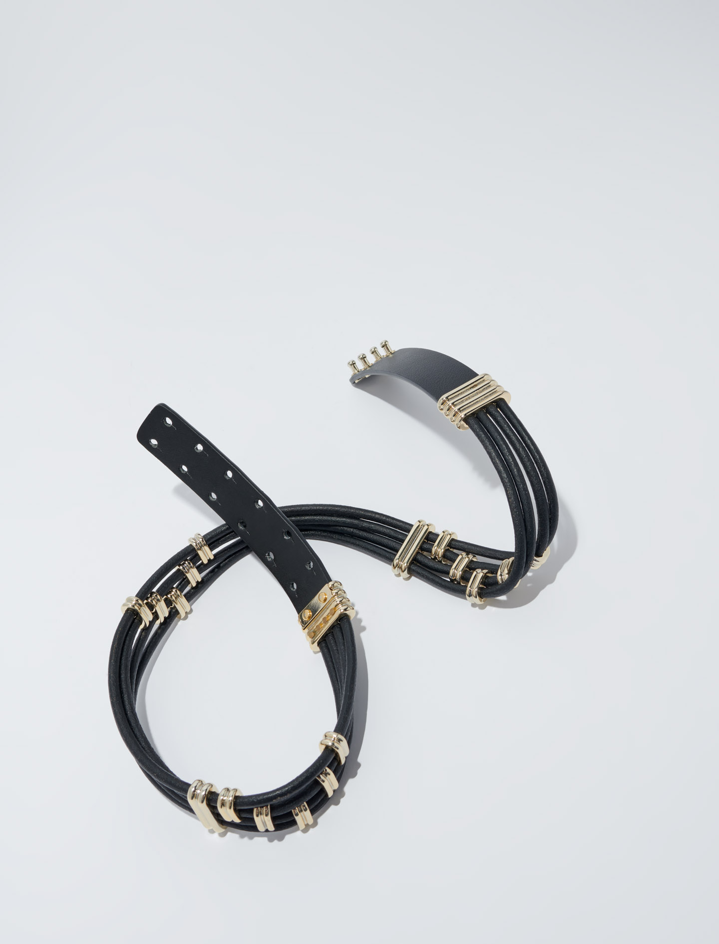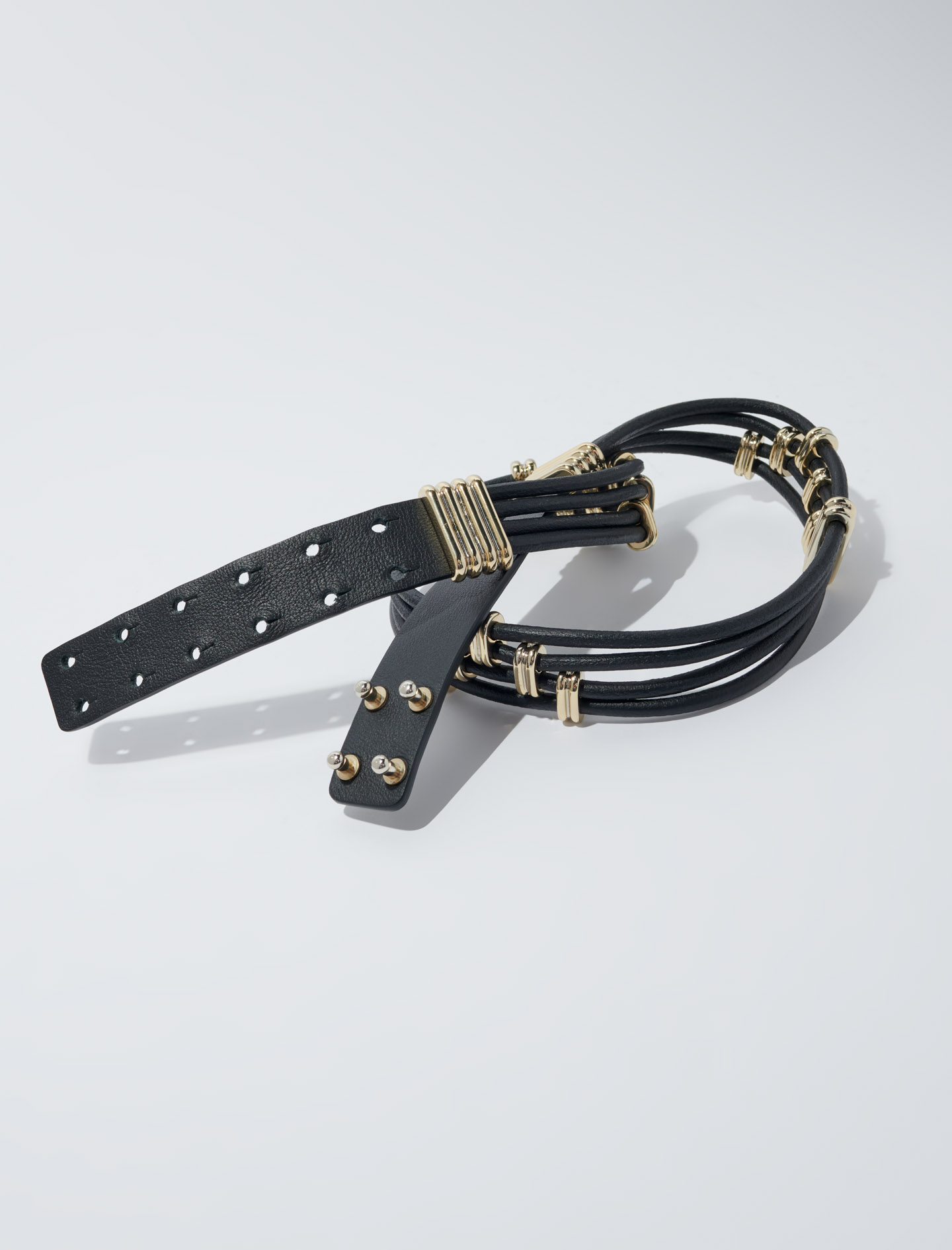 Structure your look with this dual-material belt made from interwoven black leather, embellished with gold metallic inserts.