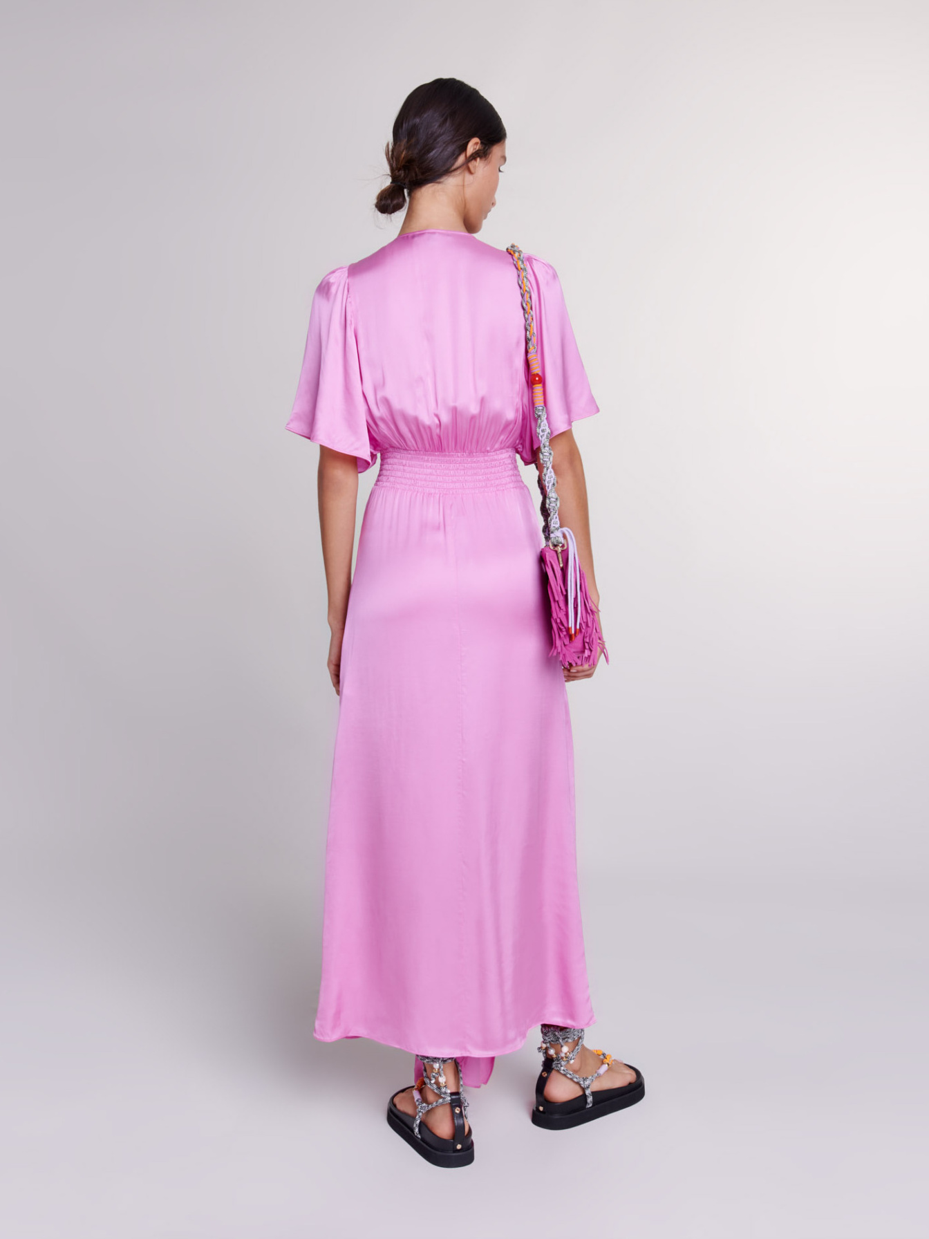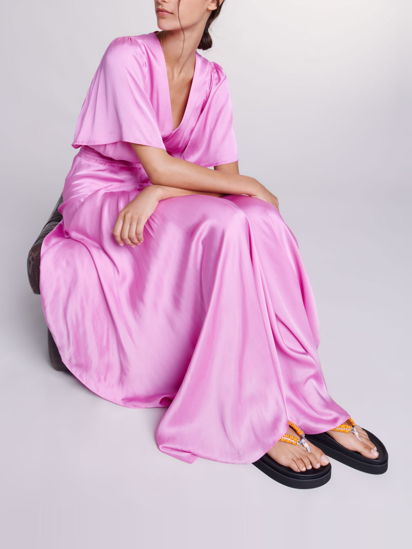Satin-effect maxi dress Plunging neckline Butterfly sleeves.