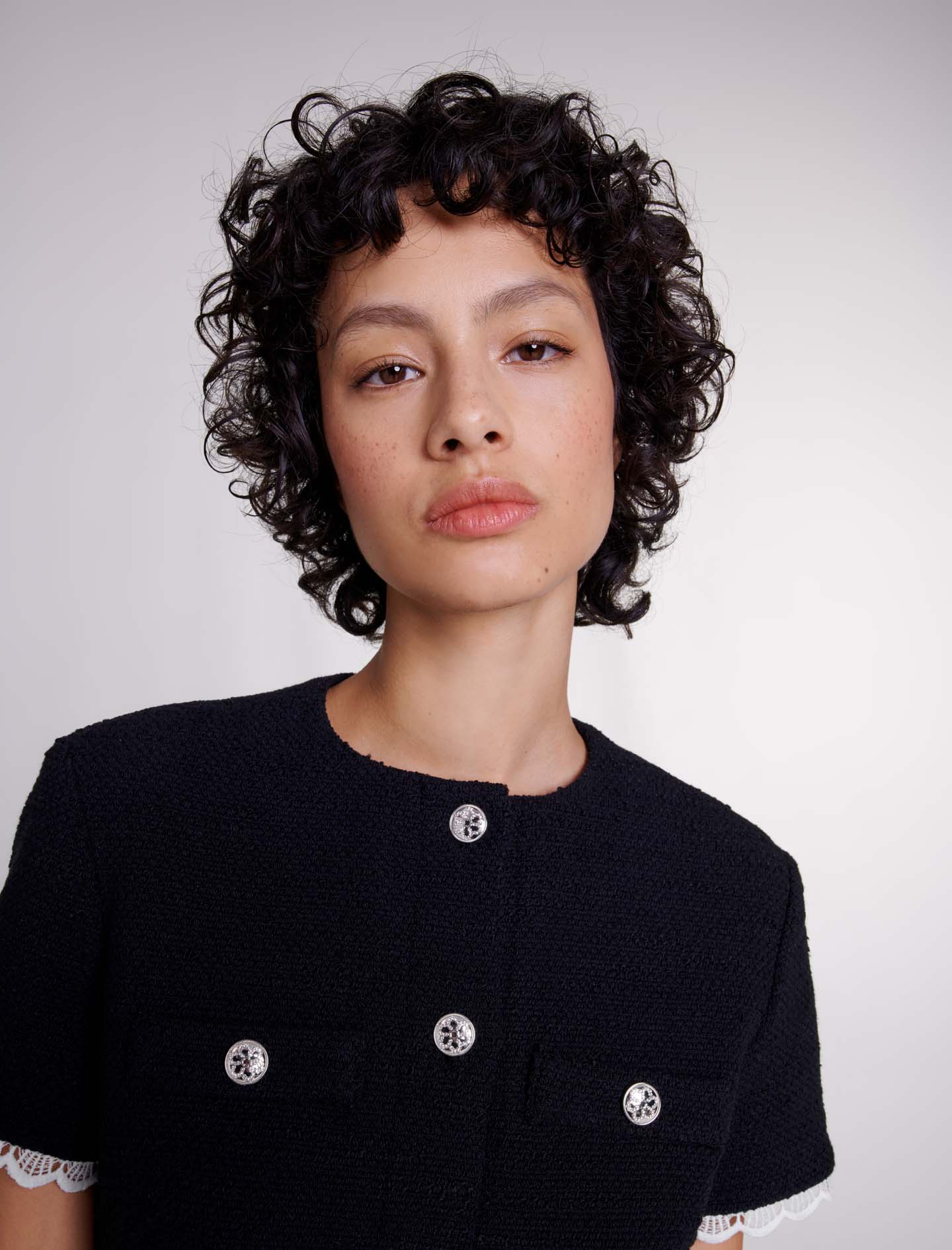 Both chic and structured, it has daisy-shaped rhinestone buttons and contrasting trim embellished with guipure.