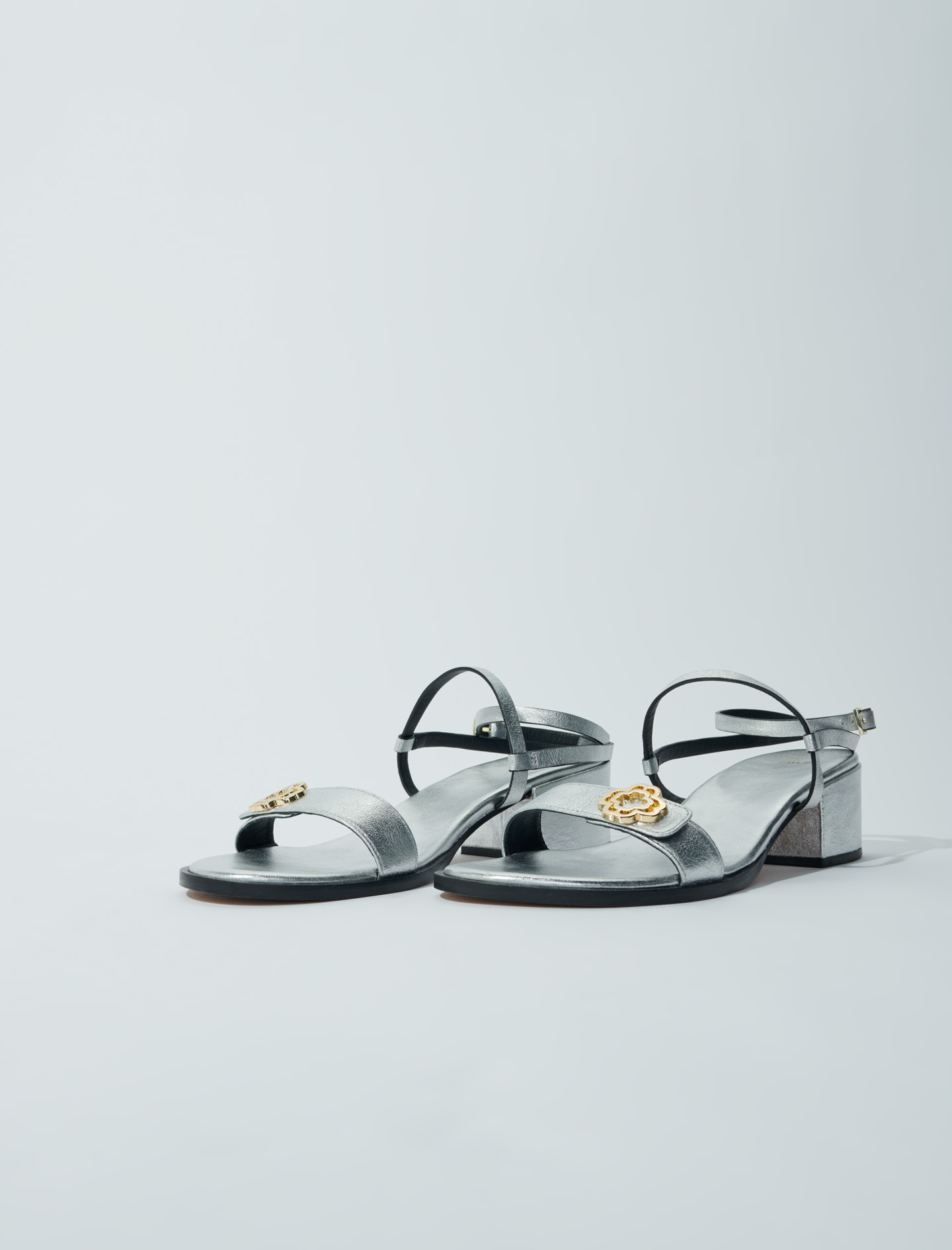 Silver leather heeled sandals Adjustable straps Gold Clover logo.