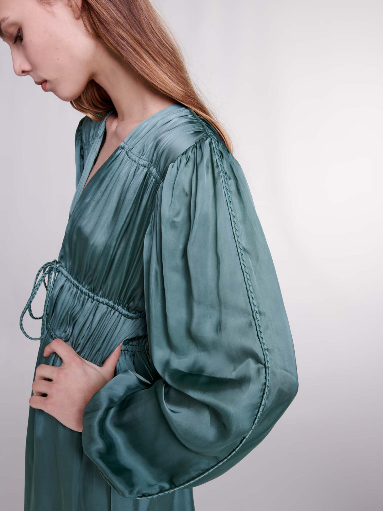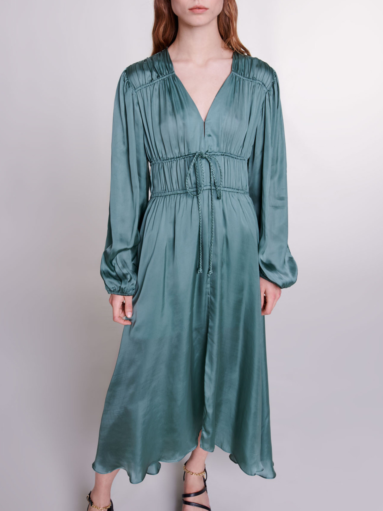 Maxi dress with braided drawstrings Long sleeves Asymmetrical effect.