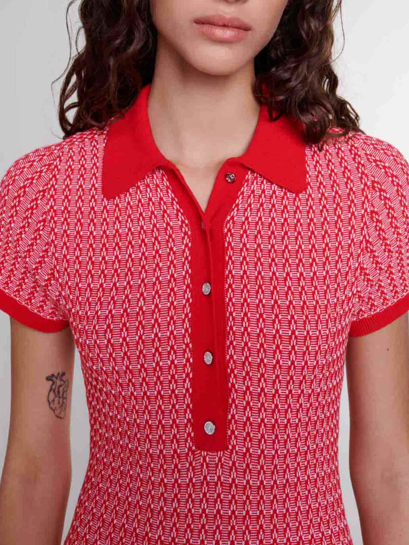 Alongside short sleeves, a polo neck and a button fastening, it has contrasting edges and a slit at the back.