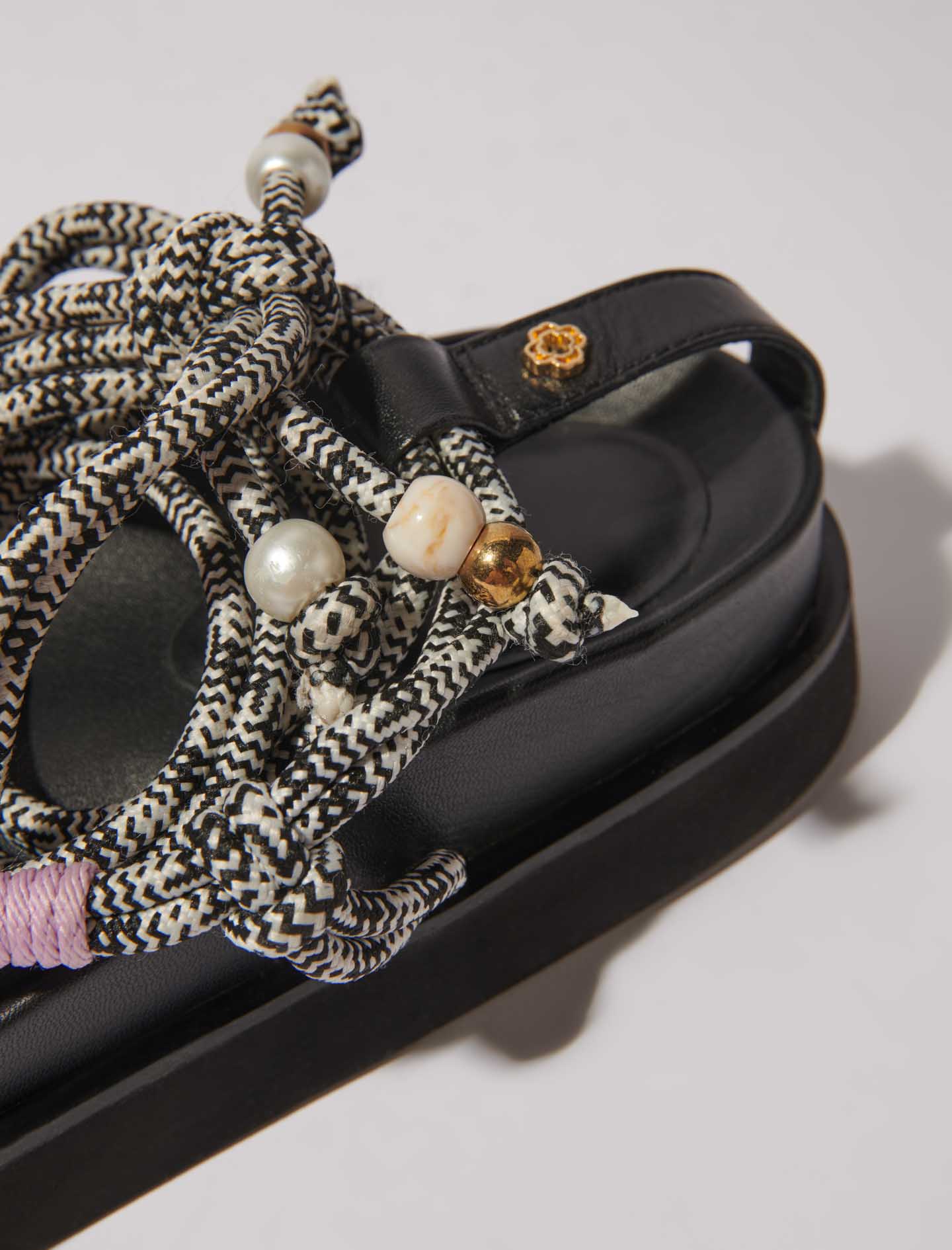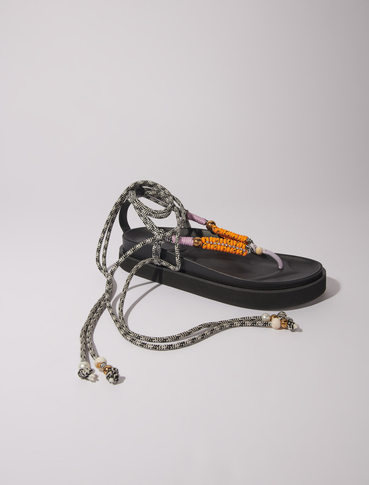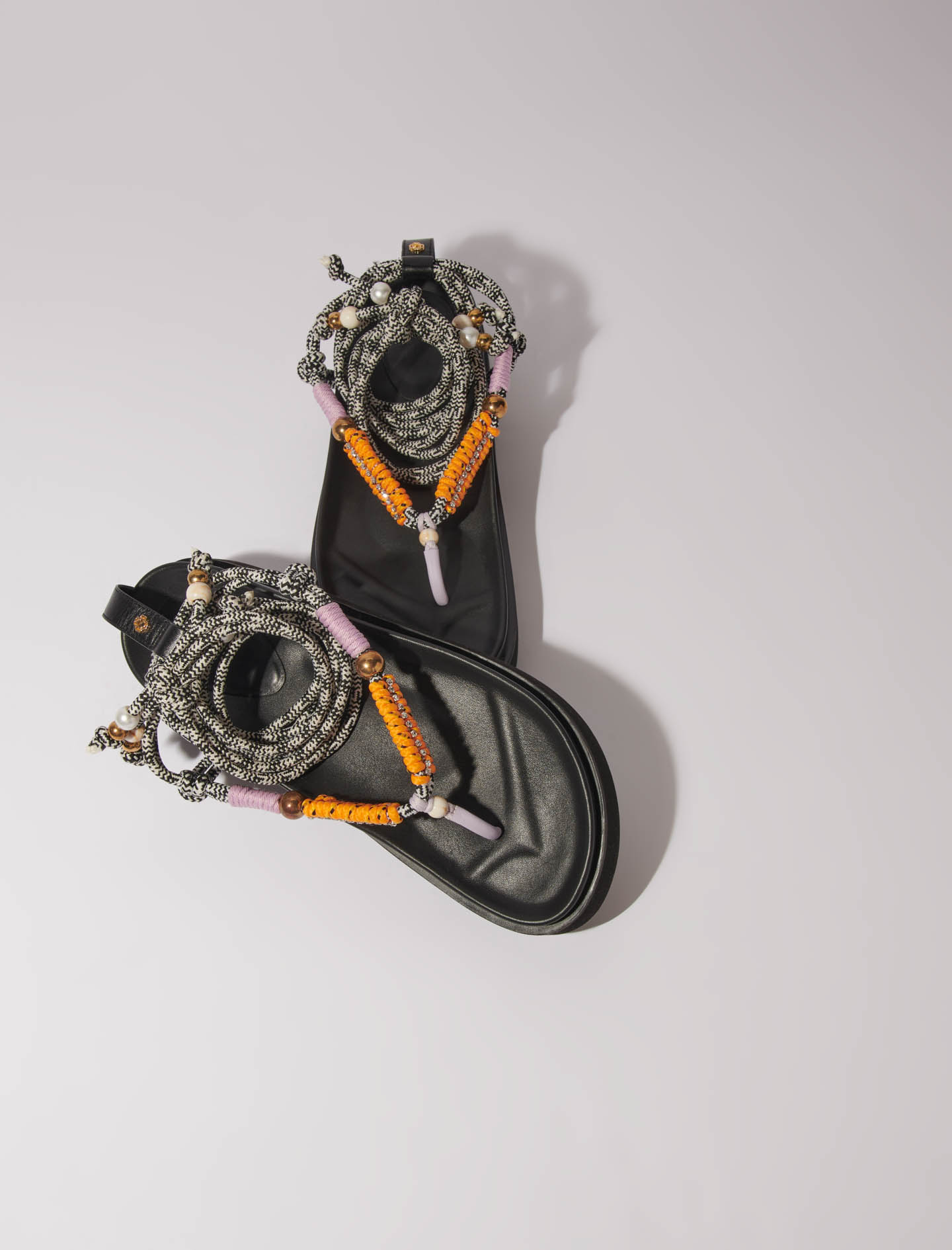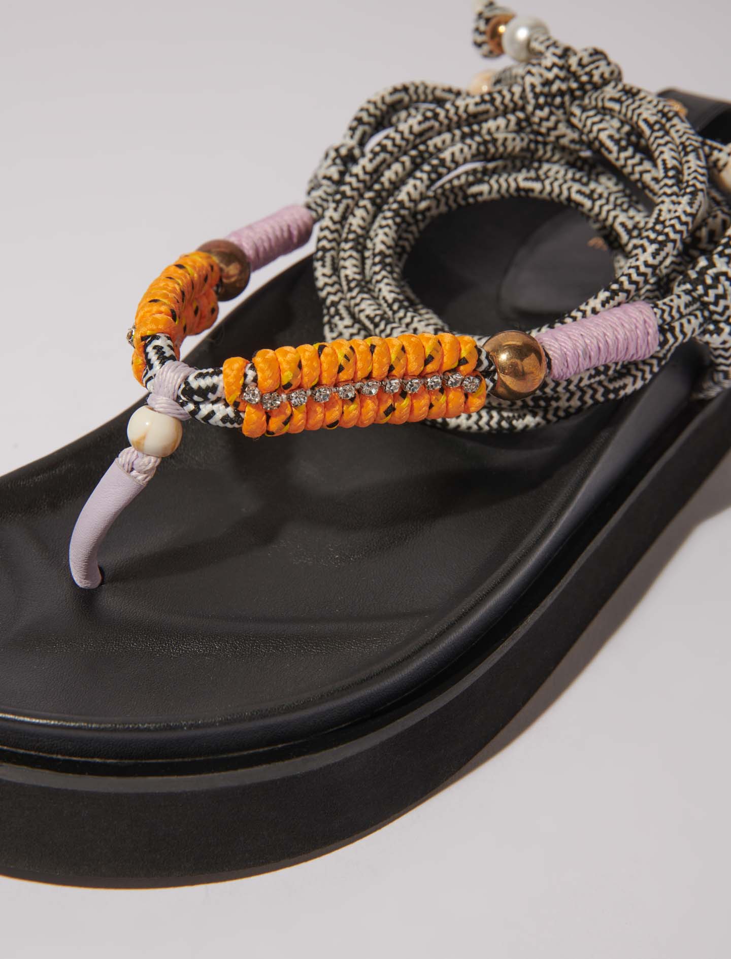 Featuring a braided strap between the toes in contrasting colours, they are embellished with rope ties that gracefully emphasise the ankle.