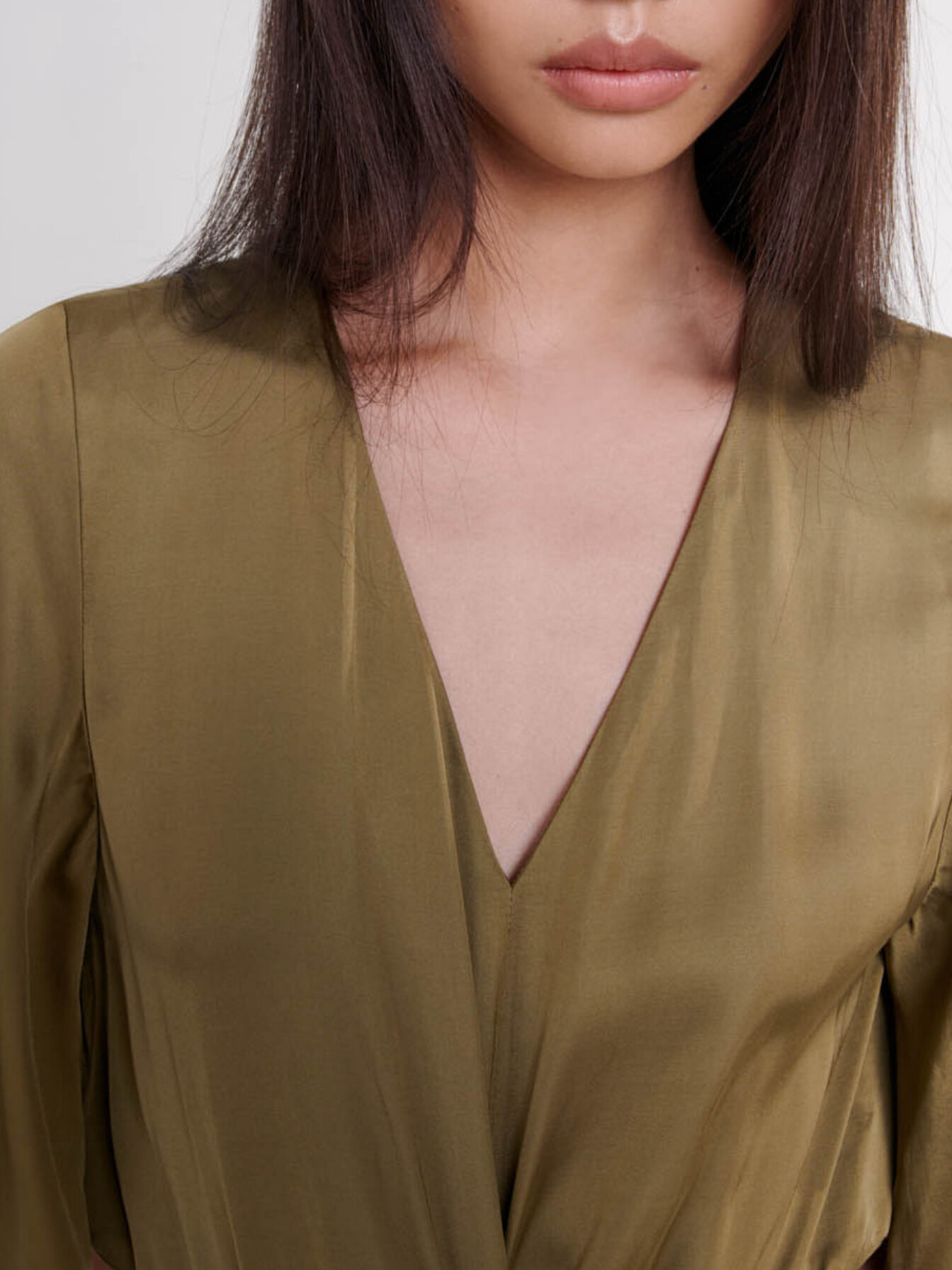 Alongside the alluring V-neckline, it features a wrap design at the back and a zip fastening.