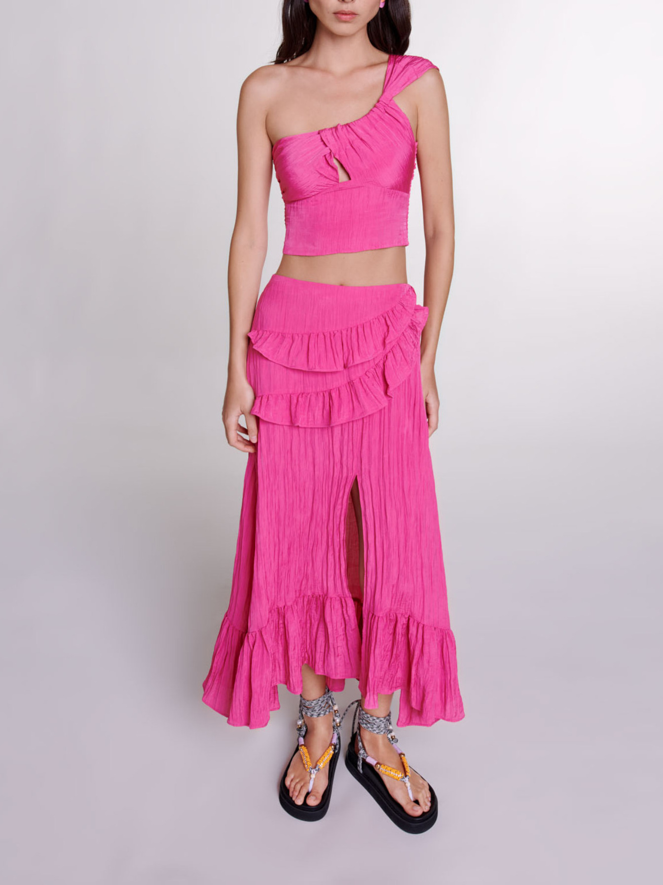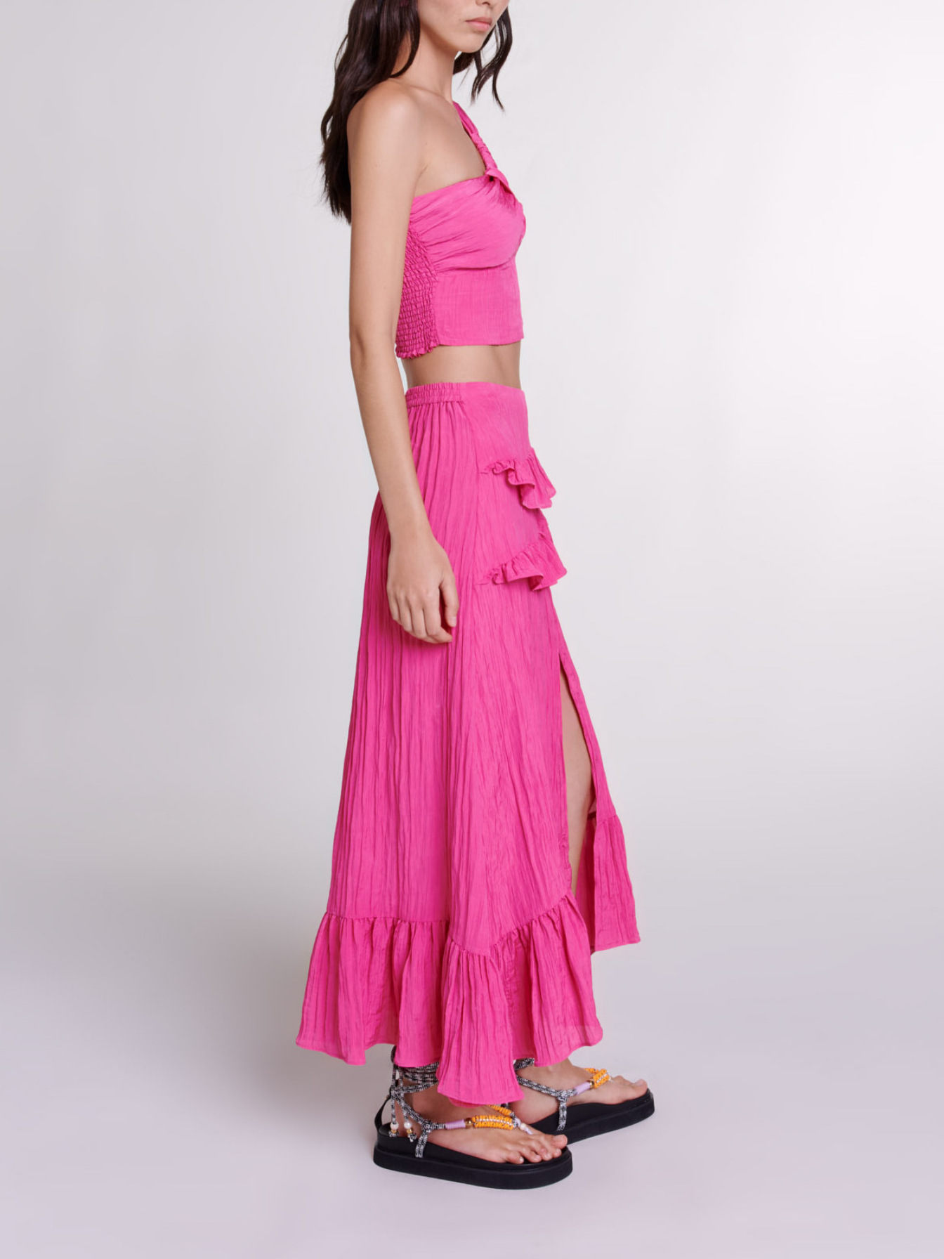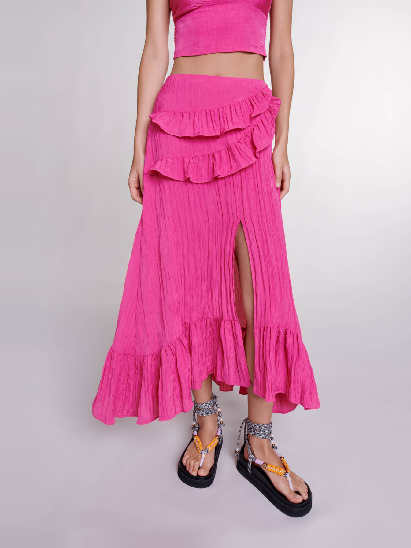Ruffled maxi skirt Crinkled satin effect Front slit.