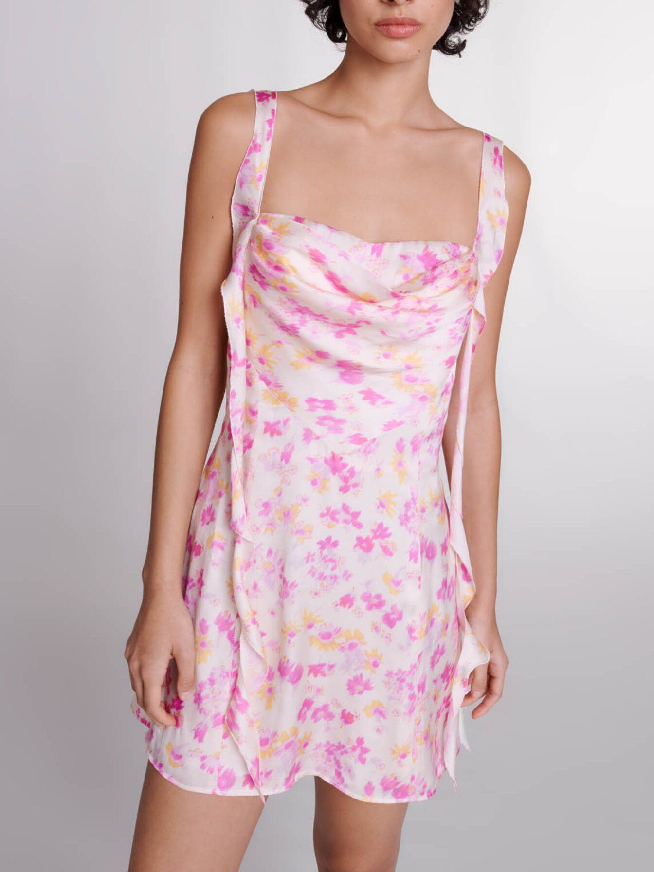 Featuring a floral print in romantic, pastel shades, this short dress in a floaty, satin-effect fabric exudes elegance and lightness.