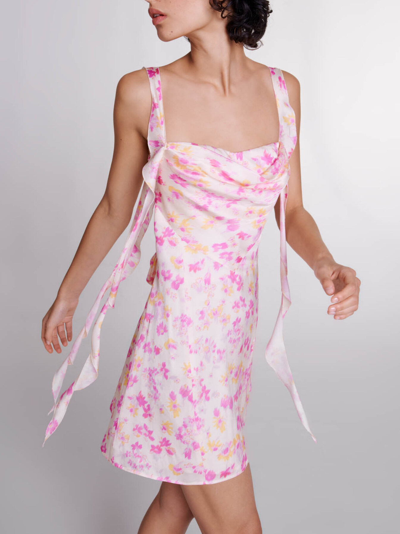 Floaty satin-effect dress Floral pattern Open back with ties.
