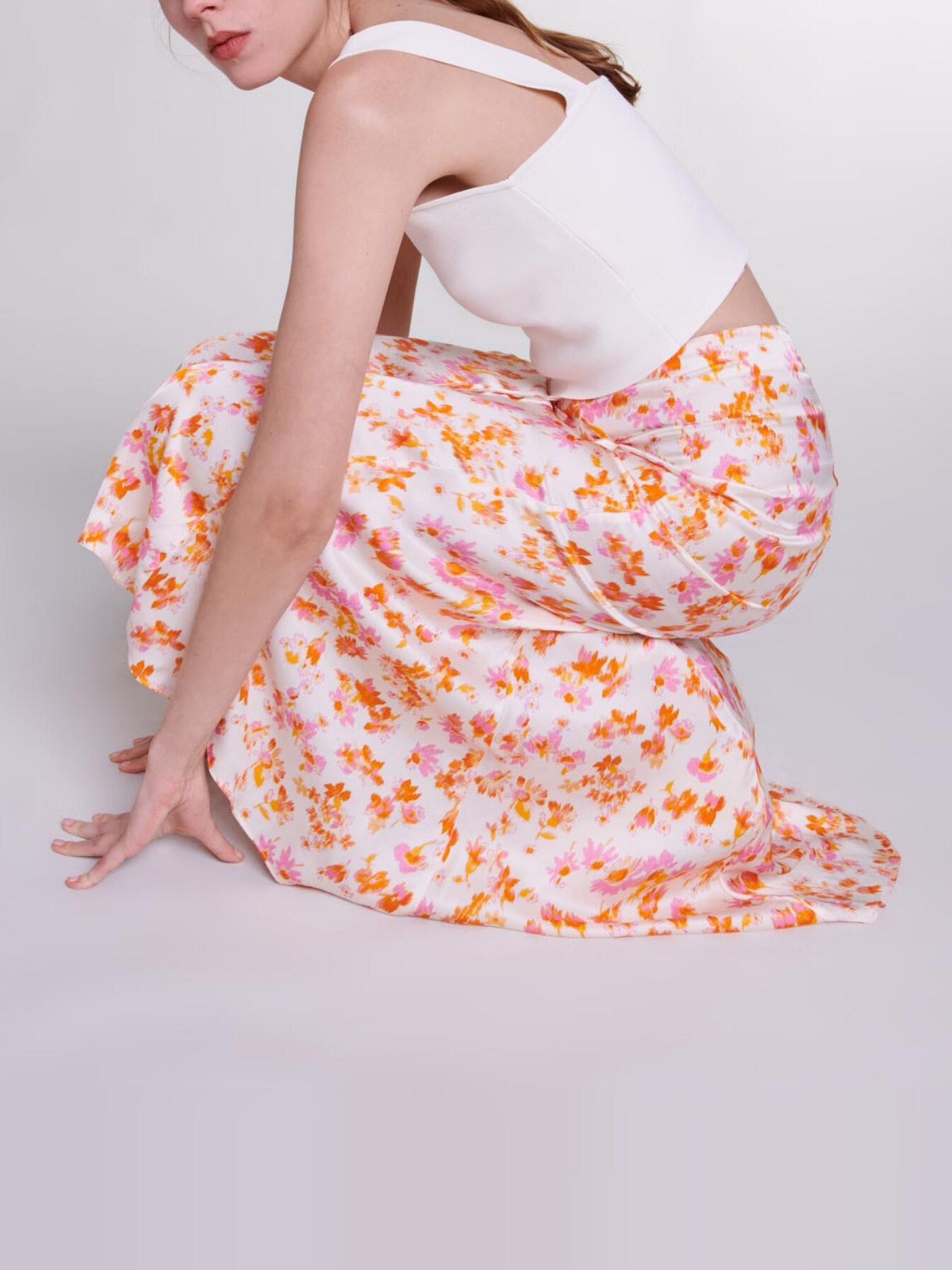 This season, opt for a floral pattern in shades of pink and orange with this satin-effect floaty skirt.