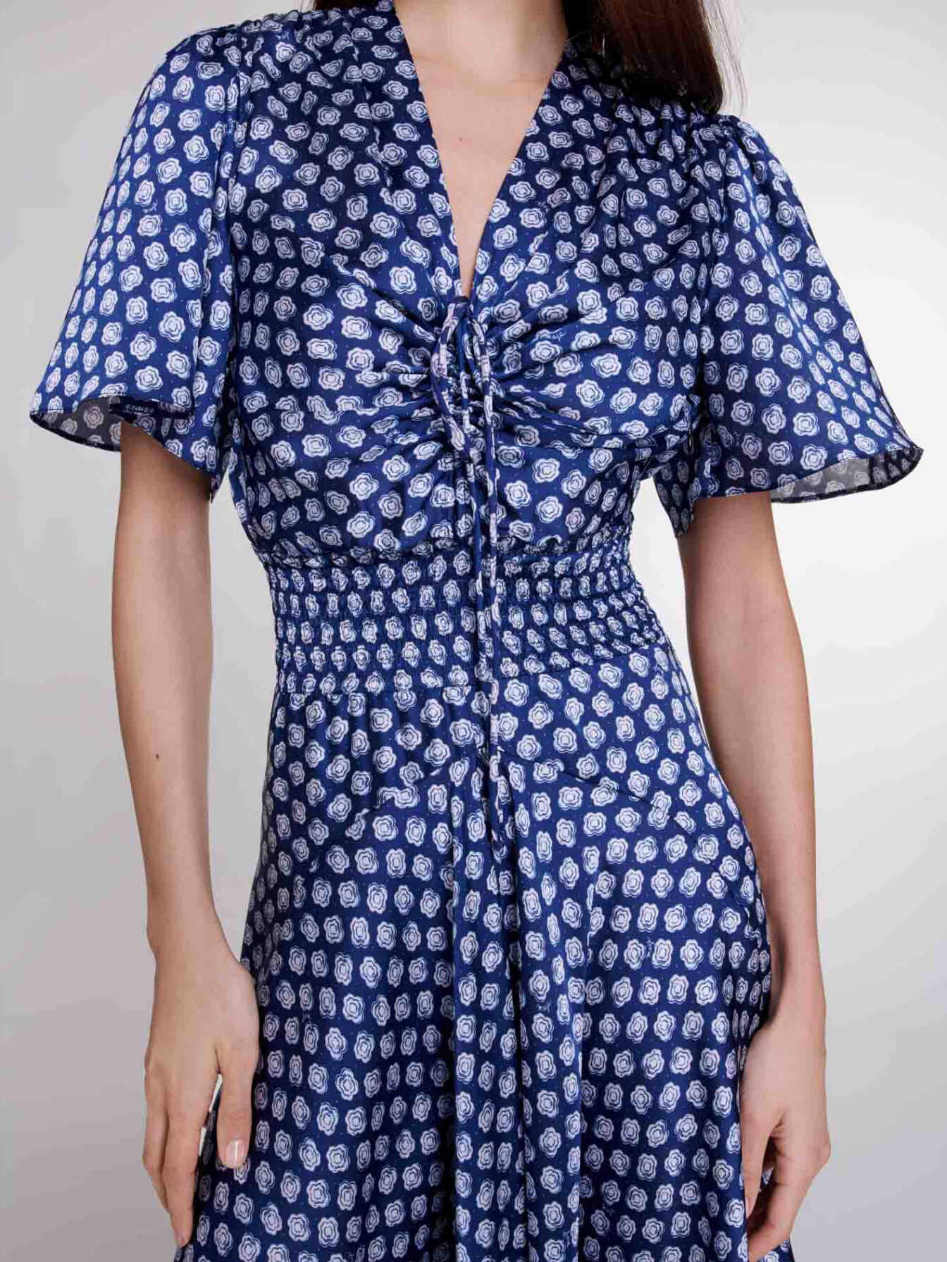 Alongside a side zip fastening and a smocked waistband, it boasts a plunging neckline embellished with drawstrings, creating an interplay of gathers at the front.