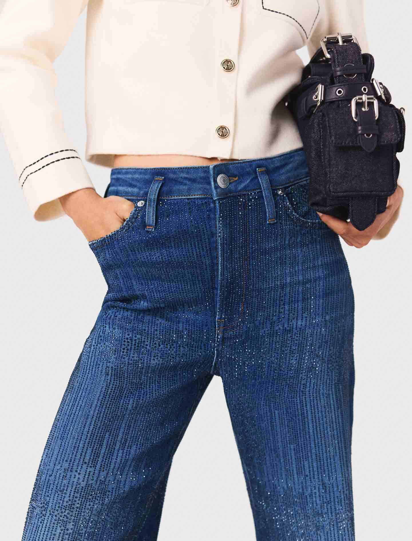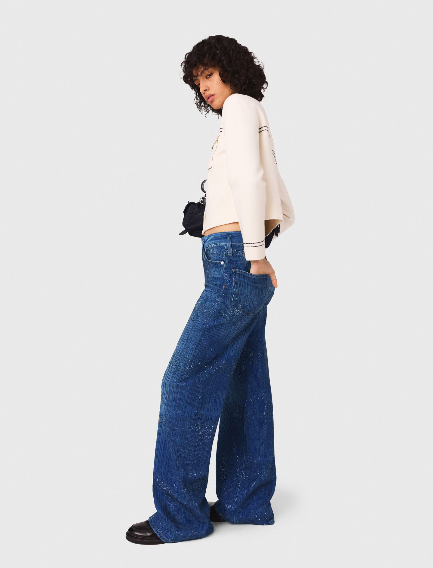 Wide-leg jeans Rhinestones in stripes Belt loops Zip and button fastening 5 pockets Jacron Contrast topstitching.
