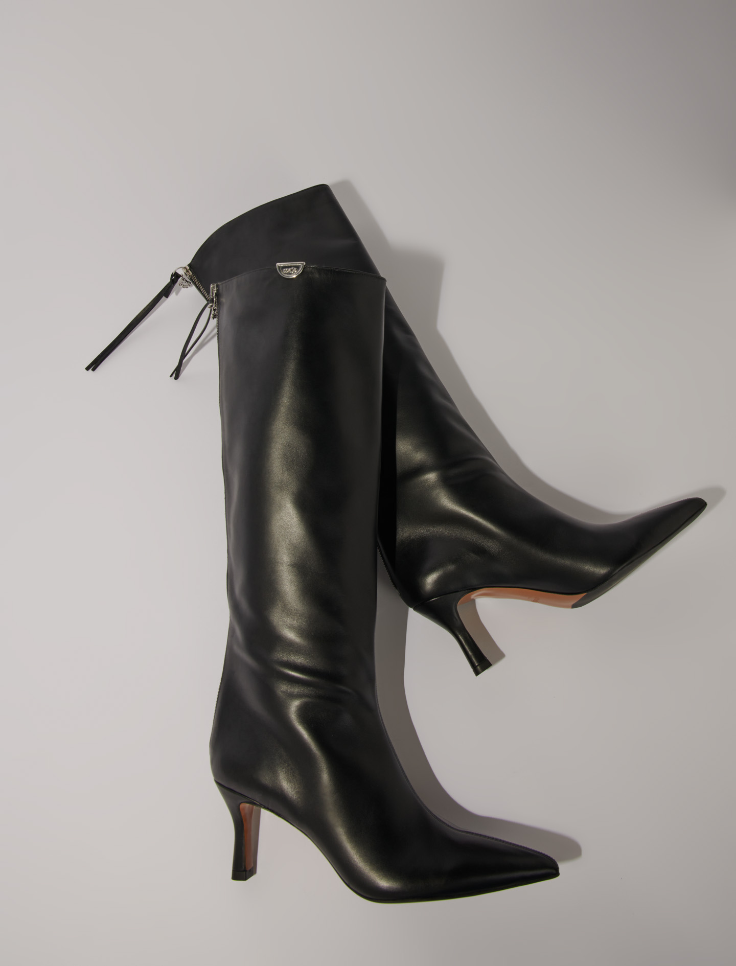 Plain leather boots Pointed toes Maje engraved badges at the tops Leather pull tab with Clover charm Zip fastening at back Heel height: