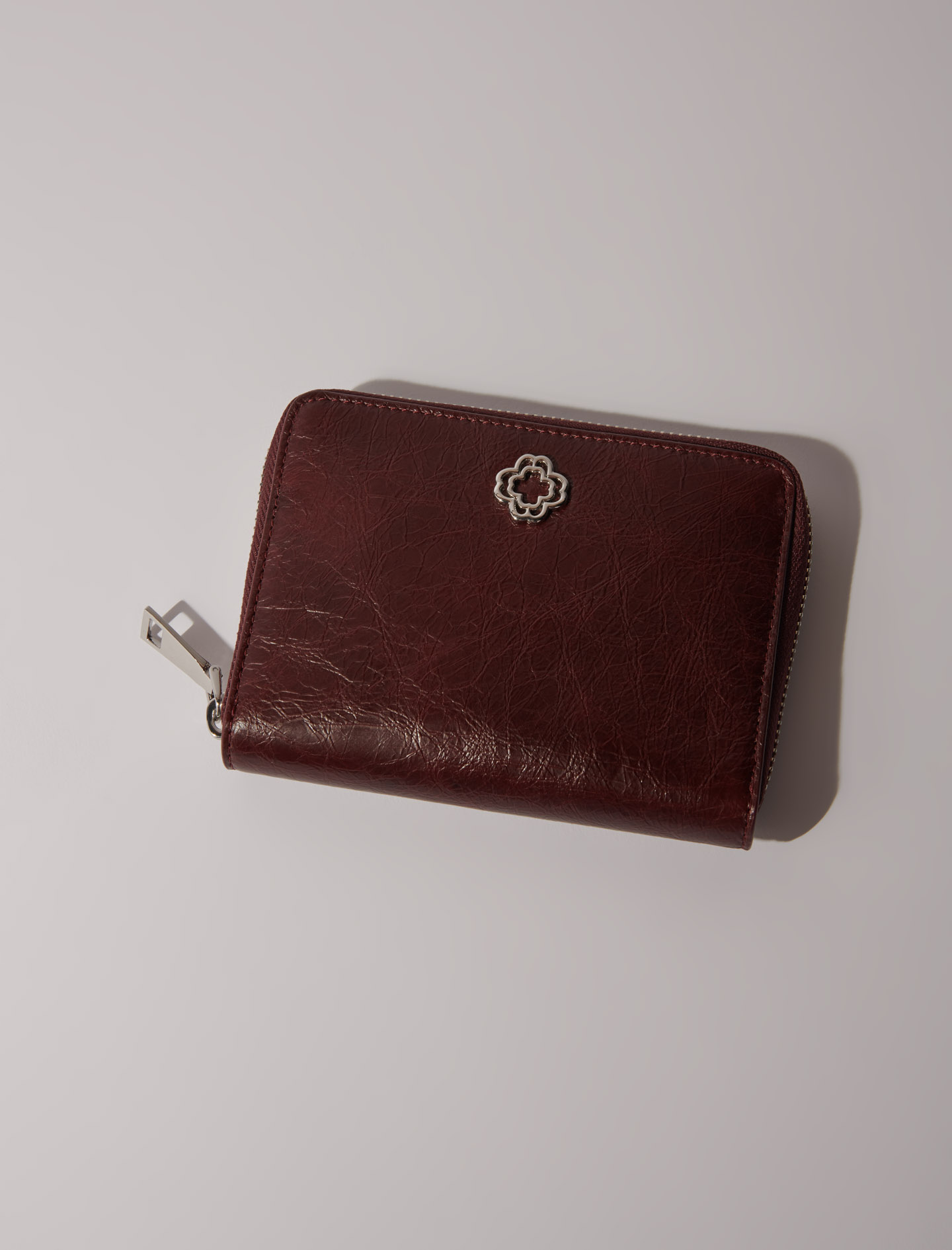 Crackled leather wallet Card compartments Inside zipped pocket Zip fastening Gold Clover logo.