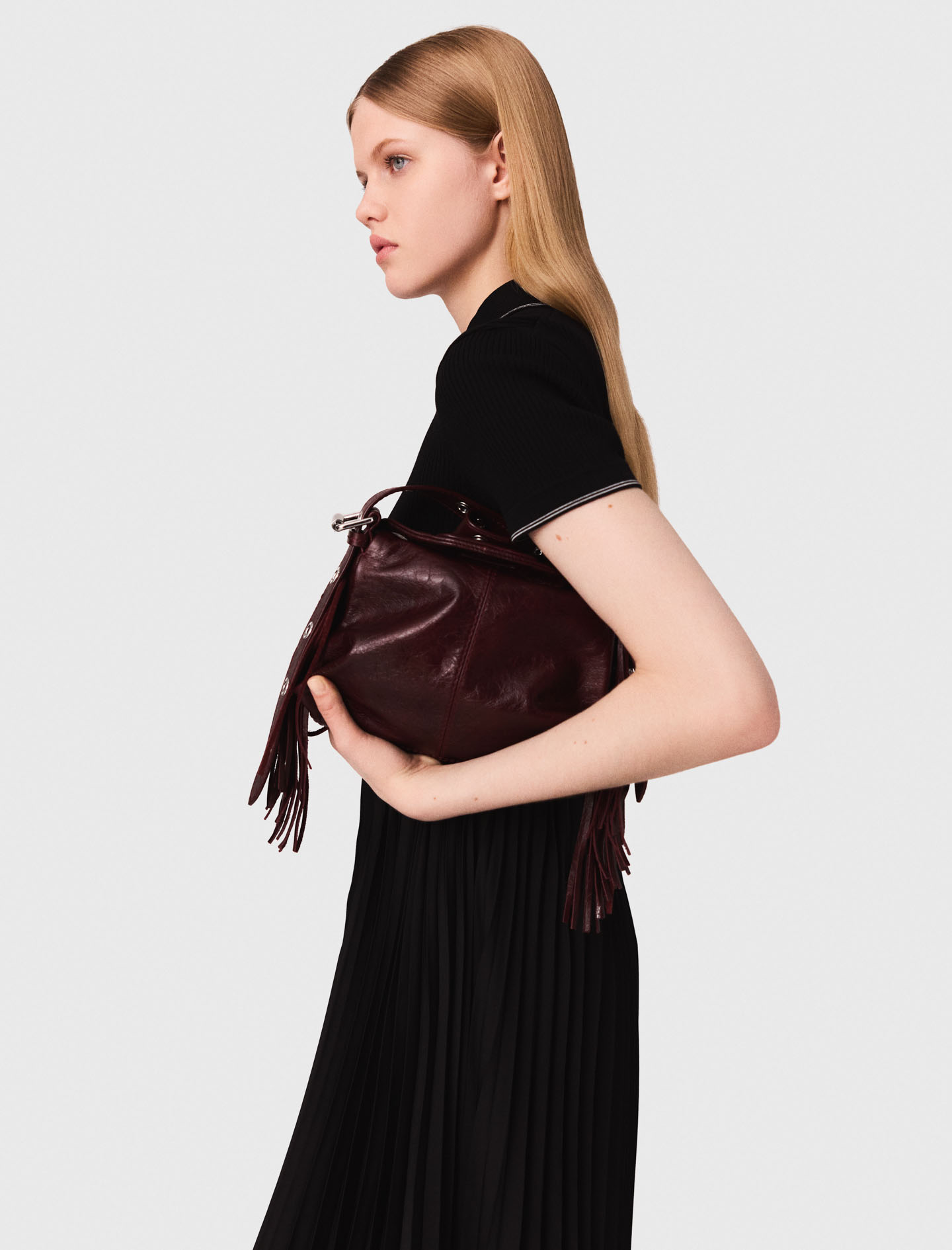 a fringed bag and square-toed ballet flats for a style that is both casual and refined..