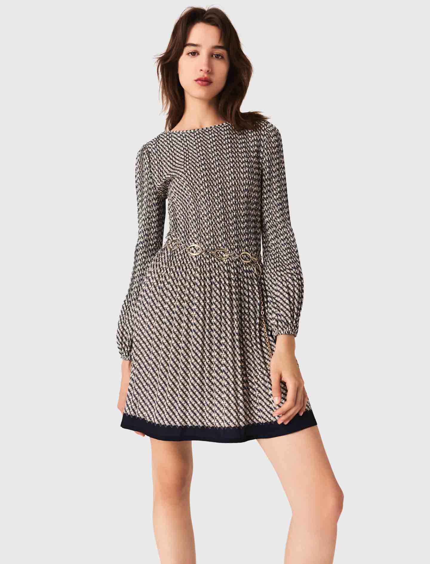 Maje polyester Printed chiffon pleated dress Round neck and voluminous long sleeves Smocked effect on top and contrasting trim at the bottom Designed for a standard fit The collection invites a light and graphic femininity, driven by plays on volume and signature prints.