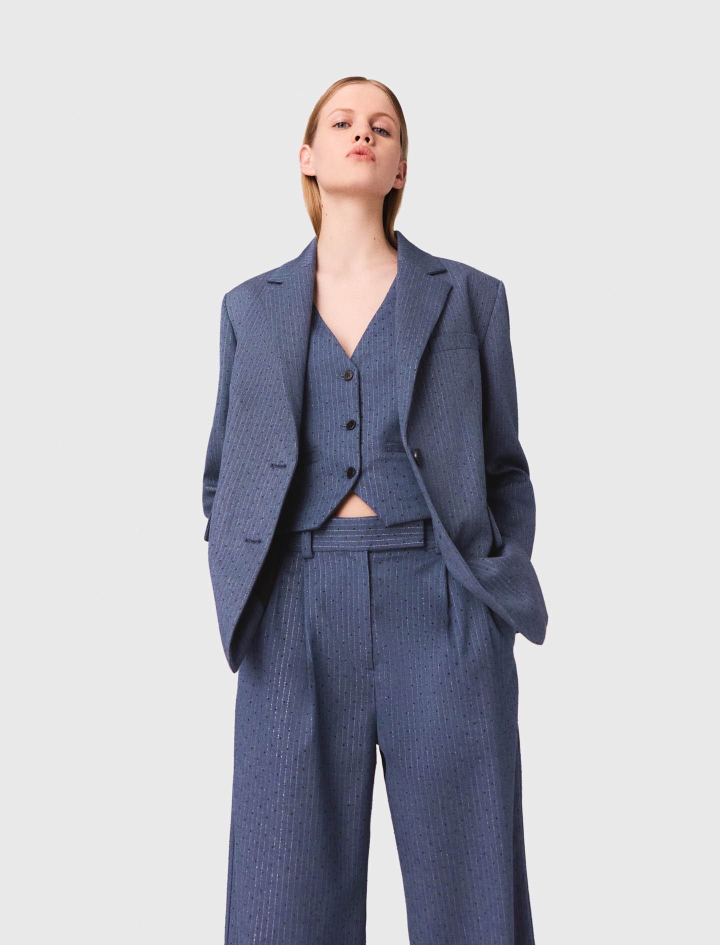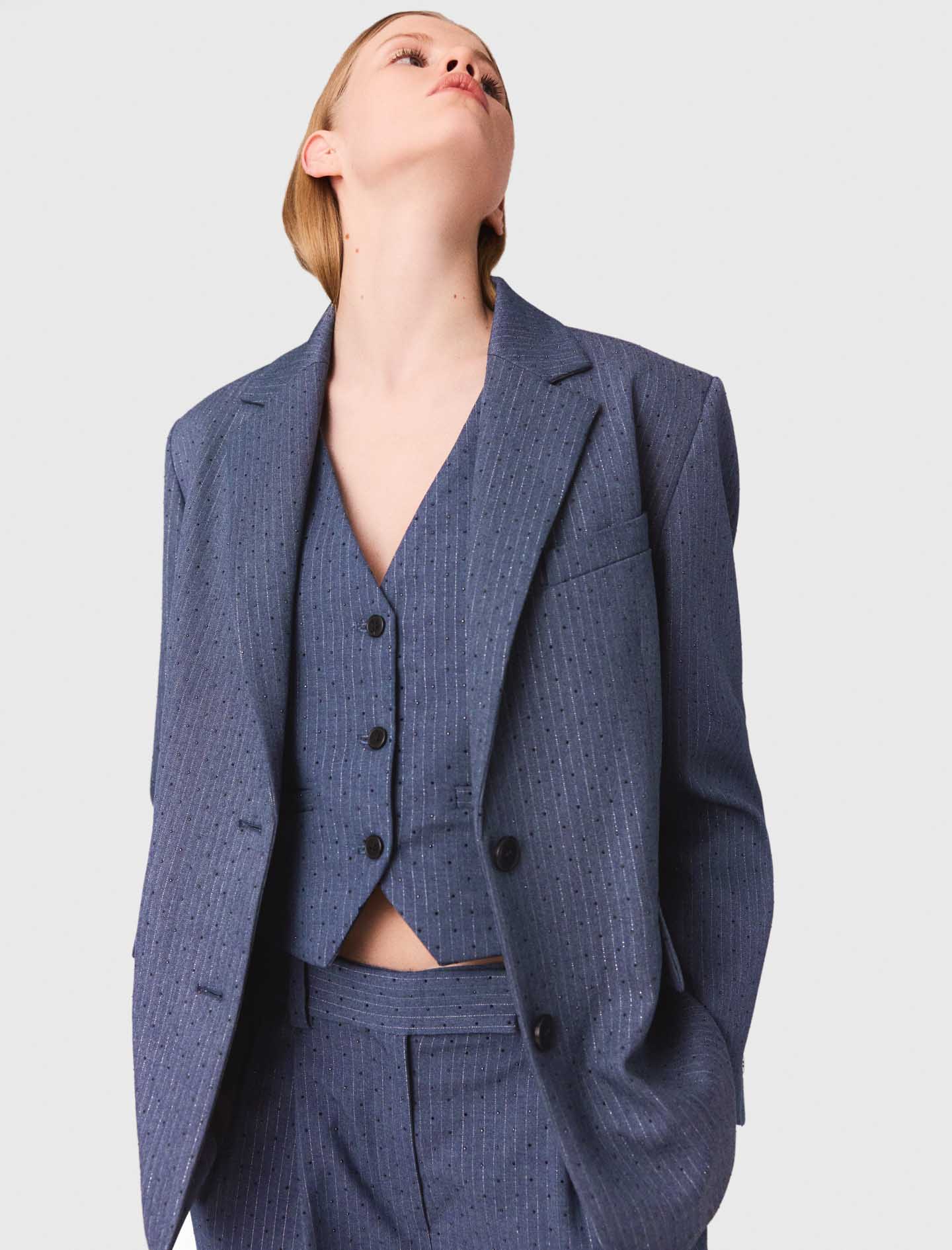 Maje polyester Striped suit jacket with rhinestones Lapel collar and button fastening Flap pockets and welt chest pocket Designed for a boxy fit The collection explores graphic elegance by subtly revisiting the codes of the suit.