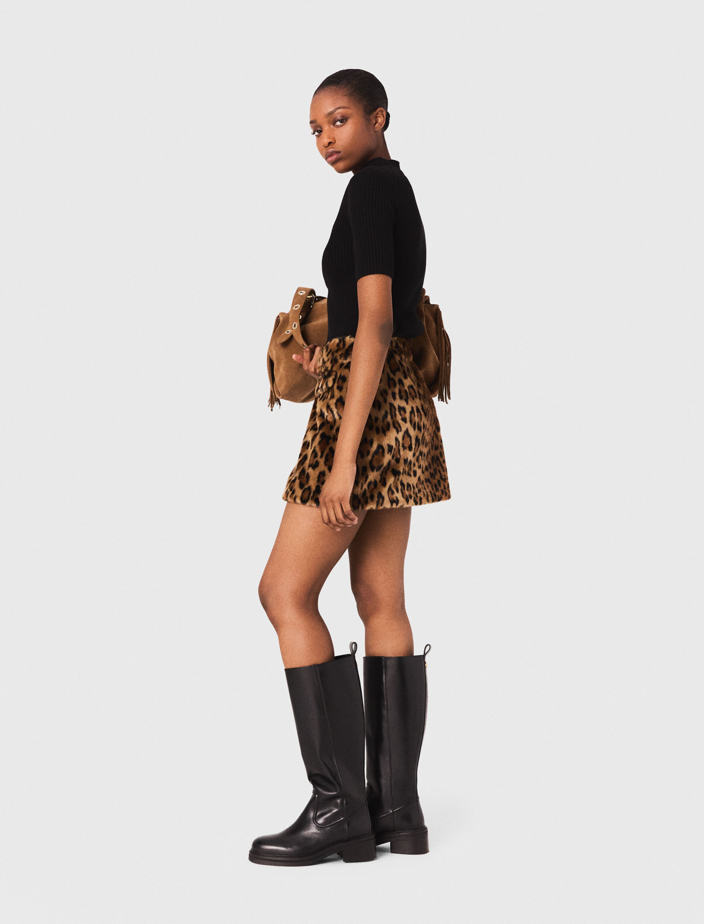 This mini skirt in faux fur with leopard print adds a touch of texture and character to the wardrobe.