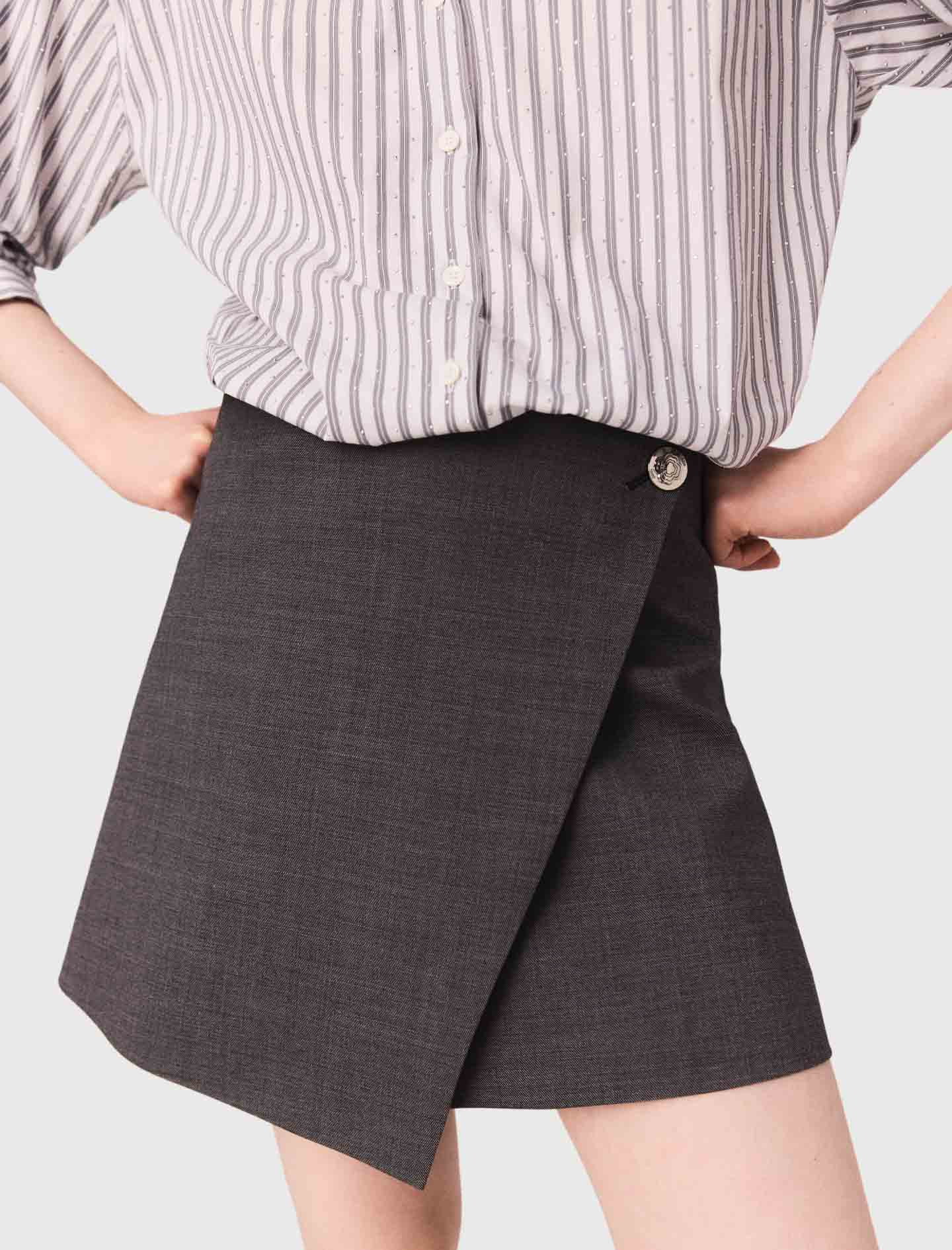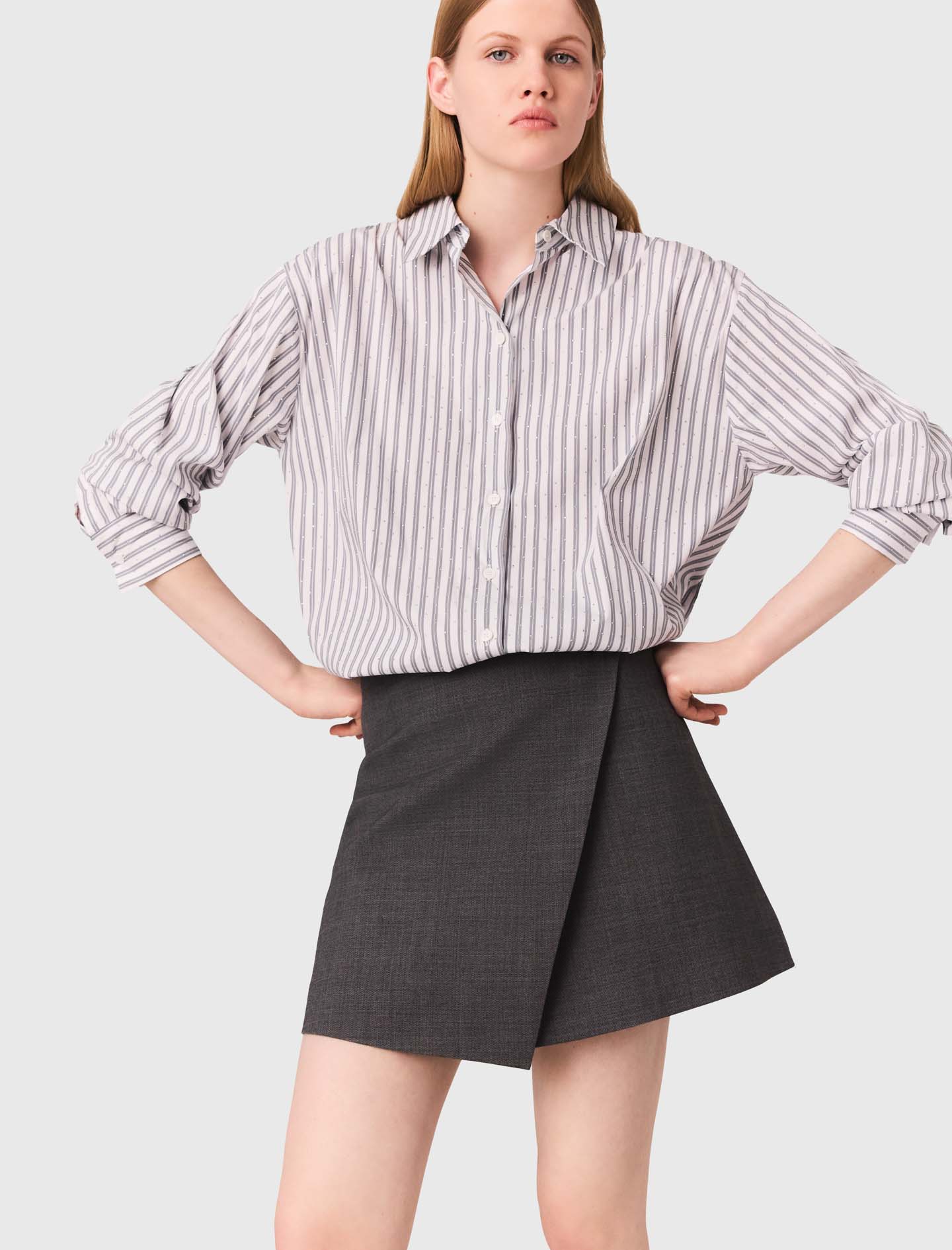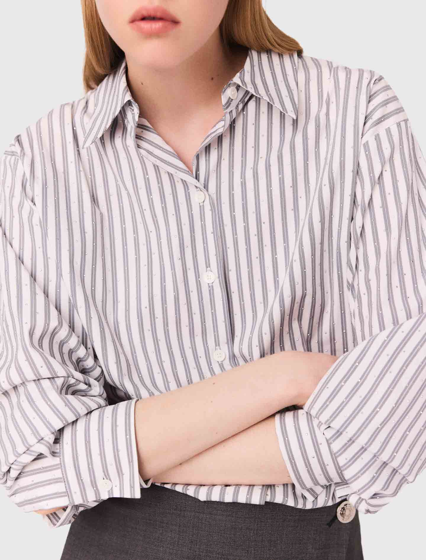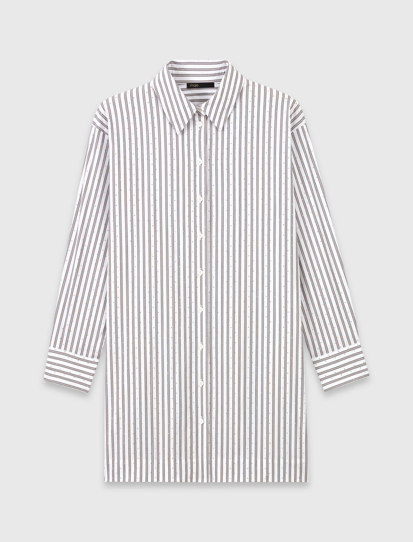 1 striped shirt dress with rhinestones Shirt collar and long sleeves with buttoned cuffs Removable skirt with asymmetrical panel and Clover button Designed for a boxy fit The collection explores the contrasts between light and structure, with hybrid pieces designed to play with styles.
