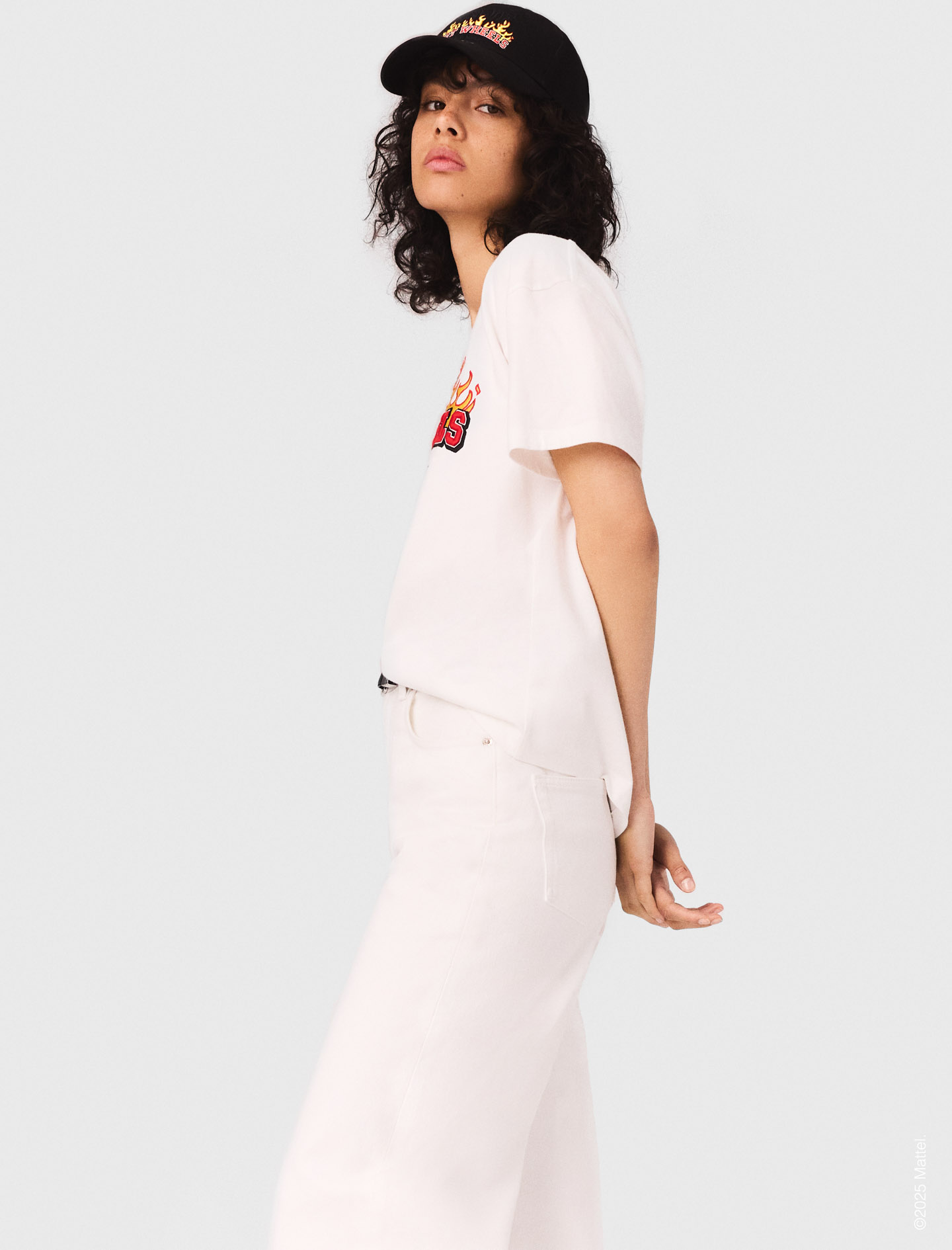 Maje cotton Hot Wheels™ x Maje T-shirt Short-sleeved and round-neck Flame embroidery on front Clover embroidery on back Designed for a loose fit Hot Wheels™ x Maje This summer, Maje is teaming up with Hot Wheels™, the iconic miniature car brand and pop culture phenomenon.Parisian elegance meets racetrack energy in a collection of assertive femininity, where wardrobe essentials are inspired by motorsport themes to instil a new attitude..