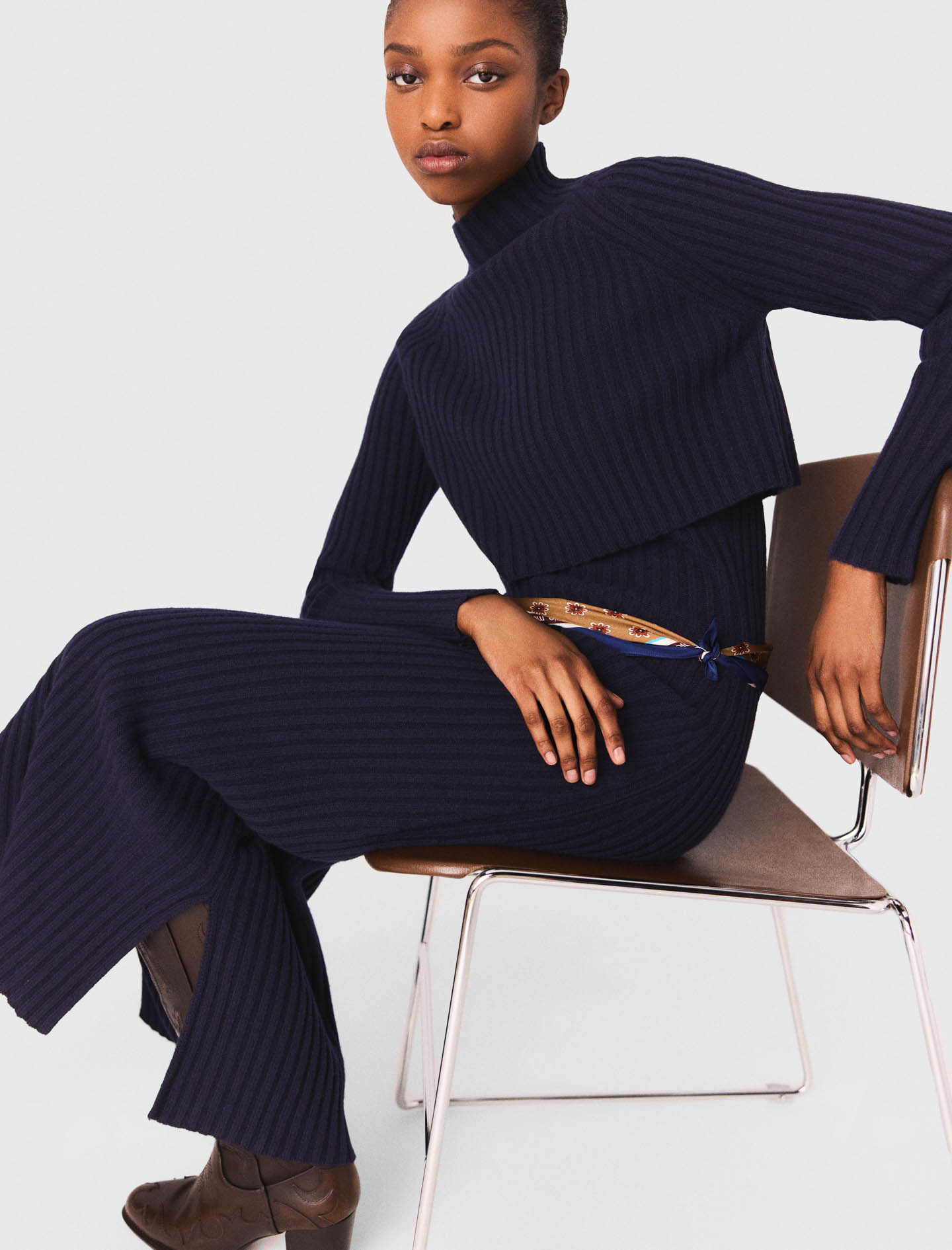 1 effect creates a graphic contrast between the structured jumper and the fluid skirt..