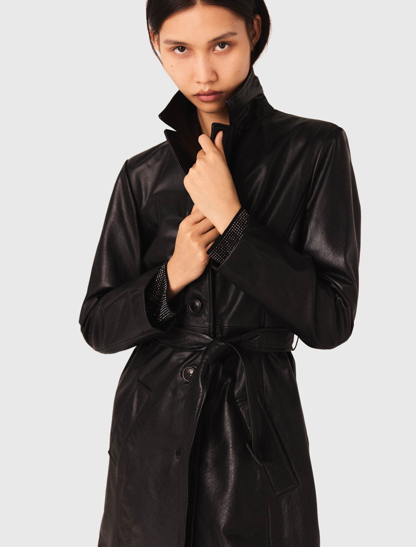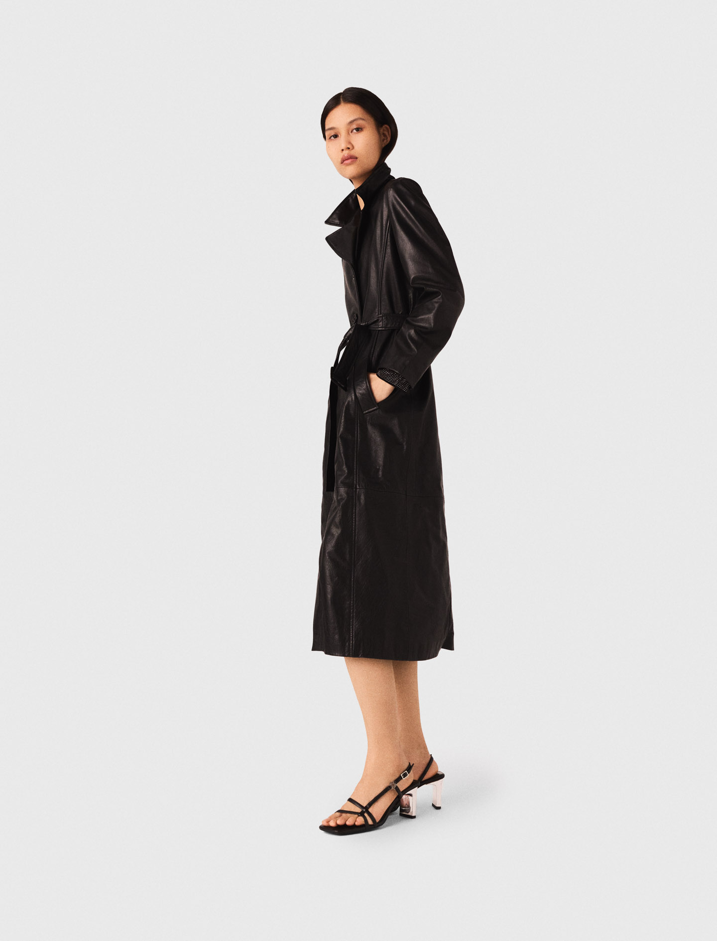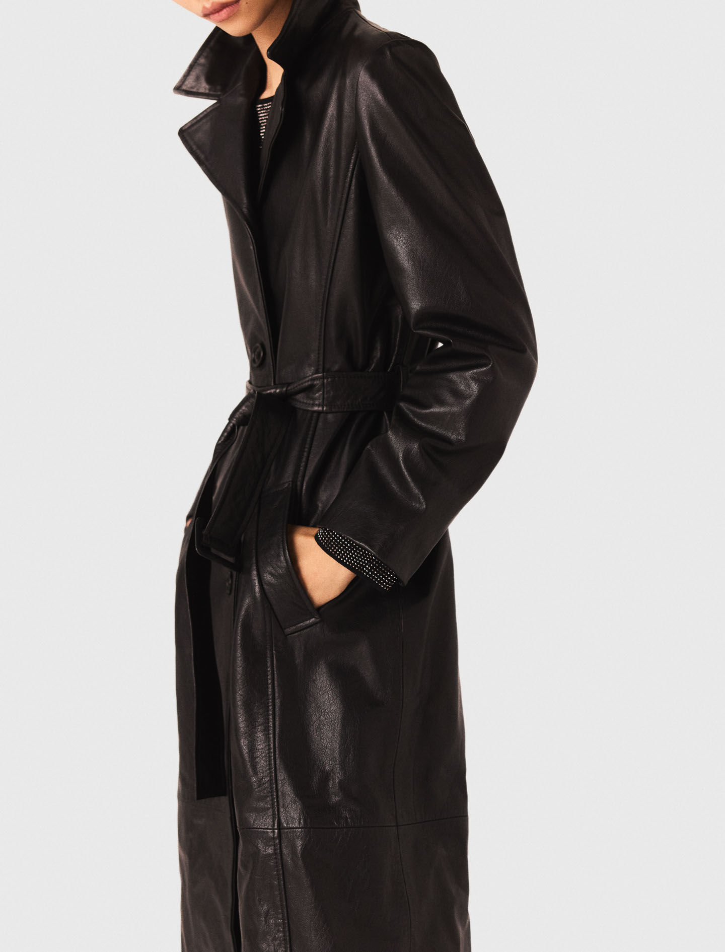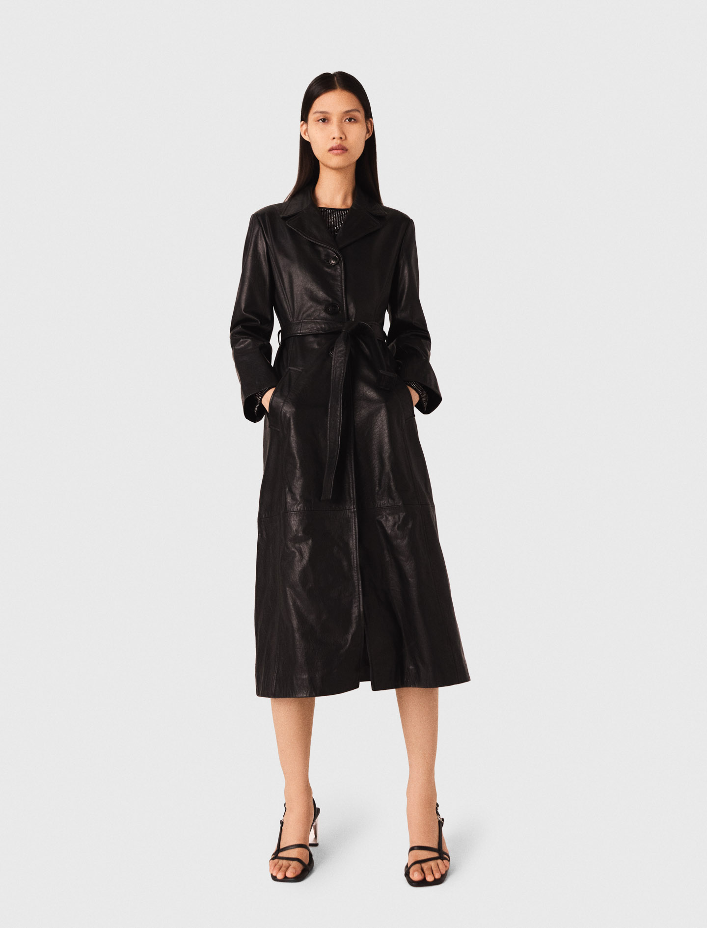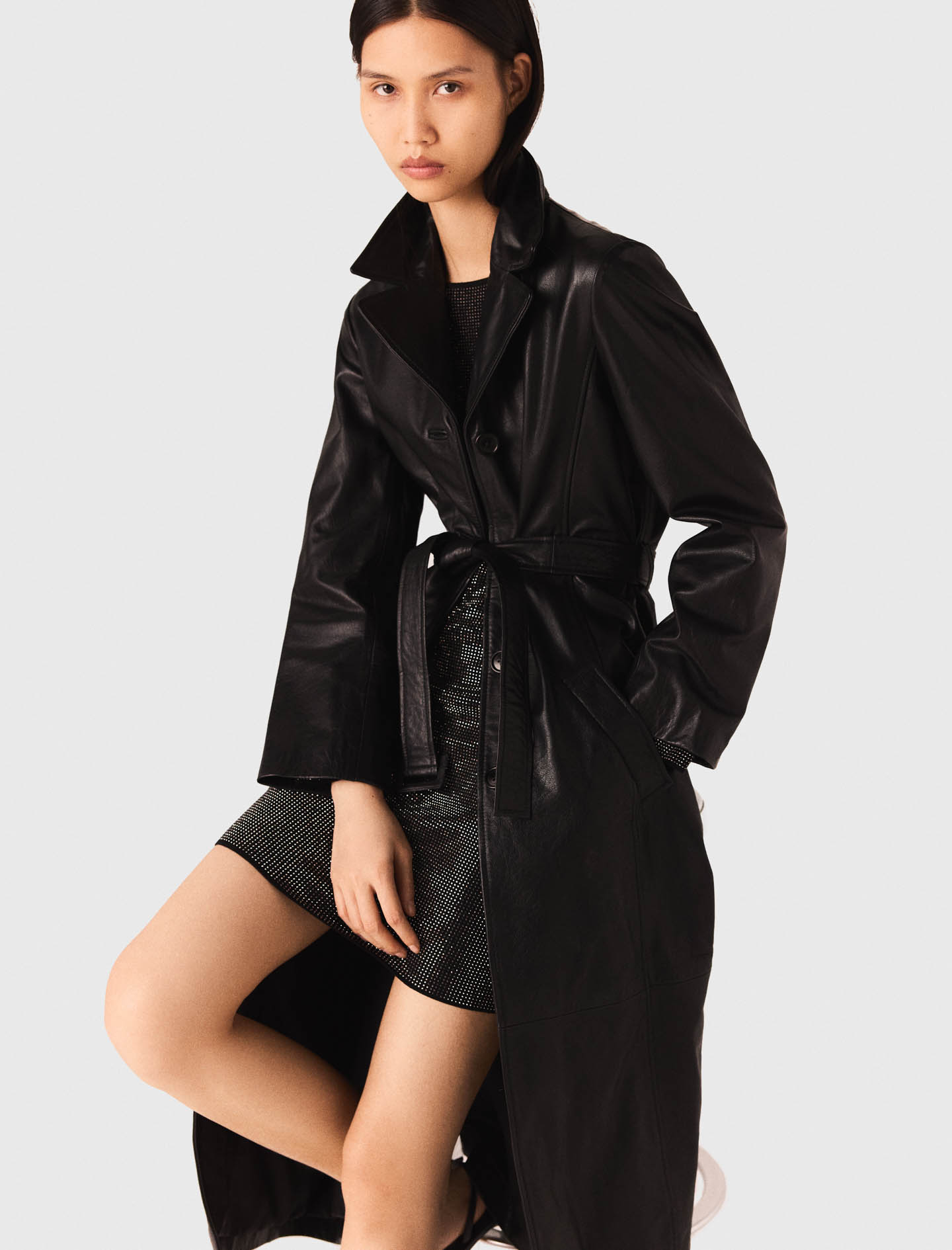 Maje buffalo Long leather trench coat Lapel collar and button fastening Removable waist belt Satin lining and side pockets Designed for a tailored fit The essentials of tailoring are reinvented in bold materials.